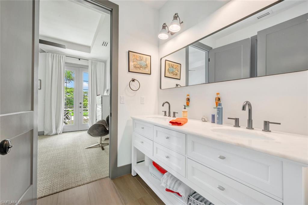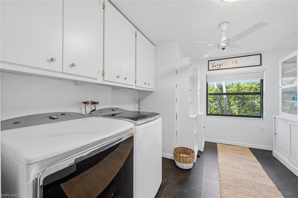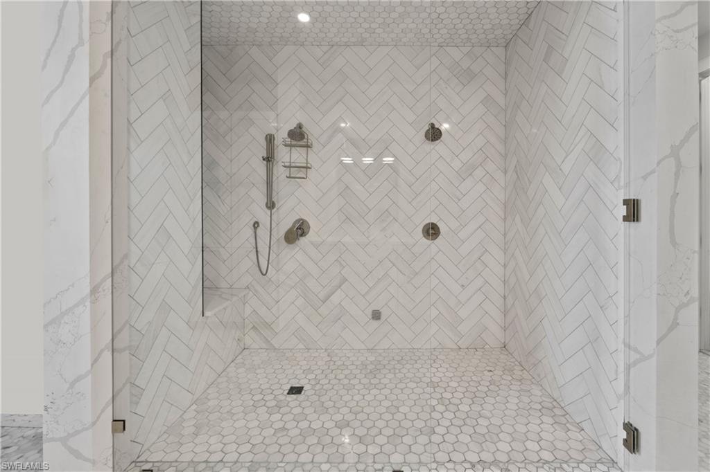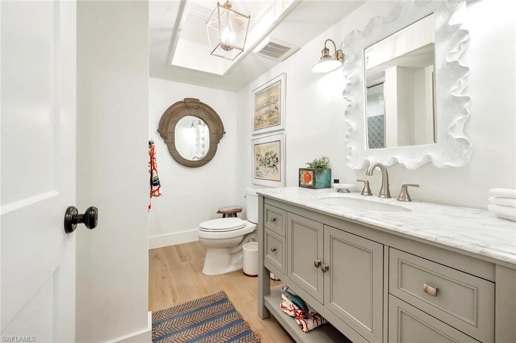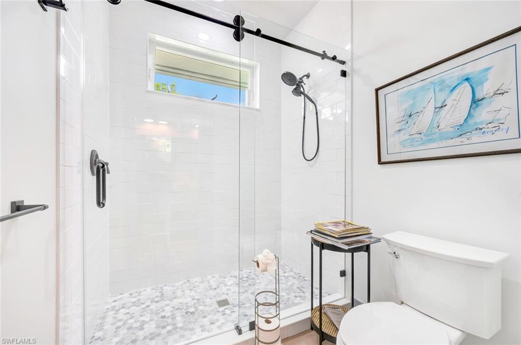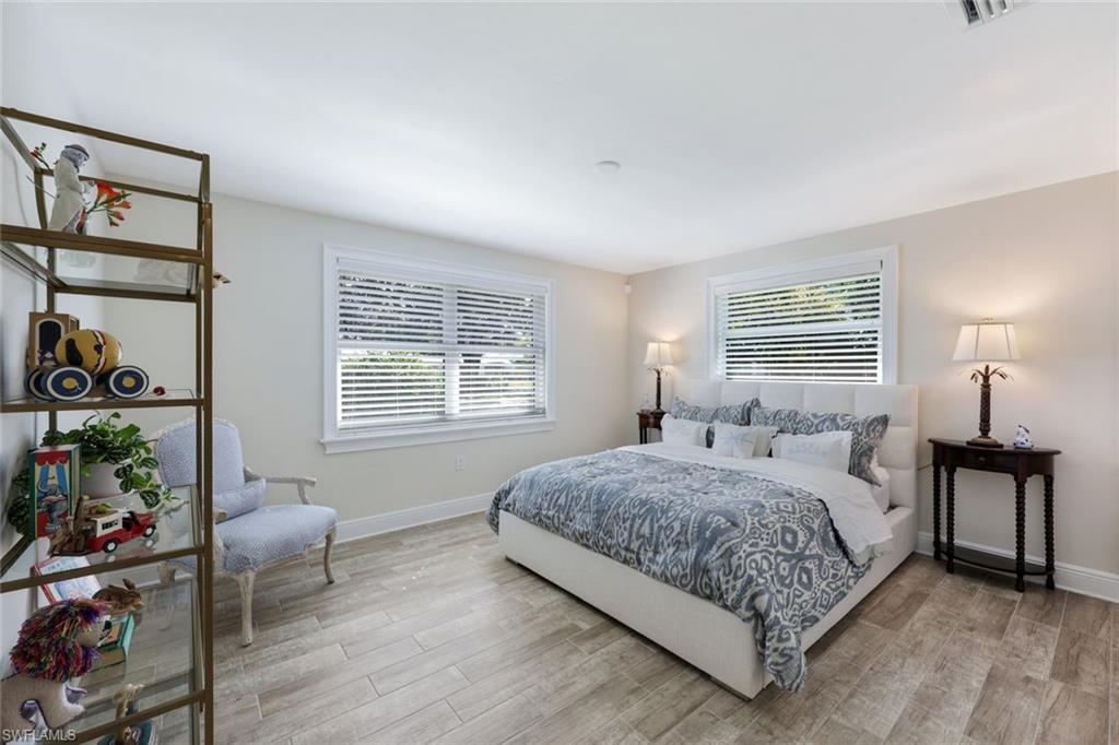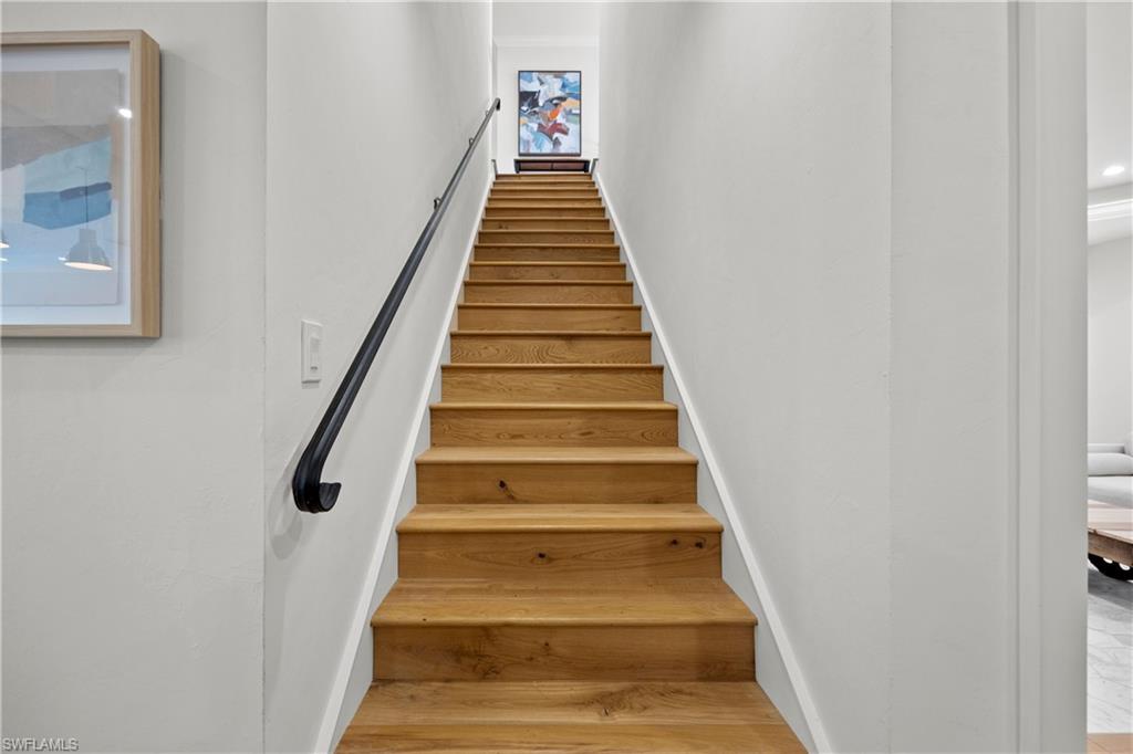 Gorgeous completely renovated home including a new roof and hurricane windows with sweeping east and west golf course views located in the heart of Naples. This coastal theme home exudes effortless style with all of the fine details; the living room displays a beautiful, coffered ceiling and fireplace, a formal dining room with a nearby wine room, and a chef's kitchen with a large island for the family to gather. The home boasts 5 bedrooms and 3 full bathrooms; a spacious layout with an abundance of natural light. The first-floor master bedroom has 2 large closets; hers opens up to the lanai. The second guest bedroom is ensuite on the first floor with a nearby office convertible to a bedroom. Upstairs, there is a cozy loft sitting area, accompanied by two bedrooms and a shared Jack/Jill bathroom. Outdoor living is elevated with a screened lanai showcasing a pool with a swim-up table, fenced yard and a separate patio area with a raised hot tub and grill. Just minutes to the beach, fine dining, and shopping. This neighborhood is a true hidden gem of Naples.