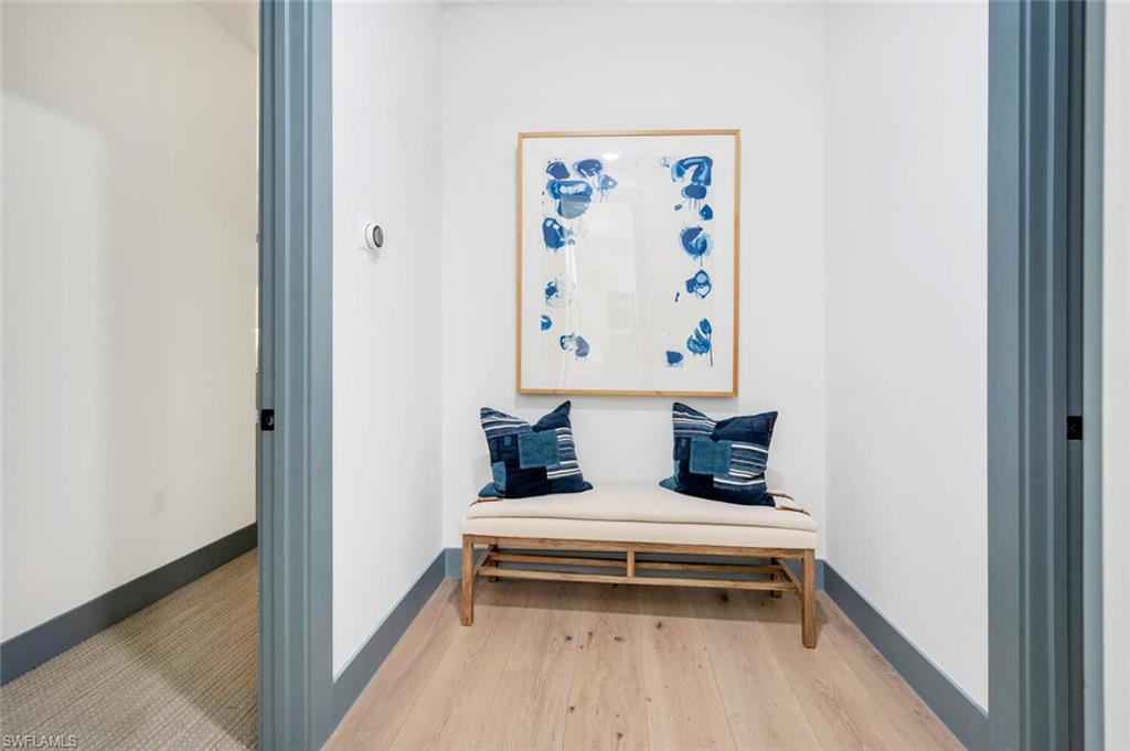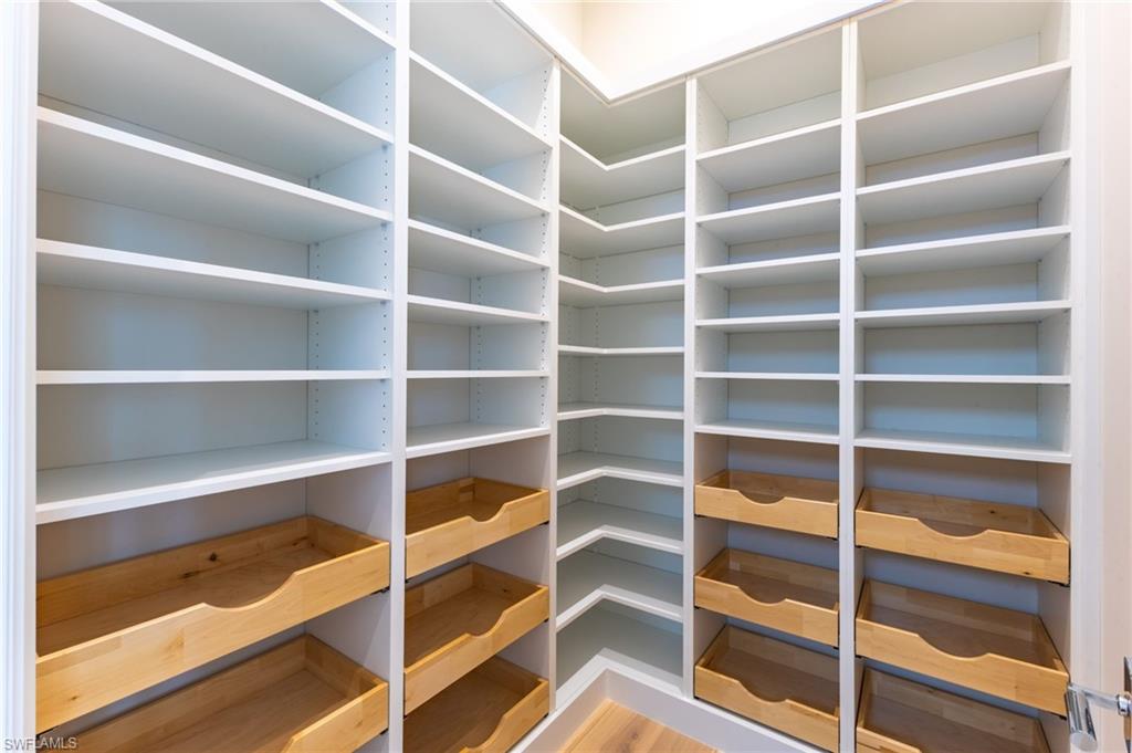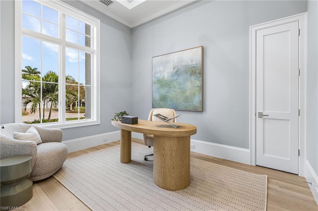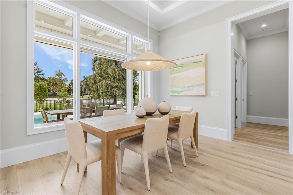 This hidden gem is centered in the heart of Naples within the coveted community of Big Cypress. It's rare to find newer construction just one mile from The Waterside Shops. Impressive ceiling heights and panoramic golf course views welcome you into this recently completed luxury home crafted by Borelli Construction. Inside you'll find the high-end finishes you expect from Borelli including custom closets, extensive trim work, detailed ceilings, as well as beautiful French white oak wood flooring and Anderson impact windows. Exquisite style abounds in this professionally decorated home that has been meticulously designed, painted and enhanced with custom window treatments and tasteful feature walls. The great-room floor plan showcases a living and dining area with beautifully coffered ceilings and luxurious window panels that frame the views onto the expansive lanai. The adjacent and well-designed kitchen is centered around a large island of quartz with a natural look. Shaker-style solid wood cabinetry and a separate pantry provide plenty of storage. Premium appliances include SubZero and Wolf, and a dual-zone wine cooler. The master suite features a spacious bedroom with sliding doors to the peaceful outdoor space. Closets are ample and the spa-like bathroom serene. The two guest bedrooms are generously sized with walk in closets and en-suite bathrooms. An additional office space, or bedroom, is located at the front of the home. The lanai is equipped with a full outdoor kitchen and plenty of room for entertaining. The heated salt-water pool and spa with sun-shelf complete the Florida lifestyle. A high-end pool enclosure with picture frame was just installed, framing the unobstructed golf course views. Custom exterior lighting, landscape improvements, a Sonos sound system, improved audio-visual equipment and garage enhancements that include built-in cabinetry, additional refrigerator and specialized flooring round out this stunning home. The community is perfectly situated in the heart of Naples with quick access to all the best in Naples beaches, shopping and dining. Social Awaiting Golf membership is available and allows for access to social activities and limited golf.