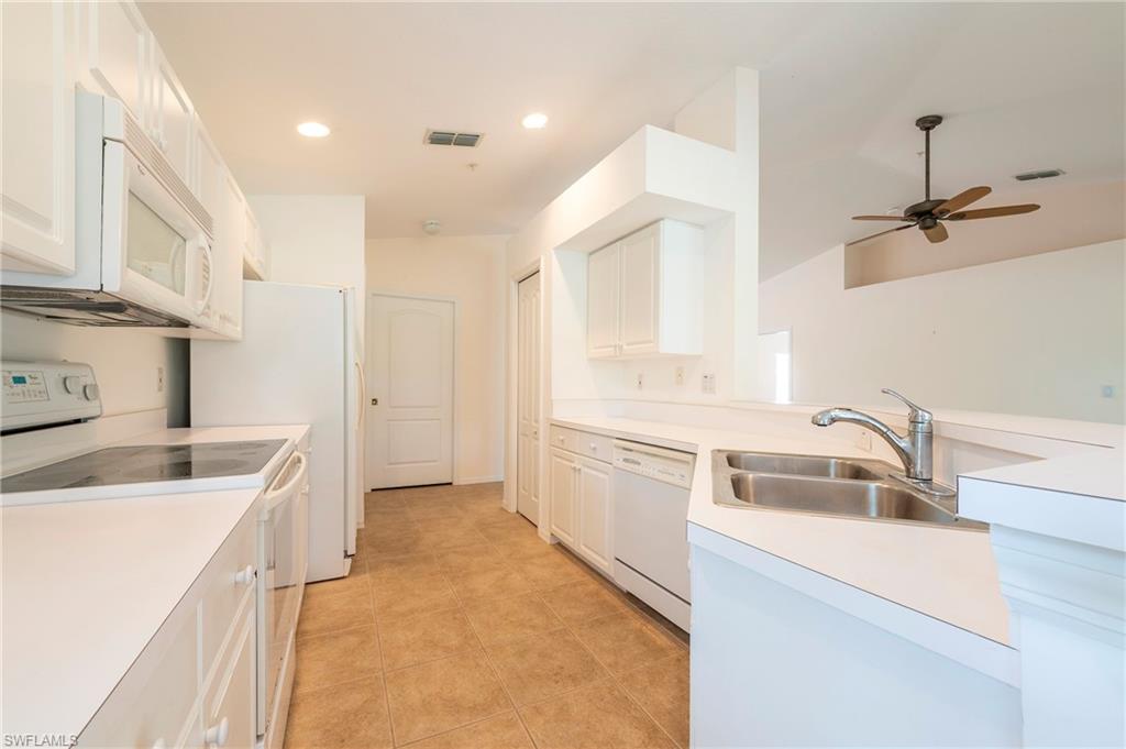Bright 1st floor end-unit in coach home with attached one car garage and Southwest facing views of lake in the lovely enclave of Dover Place in Briarwood. Flowing floor plan with 9 foot tray ceilings in living room open to dining and kitchen making for one central gathering location. The 3 bedrooms have LVP flooring while the gathering room sports all tile flooring. The master bath offers a deep soaking tub and separate shower with a generous sized double vanity. The third bedroom has a separate exterior entrance with French doors and private entrance into an adjoining fully updated new 2025 bathroom. Laundry in residence offers plenty of shelf storage and is already plumbed for utility sink. Watch breathtaking sunsets from the lanai and dining room, both protectively shaded by stunning live Oaks. The lanai features electric hurricane shutters while the windows have lockable accordion shutters all installed in 2018. All screens were replaced in July of 2023, new roof 2024. The garage has a Lift Master garage door opener, desirable epoxy floors installed in 2020, and a super convenient extra 10' x 4' storage space. The entire home has FPL surge protection.