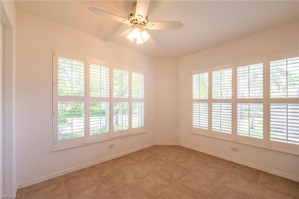 This is a stunning and rare one-story condo that lives like a villa, sharing only one wall for ultimate privacy. A spacious wraparound lanai with diagonal tile flooring offers breathtaking lake views with a serene water feature—accessible through two charming French doors. This end unit is set on an oversized lot, providing ample yard space between neighbors for privacy. Inside, vaulted ceilings elevate the main living areas and bedrooms, while the pristine white kitchen features marble countertops with quality cabinets and appliances. The third bedroom, currently used as an office, includes a window and closet, making it a versatile space. This home has a new roof installed just a few years ago and includes a warranty. Located in the sought-after Briarwood community, this immaculate home is just 10 minutes from Naples’ world-famous beaches and all of Naples premier shopping and dining. A must-see coastal retreat!