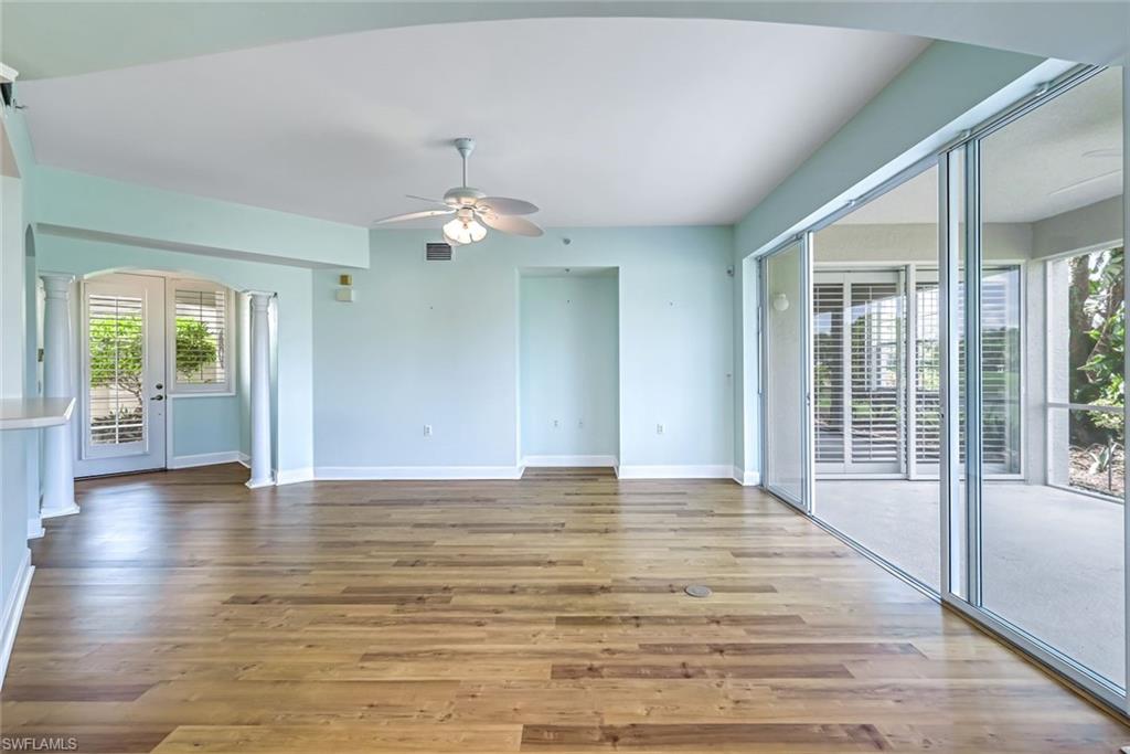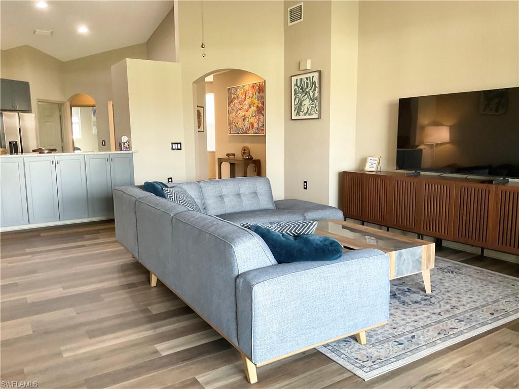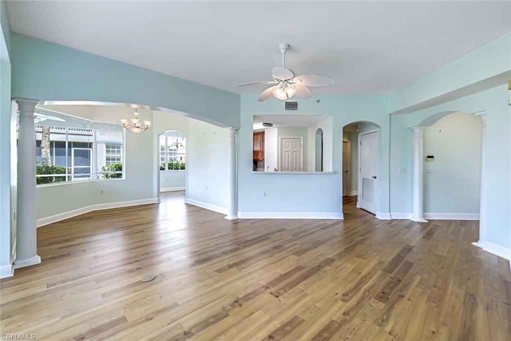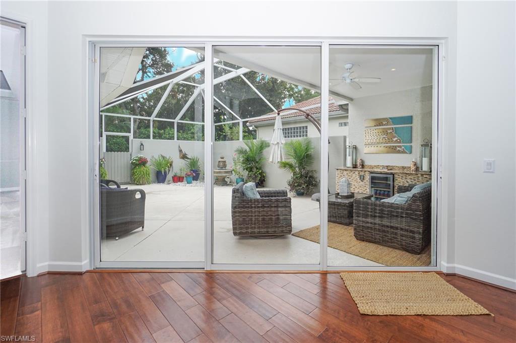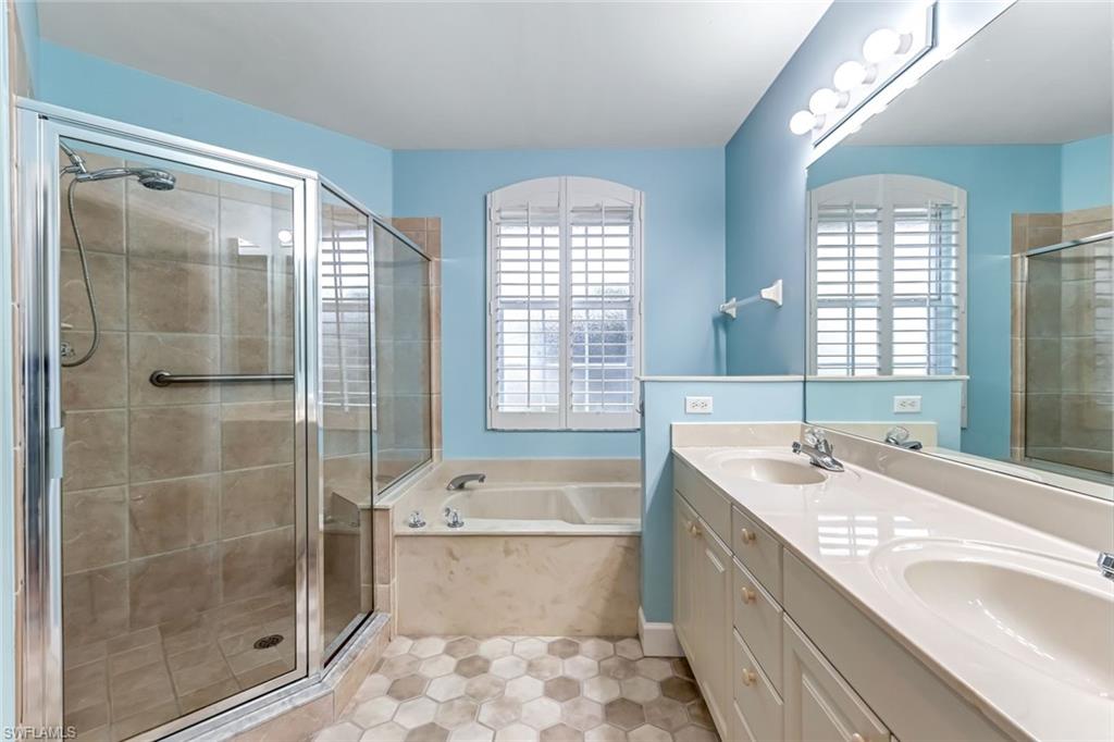 This impeccably updated and rarely available single-family pool home on a private corner lot awaits in the heart of North Naples’ highly sought-after Bridgewater Bay. Showcasing soaring 14 ft. tray ceilings, this light-filled residence impresses with plantation shutters throughout and an open-concept layout that flows effortlessly from the spacious living area—accented by an oversized designer fan—to the dining room and kitchen. The chef-inspired kitchen gleams with 2022 stainless KitchenAid appliances, white cabinetry, granite countertops, and a glass-tile backsplash. With thoughtful upgrades such as a tile roof (2021), luxury vinyl plank flooring in living areas (2022), modern lighting throughout (2022), a full exterior repaint (2022), and a new A/C system (2022), this home offers style and substance in equal measure. The laundry room is equipped with built-in cabinetry, a utility sink, and LG front-load washer/dryer for convenience. Unwind in your heated pool and spa, surrounded by mature tropical landscaping—towering palms, lush oaks, and vibrant greenery. The 2.5-car side-loading garage with an extended paver driveway adds curb appeal and ample space for vehicles or storage. Additional peace of mind includes a security system and hardwired Ring floodlight cameras and doorbell (2022). Located in Flood Zone X so no flood insurance is required, this home never lost power or sustained damage during Hurricane Ian. Bridgewater Bay is a resort-style gated community offering unmatched amenities, featuring two pools (resort-style and lap), tennis, pickleball, bocce, and basketball courts, a clubhouse with fitness center and social calendar, a playground, and tranquil lakes. Two convenient access points on Orange Blossom Drive and Livingston Road provide effortless connectivity. Perfectly positioned just 3 miles to Naples beaches, 2 miles to Mercato, and close to I-75, this home combines location, lifestyle, and luxury in one perfect package.