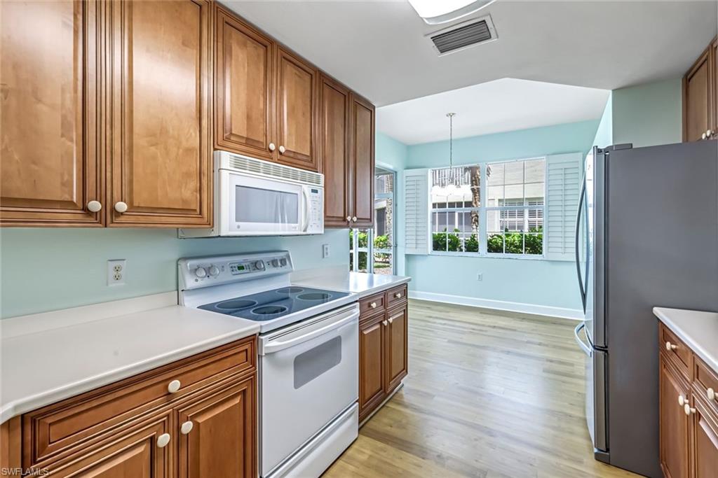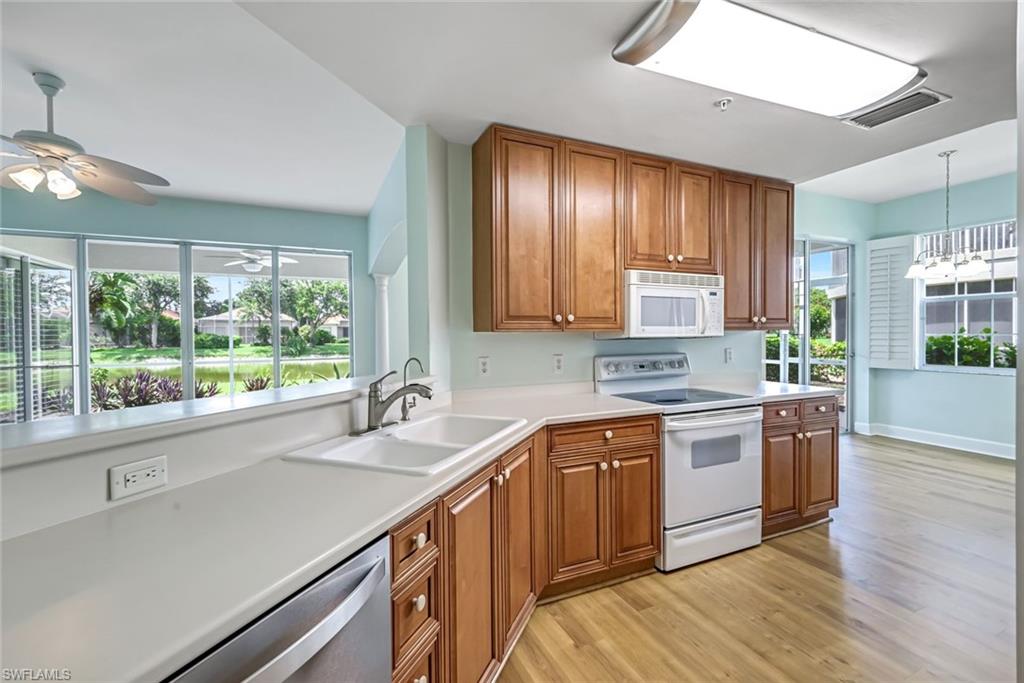 Lakefront Living in North Naples! This beautifully appointed first-floor condo in Bridgewater Bay offers serene lake views and unbeatable access to resort-style amenities. This 3-bedroom, 2.5-bath residence combines comfort, space, and convenience in one of North Naples' most sought-after communities. The expansive, light-filled floor plan opens to a oversized wraparound lanai—perfect for morning coffee or relaxing sunsets. The eat-in kitchen boasts Bright Cabinetry, Corian Countertops, pantry storage, and a full suite of Stainless-steel Appliances. Tile flooring runs throughout the Main Living areas and Bathrooms, with new laminate flooring in the bedrooms. The spacious primary suite is a private retreat, complete with two large closets and an ensuite bath featuring dual vanities, soaking tub, and a separate shower. Bridgewater Bay offers a vibrant lifestyle with amenities including pickleball, tennis, bocce, a resort pool, fitness center, and a calendar full of social events. Just minutes from Mercato, sought after top-rated school district, dining, shopping, and Naples’ white-sand beaches. Don't miss this opportunity to enjoy year-round comfort and community in one of Naples’ most desirable gated neighborhoods. Property comes with a One Year Home Warranty and Professional Cleaning at Closing! *Some images have been virtually staged to serve as an example of potential furniture and decor placement.