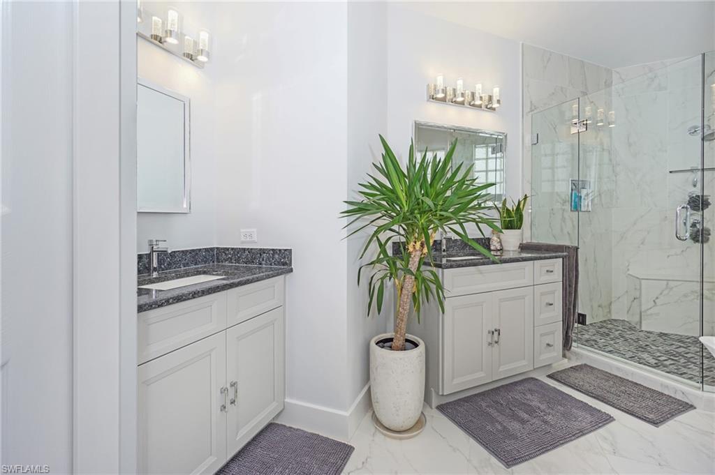 Discover a rare opportunity to own this stunning renovated contemporary 3BED, 2 BATH, 2 CAR GARAGE house in prestigious Bridgewater Bay community of the North Naples! Prime Naples location, only 15 minutes to 5th Ave, Mercato, beaches, not in a flood zone. Luxury living with a serene lakefront setting. Whole house renovated in 2023-2024. New 2023 luxury vinyl floors throughout, 2023 new inside and outside paint, 2024 new cabinetry, vanity and sink in laundry room. 2023 kitchen appliances. Open sunny South facing living room has dramatic wall of windows, soaring 14’ tray ceilings, great open-space living and dining rooms, delightful white quartz chef’s kitchen and a large lanai overlooking lake and fountain. Exquisite white kitchen has modern cabinetry, quartz countertops, pantry. Kitchen and breakfast areas open to oversized lanai, fabulous for grilling and outdoor entertaining. Luxurious master suite with 11’ coffered ceilings has custom organized walk-in closet, 2nd closet, elegant spa like bath and separate shower. Guest bath has new fixtures and countertops. Oversized attached 2 car garage with new 2024 cabinetry throughout, 2024 epoxy flooring by Encore Garage. Whole house surround sound audio system. Timeless décor and incredible attention to details! Backyard has plenty of room to further extend lanai and create your dream pool/spa oasis. Bridgewater Bay amenities include clubhouse w/ resort pool, spa, indoor lap pool, fitness center, 2 Har-Tru clay tennis courts,2 full pickleball courts, 2 Bocce courts, putting green, and more! “A” Rated North Naples schools. Take a 3-D Tour, CLICK on the 3D BUTTON and walk around.