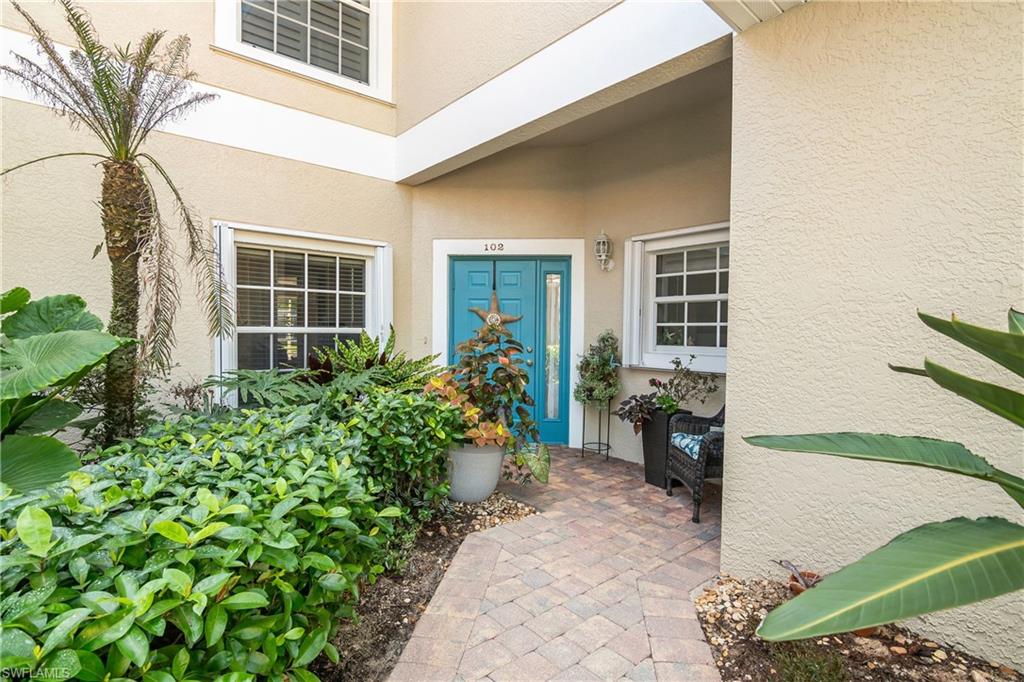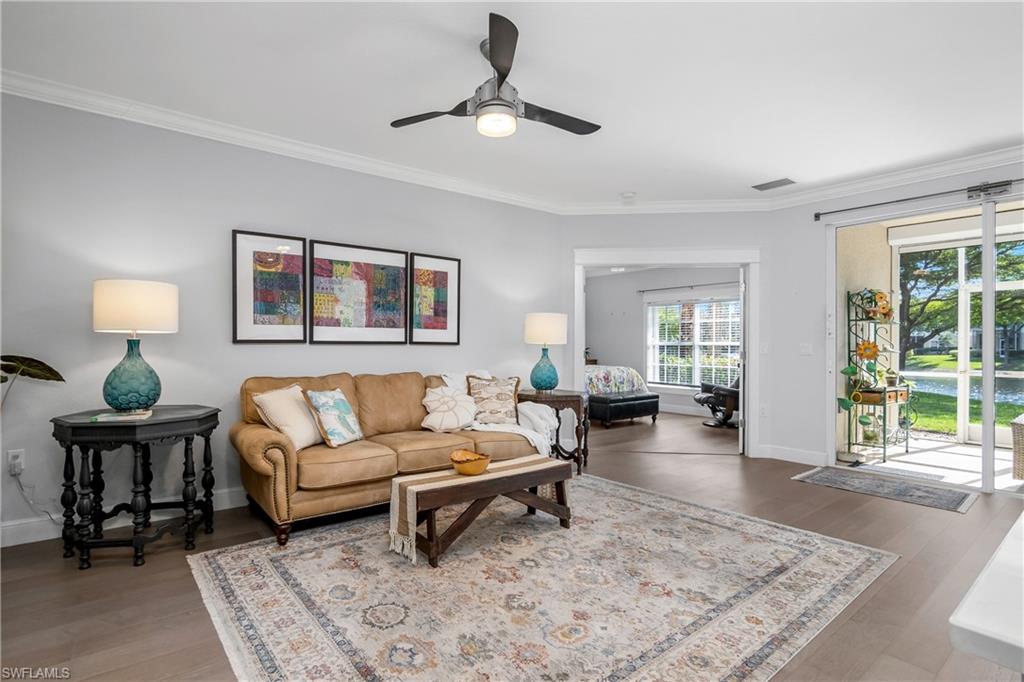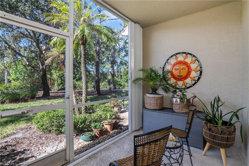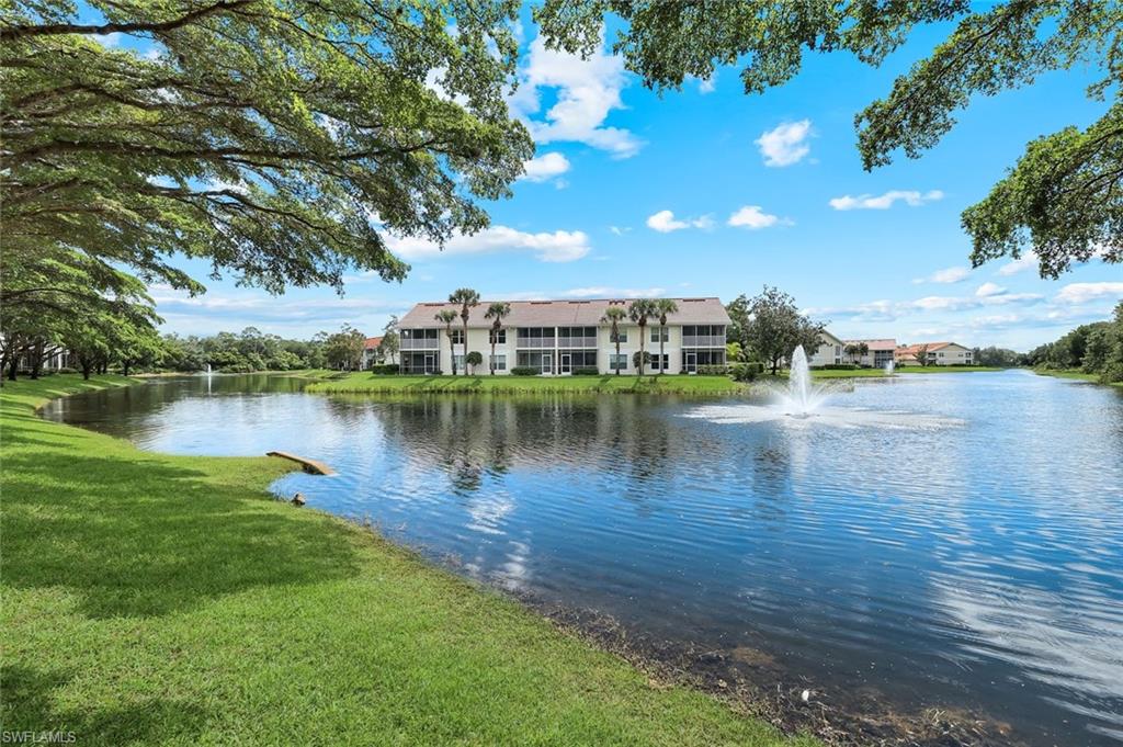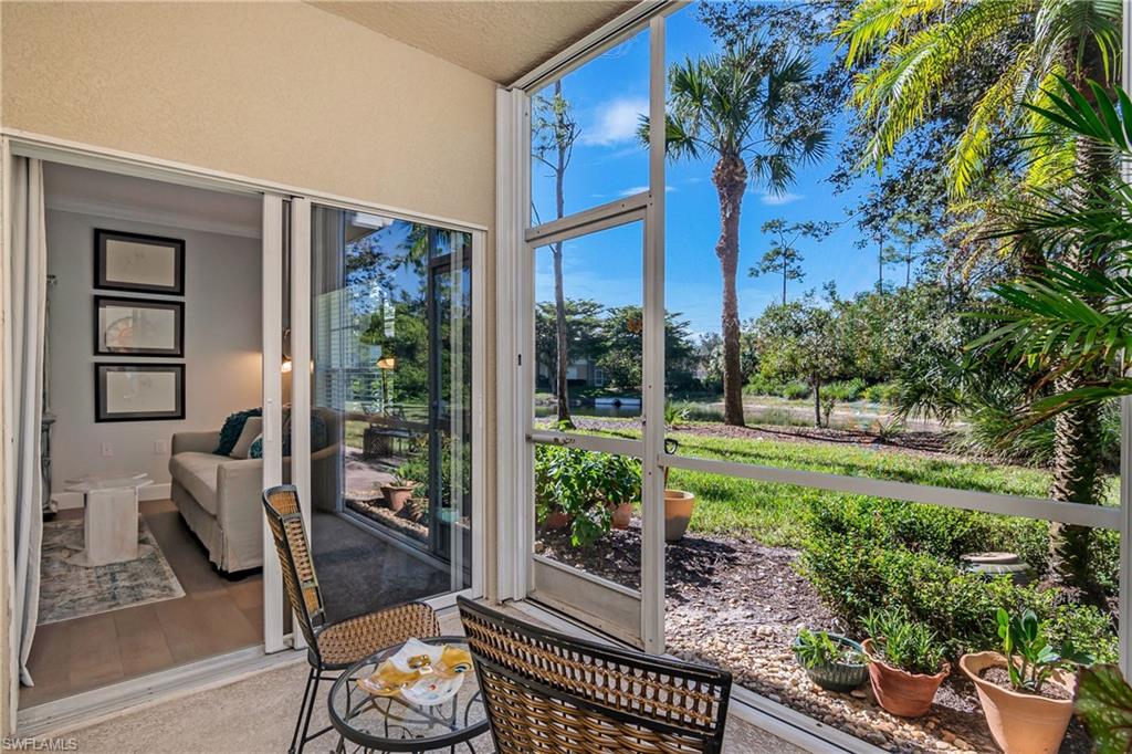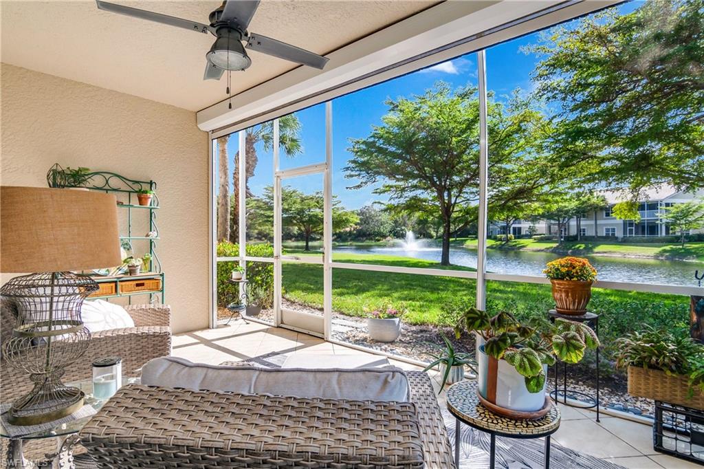 One of the best views in the community. Gorgeous first floor unit that is full of light with gorgeous lake, fountain and preserve views. You will love spending time on your back lanai watching the shore birds around the lake and enjoying the Florida lifestyle. This unit has a great open concept floor plan with 2 spacious bedrooms and a large lanai as well as a den space with separate side lanai that has added sliding glass doors so it can be used year round. The kitchen features light colored cabinetry and countertops, stainless steel appliances and a breakfast bar. Enjoy volume ceilings, decorative niches, updated lighting throughout as well as being freshly painted. Large neutral tile that is laid on a diagonal can be found throughout the living spaces and an upgraded carpet is in both bedrooms. Enjoy piece of mind with added hurricane protection. You are steps from the local resident pool as well as being a block from Carlton Lakes master association amenity center which features 60 ft lap pool, hot tub, bocce courts, tennis courts, tot lot, workout room and fishing pier. This community has great walkability to both Seed to Table as well as The Strand shopping center. You are minutes to shopping, dining and Naples gorgeous white sand beaches. This unit is sold with a 1 year home warranty for the new buyer.