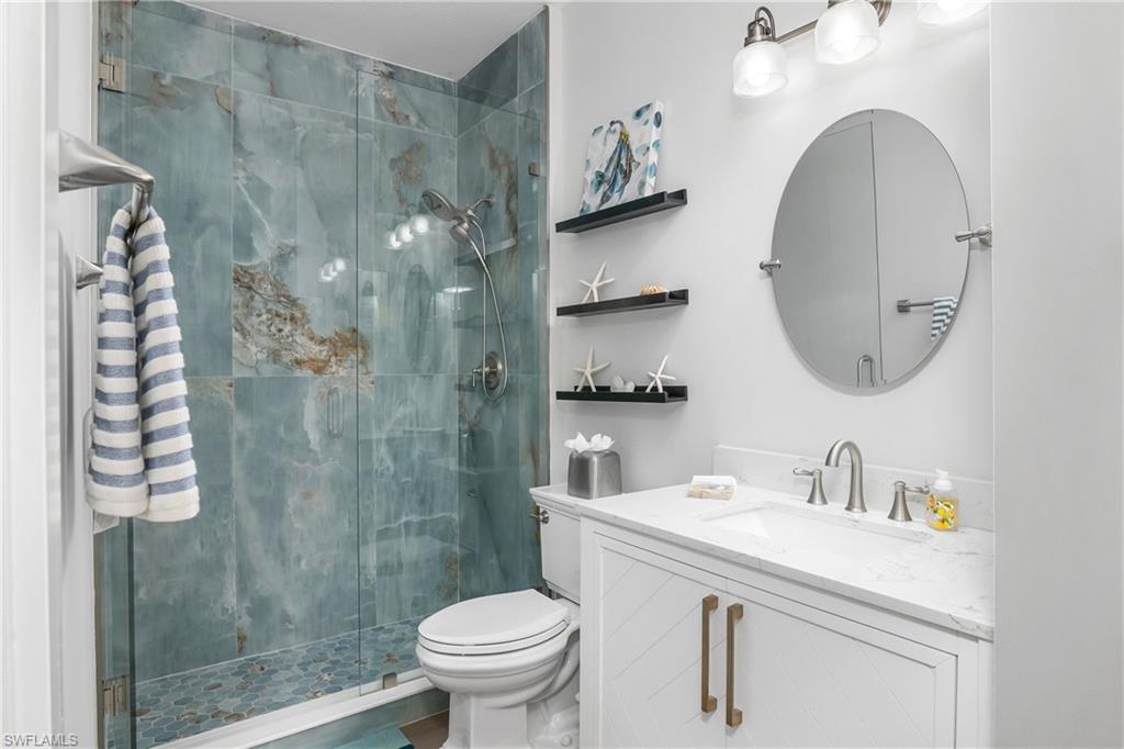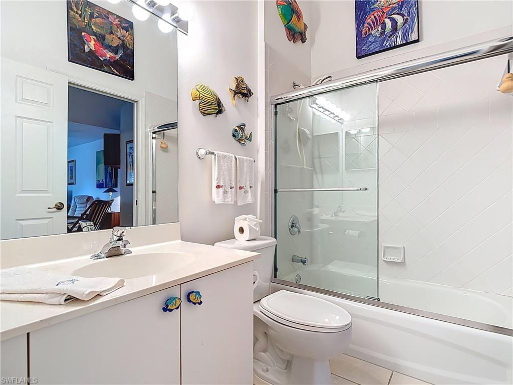 Beautifully updated 1st floor 3 bedroom, 2 bath lakefront unit with 1 car attached garage and private courtyard entry. Enjoy on updated kitchen with custom designed with grey cabinetry, granite counters, under counter tap lighting, stainless steel appliances and tiled backsplash. Gorgeous tiled flooring throughout living area and large guest bedroom laid in a subway pattern. Master bedroom features updated bath with custom cabinetry, dual sinks, granite counter tops and frameless shower door. The guest bath has also been updated with raised vanity, updated lighting and mirror. The larger of the two guest bedrooms also has a private lanai that has been enclosed with glass sliding glass doors and can function as a bonus room or lanai space. Enjoy gorgeous lake views from your tiled back lanai while dining alfresco. The AC has recently been replaced and is only 1 year old. This condo association has had all roofs replaced and also painted all exteriors of the buildings. You have ample guest parking just across the street and you are a short walk to the local resident pool. Carlton Lakes features great walkability to both Seed To Table as well as a local resident gate that offer pedestrian access to The Strand shopping plaza. Carlton Lakes amenities include club house with 60 ft lap pool and hot tub, tennis courts, bocce courts, tot lot, fishing pier and fitness room. This unit is being offered furnished with some exclusions and a one year home warranty for the new buyer at closing!