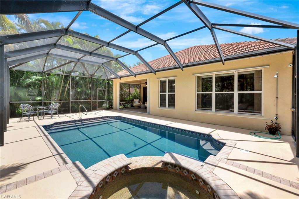 Come see this single family home with large pool & spa nestled on a cul-de-sac in the desirable North Naples community of Carlton Lakes. Enjoy relaxing on your private back lanai surrounded by preserve views. This home features 3 spacious bedrooms and open concept floor plan. You'll enjoy volume ceilings, fresh paint, French cut travertine flooring throughout living area, updated lighting fixtures, plantation shutters and new carpet in bedrooms. The kitchen features white cabinetry with Corian counters, an eat in kitchen nook and brand new stove. This home also has a newer roof that was replaced in 2019, new hot water heater replaced 2024 and hurricane protection for added peace of mind. Carlton Lakes amenities include bocce courts, tennis courts, fishing pier, tot lot, club house with 60 ft lap pool and hot tub. Enjoy great walkability to Seed To Table as well as The Strand Shopping Center. You are close to shopping, dining and 6 miles to Naples gorgeous white sand beaches. A 1 year Home Warranty for the new Buyer is provided at closing.