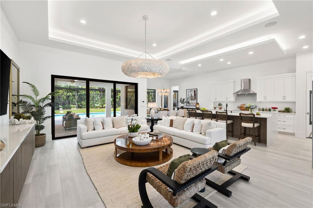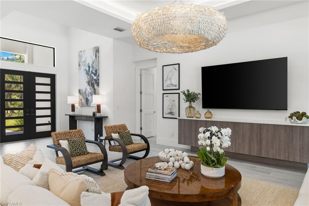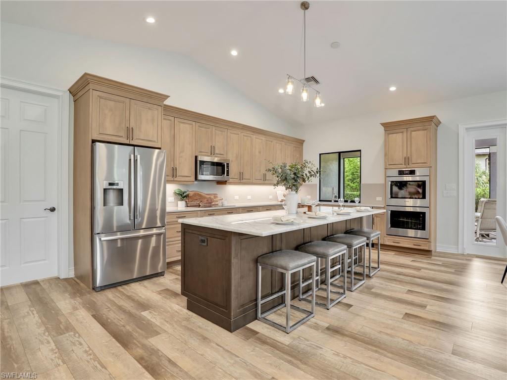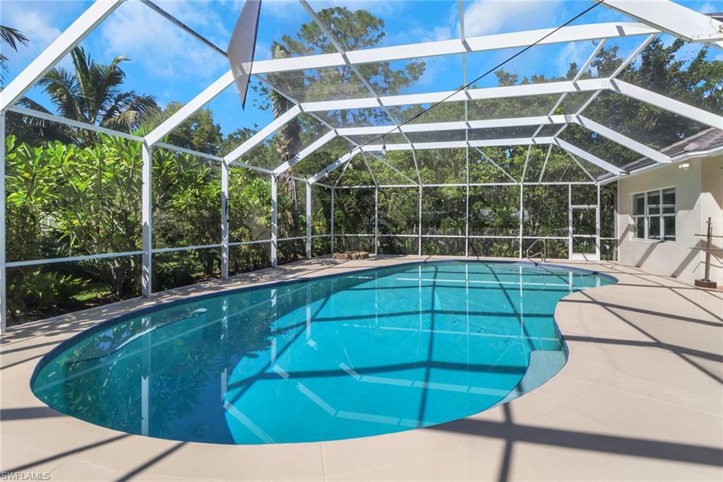 Coastal Modern Retreat on 2.45 Acres—No HOA, Prime Naples Location! Welcome to your private oasis, where modern design meets estate-style living. This 2018-built custom home sits on a beautifully landscaped 2.45-acre lot with a paver driveway and charming front entry. Step through the 9' mahogany front door into a bright, open living space with soaring 15' ceilings and epoxy floors in a marble blend of greys and blues—creating a polished coastal vibe. A stylish wet bar with wine fridge makes entertaining effortless, while the open layout invites flow and function. With 2,616 sq ft under air (3,248 total), this thoughtfully designed 3-bedroom, 3.5-bath home includes a versatile flex room with glass pocket doors and large sliders that disappear into the wall—ideal as an office, gym, den, or guest suite. Just beyond the main living spaces, the elegant primary suite offers tranquil pool views and direct lanai access. Sunlight fills the room, highlighting soft tones, a custom wallpaper accent wall, and upscale finishes that create a relaxing escape. The spa-like primary bath features dual vanities, a freestanding soaking tub, and dual walk-in shower with floor-to-ceiling textured tile. Bedrooms offer 10'+ ceilings, engineered oak flooring, 8' solid wood doors, and privacy. Both guest bedrooms have en-suite bathrooms; one features a steam shower and pool access. The chef-inspired kitchen impresses with quartz countertops, double wall oven, gas cooktop, and WalzCraft cabinetry (42" lowers, 24" uppers). A large island with cabinets on both sides offers added storage, prep space, and casual dining. Entertaining is effortless—open the sliders to the expansive covered lanai with stone tile and cypress ceiling. A huge paver sun deck surrounds the heated pool and spa—perfect for relaxing or hosting. The outdoor kitchen with sink and built-in grill sets the stage for weekend barbecues. Built for long-term peace of mind this home features PGT impact windows, standing seam metal roof, spray foam attic insulation, insulated partition walls, generous attic storage, and whole-house surge protector. A Navien tankless hot water heater, whole-house reverse osmosis (300-gal tank), buried 500-gal propane tank, and dual A/C units offer year-round efficiency. The oversized garage includes epoxy flooring and a 220V outlet for your EV, while a carport adds extra covered parking. A 5-zone irrigation system keeps the grounds thriving. Located in Collier Woods—an in-town Estates area with no HOA—offering privacy, space, and unbeatable convenience near top schools, shopping, dining, and Gulf beaches.