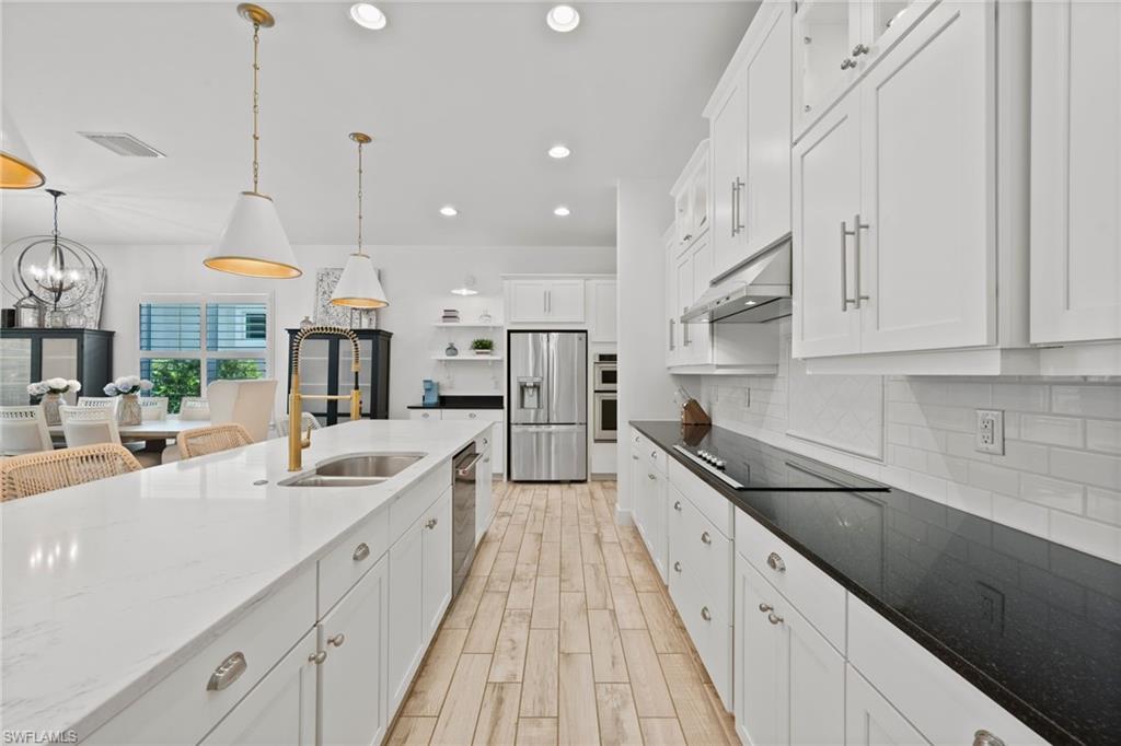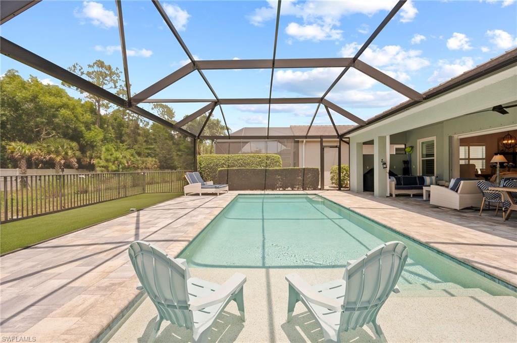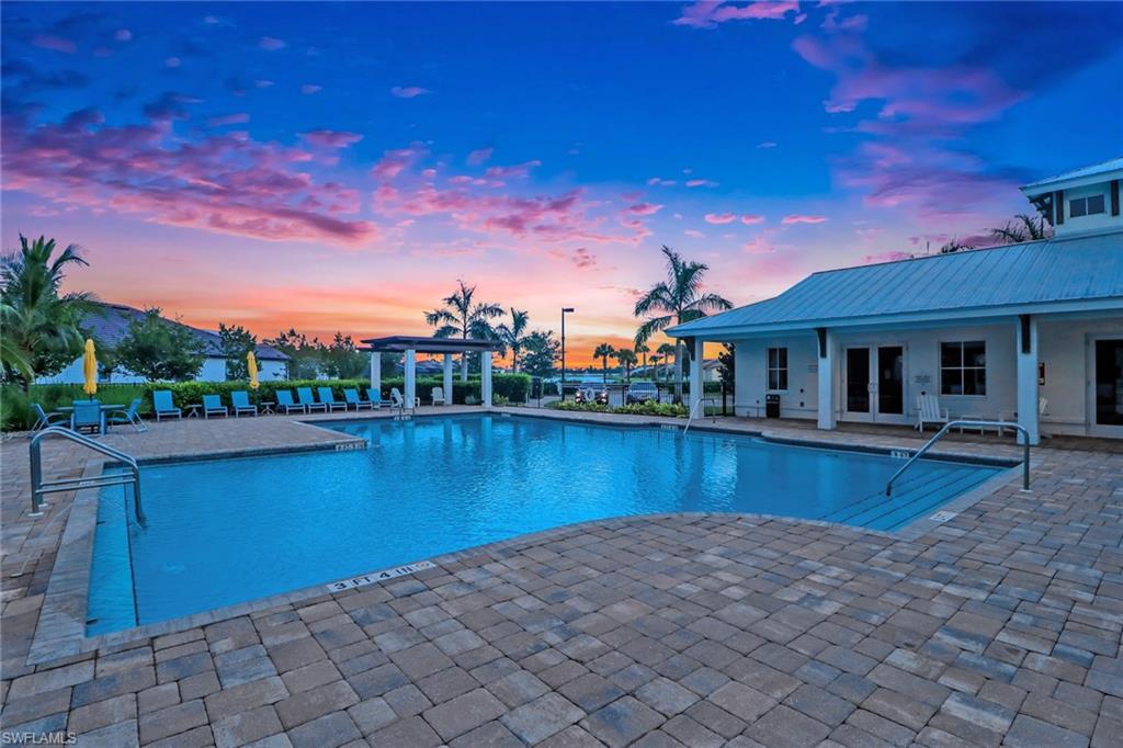 Modern single-story home which allows the ultimate SWFL lifestyle with your own private resort style saltwater heated pool, large custom 10-person spa, Elevated sunbathing deck, poolside full bar including liqueur on-tap, and full outdoor gourmet kitchen. Pool Heater 3x standard capacity for extra fast and extra hot at the touch of a button. Enjoy overlooking the community lake with fountain, as well as your 6000 Gallon Acrylic KOI Pond, makes your outdoor space even more of a tropical oasis. One of only a few homes in community on gas. 900 Gallon tank provides natural gas to both outdoor kitchen, outdoor fire-pits and indoor kitchen range. Home runs a usual FPL bill of $0 with a extra-large 56 panel solar system. Master suite includes oversized walk-in shower with Multiple shower heads and Dual Zone Hot water controls. Master suite also includes extra-large walk-in closet with built in closet organizers. Uplighting and enhanced ambiance lighting by pool and spa. All outdoor pool, spa, fire-pits, and lighting are automated thru remote control or mobile app. Home includes video security system. Come enjoy this beautiful paradise with KOI which attract positive forces and numerous beneficial outcomes. Attic has been set up for extra storage. Home equipped with Hepa air filtration system. Community is centrally located and part of a A+ School System. Close to shopping and beaches.