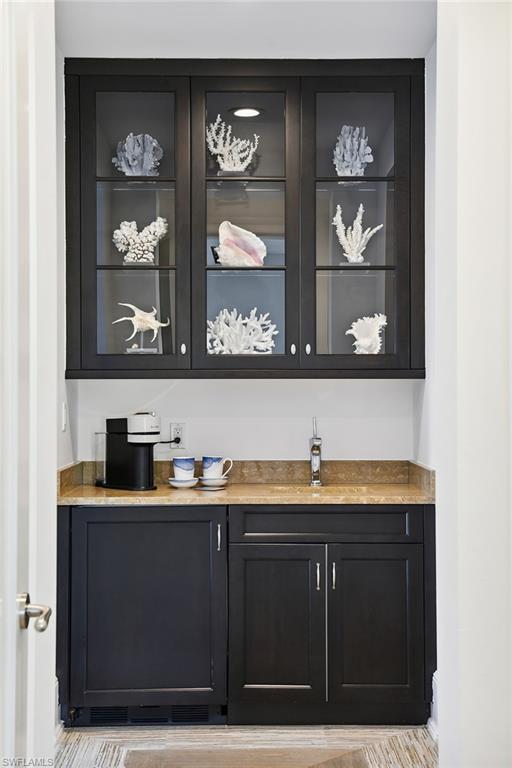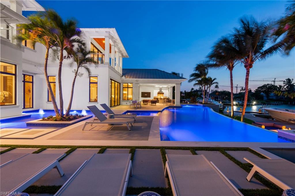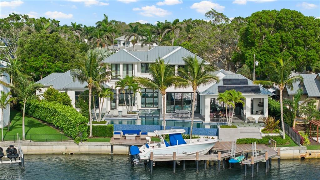 Welcome to your dream retreat in the heart of Coquina Sands—one of Naples’ most desirable neighborhoods. Thoughtfully designed by acclaimed architect Stofft Cooney and built by the renowned Toscana Homes, this elevated custom estate (built at over 10 feet) is a boater’s dream, offering direct bay access and everything you need for the ultimate waterfront lifestyle. The private dock is fully equipped with a boat lift, kayak launch, water and power hookups, Snook lights, and a fish cleaning station—perfect for sunset cruises or catching dinner right from your backyard. With nearly 1,900 sq ft of open-air deck space, an oversized infinity-edge pool with multi-color lighting, spa, fire pit, and lush landscaping featuring rare tropical trees, the outdoor setting is nothing short of spectacular. Inside, the home makes a striking first impression with a reflection pool and dramatic bay views from the moment you enter. Wide-plank wood flooring flows into the expansive great room, featuring a sleek linear fireplace and two climate-controlled wine cellars holding up to 1,000 bottles. Entertain with ease at the bar with beverage fridge or cook in the show-stopping kitchen with hidden breakfast bar, SubZero and Wolf appliances, steam oven, and high-end European cabinetry. Wake to stunning water views in the main-level master suite, which offers dual walk-in closets, a steam shower, and two water closets. A second bedroom is also downstairs, while the upper level includes three additional bedrooms—or two and a media/game room—all with balcony access and more incredible bay views. Additional features include electric screens and shutters, a summer kitchen, Vantage lighting system, 6 zone Sonos system, electric window shades, built-in audio, 55 solar panels, a full-home generator, and a durable metal roof. This exceptional residence combines expert craftsmanship with unbeatable location and waterfront luxury—a true boater’s paradise in the heart of Naples.