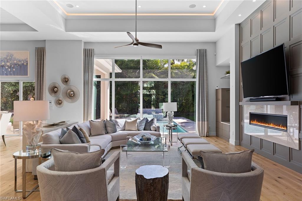 Newly constructed, never lived in and move-in ready, ideally situated on an oversized premium corner lot, this luxurious new-construction residence embodies the spirit of Naples living. Designed by MHK in collaboration with Waterside Builders and Diana Horsley Interiors, the spectacular light-filled six-bedroom + den home flows gracefully from one engaging space to another. Finished to the highest standard, the open floor plan with voluminous ceilings features multiple fireplaces, European oak floors, Ruben Sorhegui tile, quartz counters, elevator, and generator. Chef’s kitchen offers Subzero, Wolf and Miele appliances, large center island and generous butler’s pantry with additional storage and appliances. A full wall of pocketing glass sliding doors leads to spacious outdoor covered living areas, including an outdoor lounge, dining area, summer kitchen, half bath, and heated pool and spa with western exposure. First-floor primary retreat includes substantial dual walk-in closets and a spa-like ensuite bath with separate water closets. Bonus room, wet bar, balcony, laundry and five additional en-suite bedrooms, including a cabana/VIP suite with private entry, provide comfortable accommodations for guests on the second level. In close proximity to 5th Avenue S, Third Street S and sugar sand beaches, this home represents a rare opportunity to enjoy the best Naples has to offer.