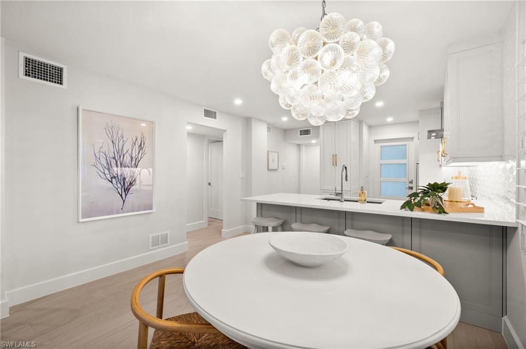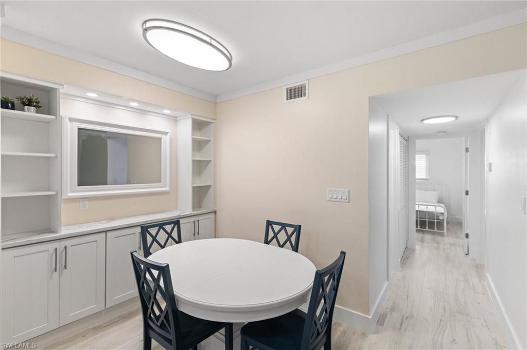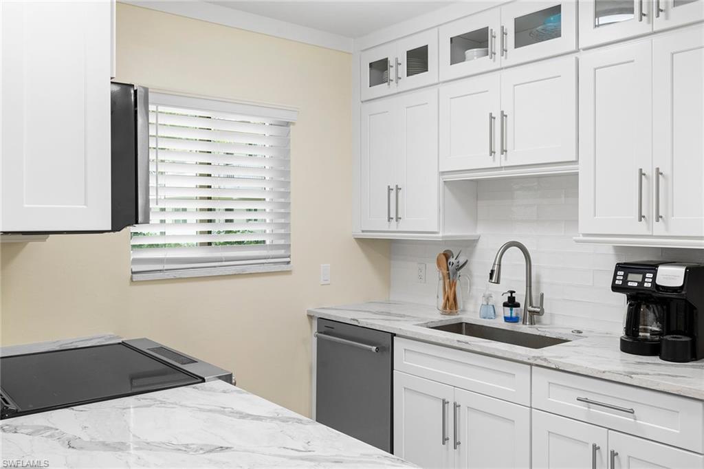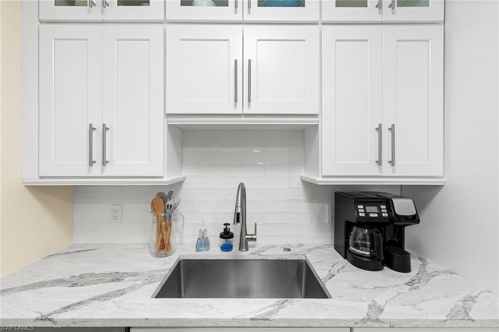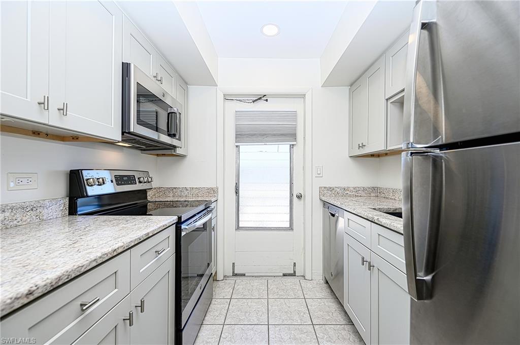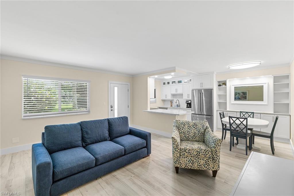 Calusa Club, Paradise Found! Nestled within Gulf Shore & Coquina Sands' Miracle Mile neighborhood sits this beautifully renovated 2 bed, 2 bath haven in a meticulously maintained. well-managed complex with a garden view. The kitchen opens to the living and dining space and features a cooking island with drawers for storage, sitting area with bar stools, white cabinetry, glass tiled backsplash, and quartz countertops. You will love the all-new bathrooms with clean white tile, recessed LED lighting, and updated plumbing and electrical fixtures. With impact resistant windows and doors, plantation shutters, and newer air conditioner and water heater, there is simply no work for a buyer to do! Decorated in a fun coastal vibe with wood plank tile and versatile furniture for comfort and to maximize the space. The full-size washer and dryer in the residence is a bonus with no need for common laundry. Offered TURNKEY furnished, your new retreat comes fully equipped with stainless steel kitchen appliances, small appliances, linens, and the furnishings! Calusa Club residents enjoy a beautiful community pool, large patio area with new chairs and umbrellas, and the convenience of a private alley entrance, covered carports, exterior storage units and more. Located in Coquina Sands near the corner of Banyan & Gulf Shore Blvds, directly across from Lowdermilk Park, one of the best beaches and waterfront areas in Naples, and the Charleston Square center where locals enjoy First Watch for brunch and Bad Ass Coffee for great brew. Calusa Club is a short distance to the NEW and Iconic Naples Four Seasons Hotel and Resort Complex which will offer several dining options and a marketplace open to the public. Only 2 miles to Naples' world-class shopping and dining on 5th Ave and 3rd Street, and conveniently located near hospitals. If it is your time to simplify your life and enjoy paradise, then this is the place for you! Priced right, a great value!