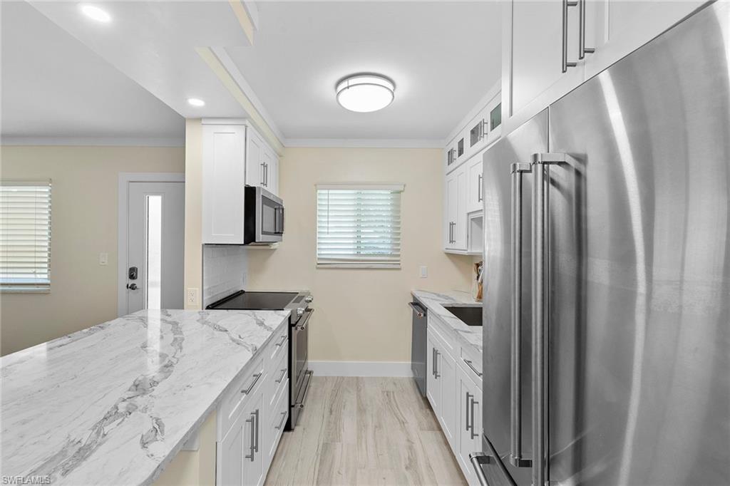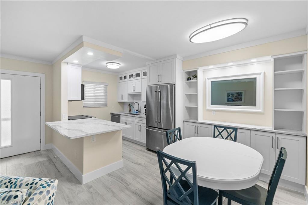 Experience coastal living at its finest in this beautifully reimagined corner residence, just steps from the white sands of Lowdermilk Park Beach. This light-filled, west-facing end unit offers tranquil views of the pool and an unbeatable location just moments from the boutiques and restaurants of Charleston Square and Naples' iconic 5th Avenue South. Meticulously renovated by the renowned teams at Renovations Plus and Holland Home Design, every inch of this residence reflects custom craftsmanship and thoughtful detail. The kitchen is equipped with premium appliances, including a built-in Fisher & Paykel refrigerator, Bosch oven, cooktop, hood, and dishwasher. Quartz countertops, stylish board and batten and shiplap accents, and a full-size stackable washer and dryer (a rare find!) elevate both form and function. This down-to-the-studs renovation includes all-new plumbing, a tankless water heater, new electrical panel and wiring, and impact-resistant windows and doors. Additional upgrades feature LED lighting throughout, custom closet systems in both bedrooms, plantation shutters, and curated wall treatments for added charm and character. Whether you're seeking a peaceful retreat or a chic beachside getaway, this turnkey home is truly a must-see.