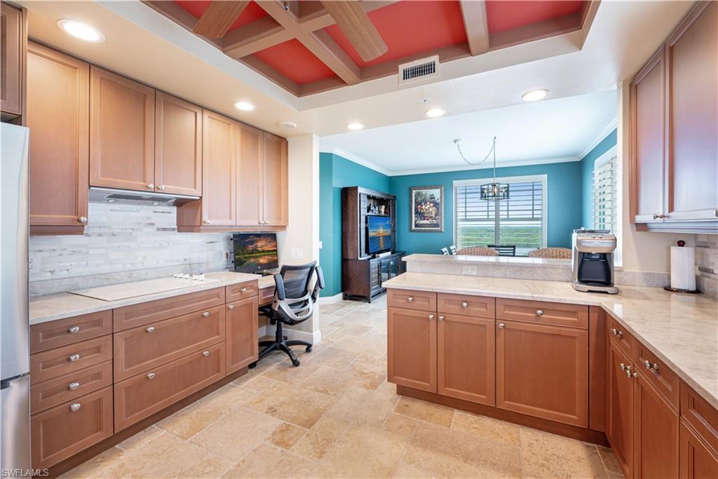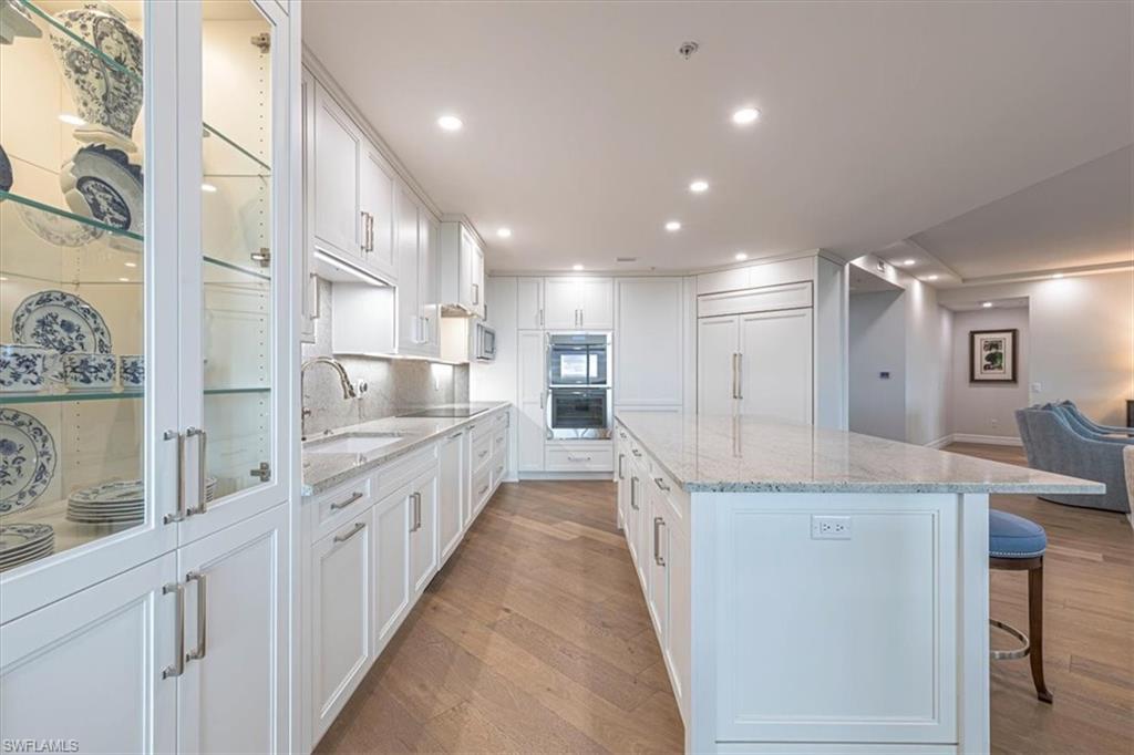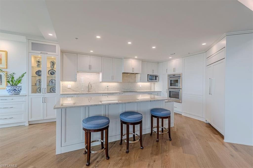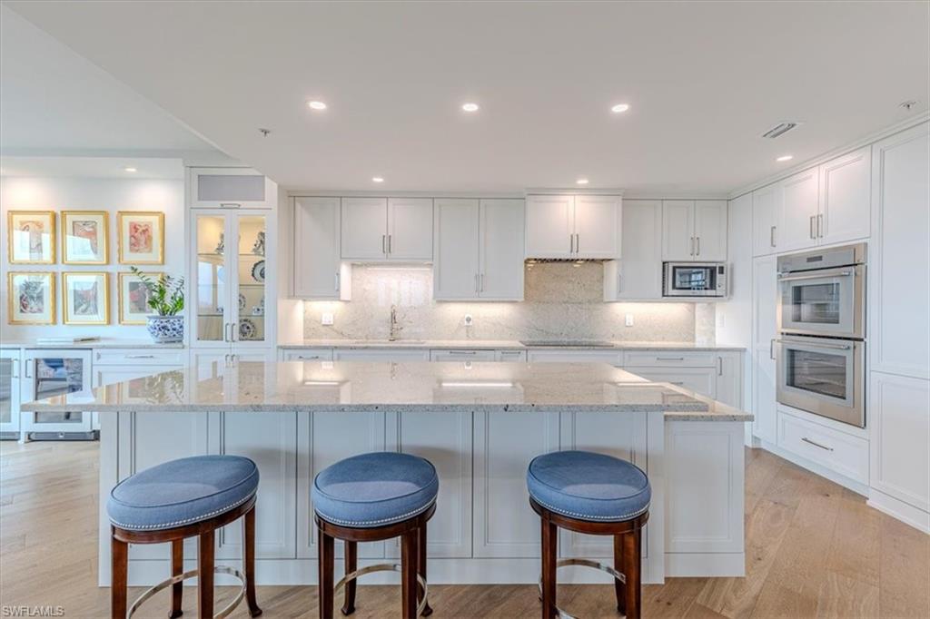 Elevated luxury in Naples! Located in Montego at Cove Towers, this stunning 2645 sq ft 3- bedroom, 3-bathroom condo, accessed via a PRIVATE ELEVATOR, invites you into a world of elegance and comfort. As you step inside, you’ll be captivated by the completely renovated open floor plan with high ceilings and wide-plank white oak floors. At the heart of the home, the gourmet kitchen features shaker cabinets, GE Café appliances (including an induction range with split ovens and an additional oven in the working island), and two 9 1/2 ft spacious islands – one for dining that can accommodate up to 10 people. Relax in the luxurious master suite with serene preserve views, dual walk-in custom closets and a beautifully designed bathroom with an extra large shower, quartz counter tops and all new cabinets. Two additional bedrooms and two bathrooms (one en suite) await your guests – both with large, walk-in closets. Enjoy outdoor living on the screened in lanai where you can sip your morning coffee while taking in tranquil views. You will also appreciate the additional open balcony (unique to Apartment 302) for even more outdoor space. This exceptional unit includes TWO GARAGE PARKING SPACES and access to the on-site Calypso Club, offering a resort-style pool, fitness center, 2 guest suites for extended family stays and social room where many residents gather for a game of bridge, book club, or even just to enjoy a glass of wine. Calypso Club is exclusive to only 2 buildings and is a truly special place. Additionally, the optional membership to the Tarpon Cove Yacht & Raquet Club offers an abundance of opportunities for tennis, pool, dining experiences, and “The Endless Summer” pontoon boat shuttle to the beach. Ideally located near shopping, dining and Naples beaches, experience the pinnacle of luxury living in the Cove Towers Preserve community, where Montego 302 is ready to welcome you home!