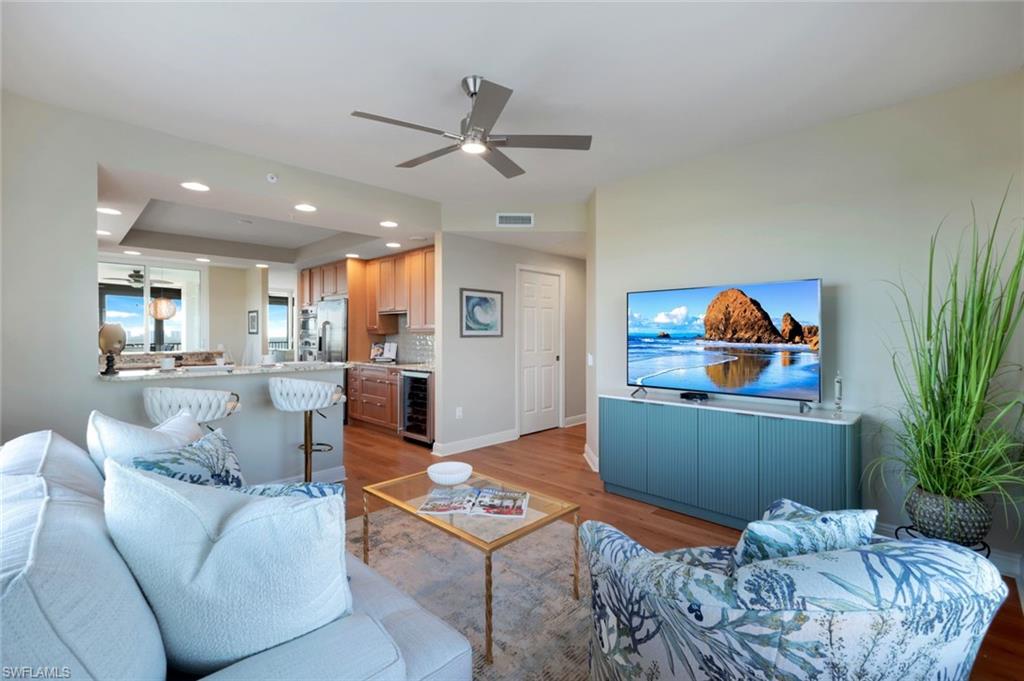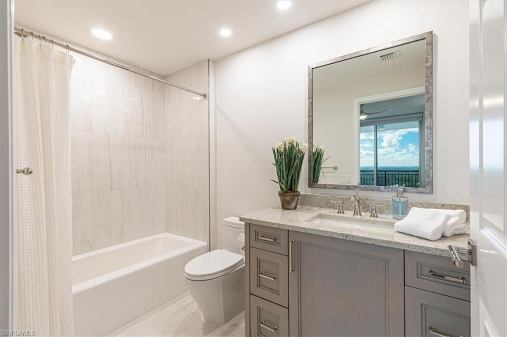 $154,000 PRICE REDUCTION!! Resort style living with stunning sunset Gulf views from this newly renovated luxury 9th floor 3 bedrooms + den, 3 ½ bath condo! Step off your private elevator into your foyer, which opens into a spacious great room/dining room with expansive Gulf and preserve views. Guest room lanai overlooks the new golf course and city lights. Nevis #903 has been completely renovated and professionally decorated. Renovations include all new cabinets and flooring throughout, quartz and marble countertops, all new top line appliances including washer/dryer, crown molding, new plumbing fixtures and comfort height toilets, 5 large new TVs, and modern LED decorative lighting and fans. A dry bar with full size wine and beverage cooler was added in the great room and is great for entertaining. The kitchen area was redesigned to include a 36” induction cook-top and hood, large white apron fireclay sink, ice maker, and a large pantry cabinet added for extra storage.New 2 zone HVAC system. All bedrooms are en-suite and feel very private. Hurricane windows throughout with electric hurricane shutter protection on the large 26’ lanai. The condo includes 1 deeded parking spot with ample guest parking. The building lobby is professionally decorated in a contemporary style. Membership is included to the Calypso Club next door which has a resort sized pool, spa, fitness center, social room with wet bar and kitchen, Cabana room off the pool with fireplace, grill area, and 2 private guest suites for your use. Membership is available to the Tarpon Cove Yacht & Raquel Club with 6 tennis courts, bocce ball, restaurant, tiki bar, swimming pool and hourly beach shuttle to Barefoot Beach Park. Boat slips can be purchased or rented. Luxury living is waiting for you at Cove Tower!