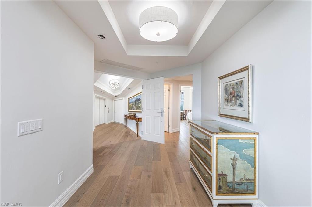 Introducing a sanctuary of luxury living in this prestigious Cove Towers condominium overlooking Turkey Bay with sunset views looking out to the Gulf of Mexico. Located in the highly coveted 01 corner stack, this gorgeous property offers private elevator entry opening to your grand salon with wrap around balcony and includes 3 bedrooms and 3.5 baths. Cove Towers is a gated enclave within a gated community, and residents will revel in the exclusivity of the private Calypso Club. Boasting a heated lap pool, a cabana adorned with a fireplace & grills, media/entertainment room, a fitness room, onsite management, and guest suites. This haven offers an active resort lifestyle all located just steps from the residence. The meticulously designed kitchen will be a cook’s dream and features top-of-the-line Cafe appliances including an Advantium that offers convection, microwave and halogen cooking, professional french door wall oven, induction cooktop, GE Monogram wine chiller & recently updated granite countertops with breakfast bar all set against the backdrop of newly updated wide plank engineered wood flooring. You’ll appreciate attractive and updated lighting throughout the home as well as elegant plantation shutters that offer a coastal modern feel. The master suite offers balcony access and features a serene view of the gulf in addition to an in-suite bath with soaking tub & shower as well as 2 walk in closets. Guests can enjoy both spacious guest bedrooms with in-suite baths and shared balcony with views of the newly developed Kinsale Golf Club. Residents have the option to join Tarpon Cove Yacht & Tennis Club which is located within the community and offers tennis, dining, clubhouse, resort style pool and boat taxi to Naples gorgeous white sand beaches. Embracing captivating views of Turkey Bay and the Gulf of Mexico, this home is the epitome of luxury living.