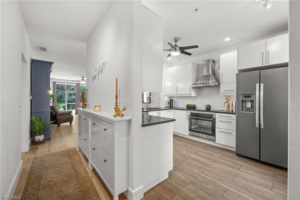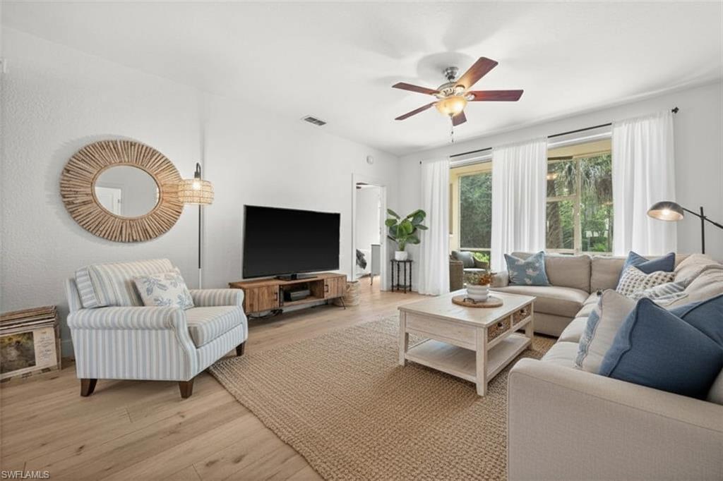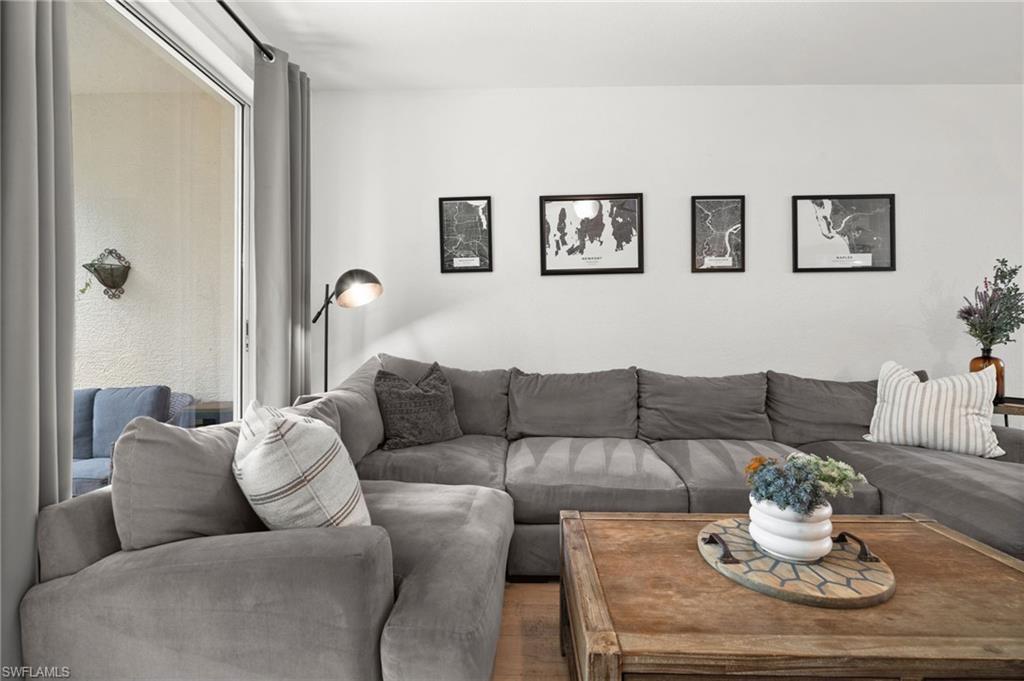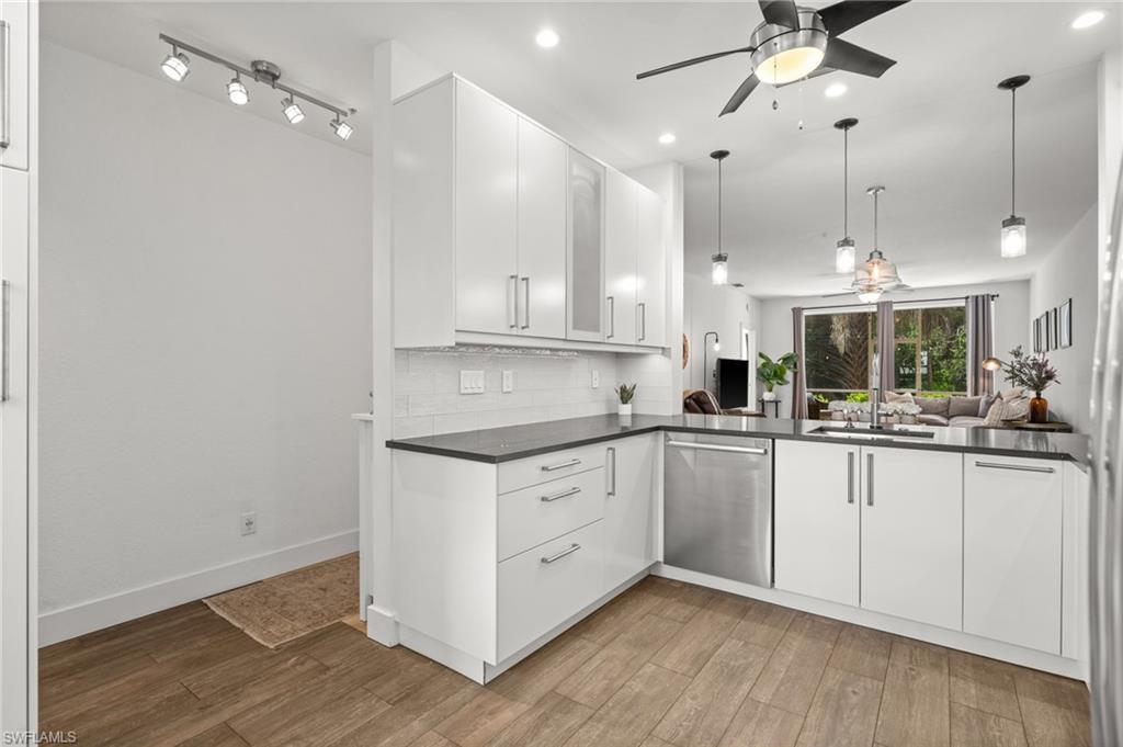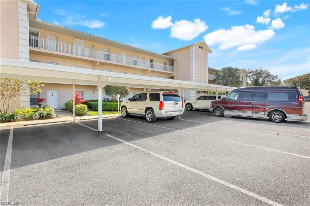 Welcome to your slice of paradise in Naples! This beautifully maintained 2-bedroom, 2-bath condo offers comfortable coastal living just over 3 miles from the Gulf beaches. The light-filled open floor plan features a spacious great room, well-appointed kitchen, and private screened lanai, with lake and pool views Perfect for morning coffee or evening sunsets. The following were all done in 2025, flooring, spray create on lanai, primary toilet, blinds, fridge, dishwasher, kitchen countertop, painted and new lower cabinets in the kitchen. Enjoy the convenience of a covered carport, in-unit laundry, and access to community amenities. Ideal as a year-round residence, vacation retreat, or investment property—all within minutes of shopping, dining, and Naples’ white-sand beaches.