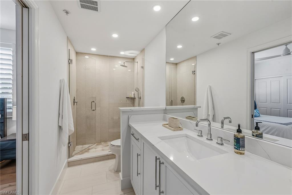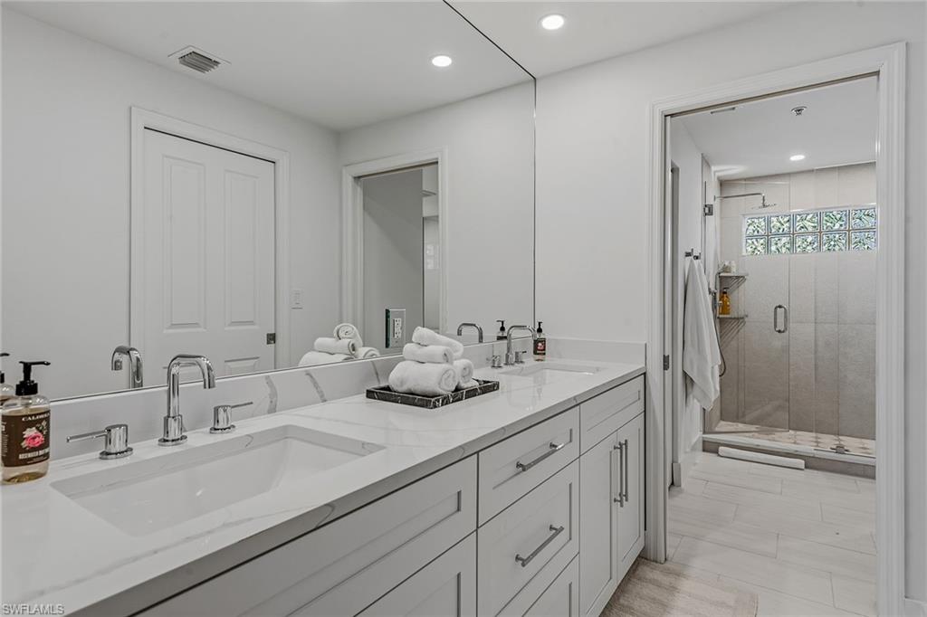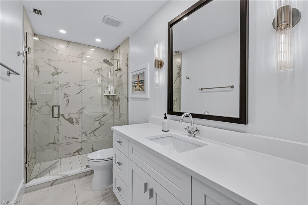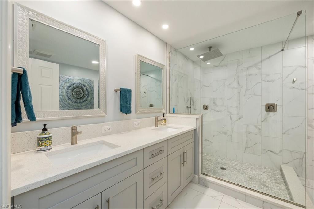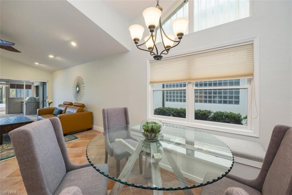 In the lush enclave of Eagle Creek Golf and Country Club, this exquisitely renovated villa redefines contemporary golf course living. Every element of this furnished three-bedroom, two-bath residence has been elevated with an emphasis on comfort, craftsmanship and connection to nature. New impact-resistant windows and doors frame the tranquil golf course and preserve views, bringing the outdoors in with a sense of calm sophistication. Inside, soaring vaulted ceilings with architectural skylights and two screened atriums flood the open layout with natural light, illuminating refined details such as imported Italian tile, updated interior doors and moldings, custom window coverings, and luxurious furnishings. At the heart of the home, the beautiful kitchen blends form and function. Striking quartz countertops with a waterfall island anchor the space, complemented by premium appliances and thoughtful design that invites daily living and effortless entertaining. In addition to the incredible living spaces, one will also find spacious and well-appointed bedrooms, two luxury baths, custom closet-built-ins and convenience of a one-and-a-half-car garage. Just a short distance away, the newly renovated clubhouse offers championship golf, refined dining and a vibrant social atmosphere. For those seeking leisure and wellness, the nearby Crystal Lake clubhouse presents outdoor dining, poolside relaxation, a fitness facility, pickleball, tennis and more. This one-of-a-kind residence invites you to experience the art of living beautifully in one of Southwest Florida’s intimate golf communities. Membership required.