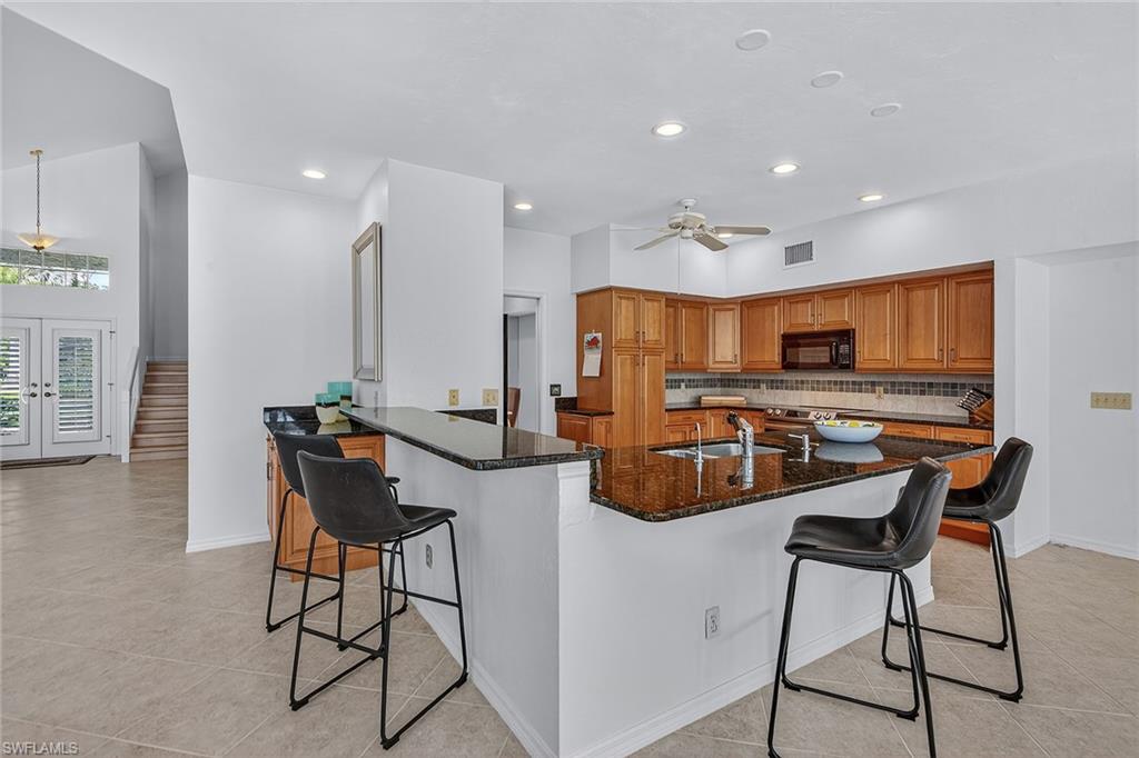 IMMEDIATE GOLF EQUITY MEMBERSHIP IN THIS SMALL NICHE COMMUNITY IN SOUTH NAPLES Imagine-gorgeous SW Florida Sunsets over a serene lake & 18th fairway. Get ready to fall in love with this charming 2 story estate home with incredible views and most desirable location in Eagle Creek. This 3 bedroom 2.5 bath Eagle model has fine wood cabinetry and granite counter tops in the kitchen and baths. With the master bedroom suite downstairs and the 2 additional bedrooms upstairs, allows for added privacy when your out of town guests arrive. The spacious family room opens to a large covered lanai, paver pool deck and sparkling pool and spa. If you enjoy walking (optional) a beautiful 18 hole championship golf course then Eagle Creek is where you want to be! Short walk to the newly renovated clubhouse, practice range, tennis, PICKLEBALL, fitness classes, and state of the art fitness center.