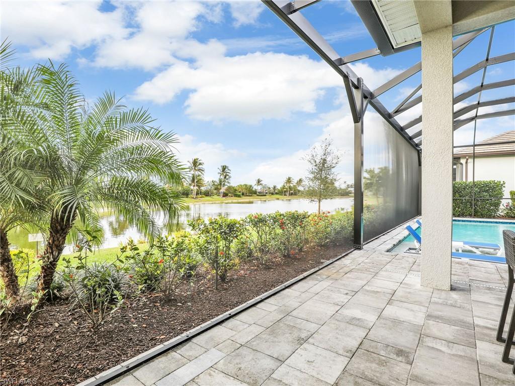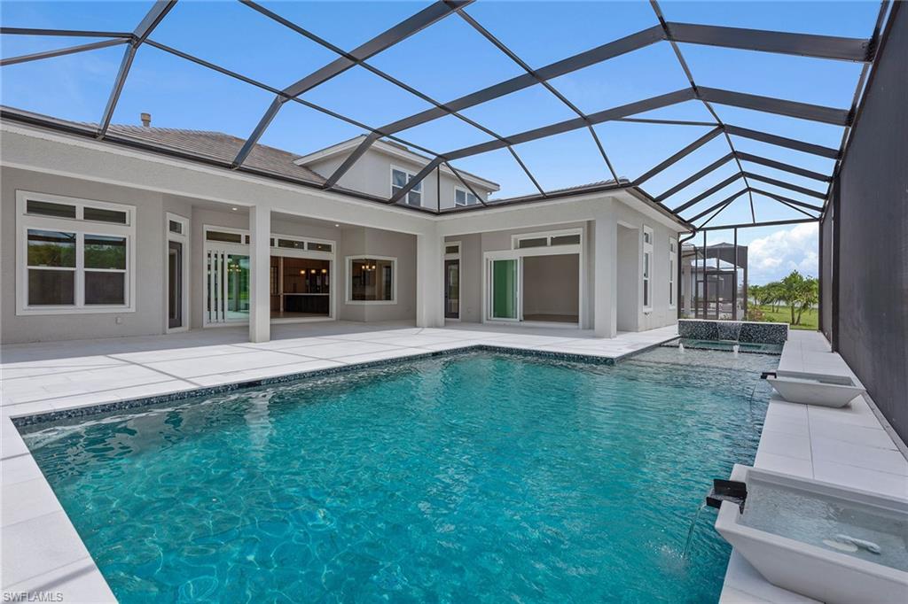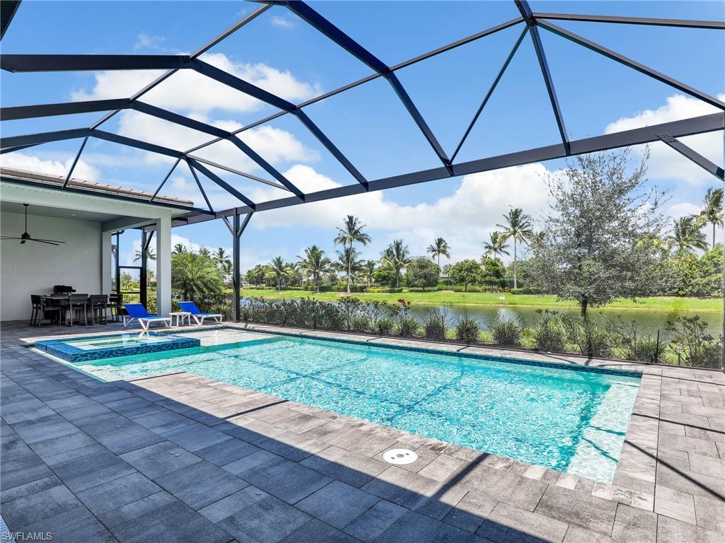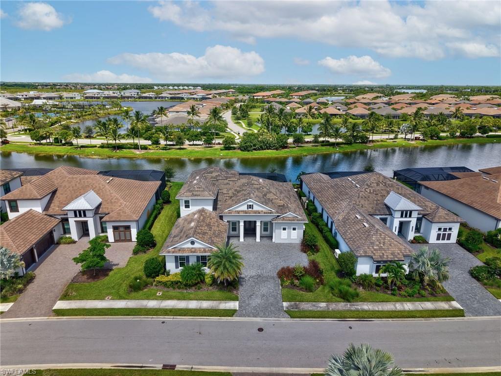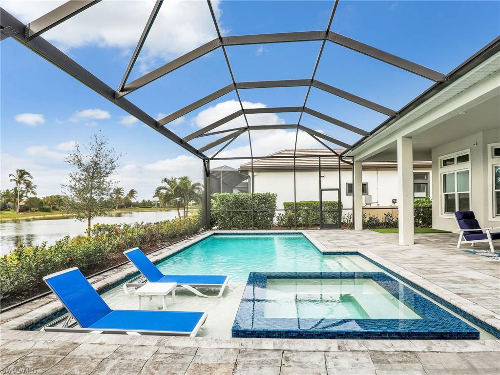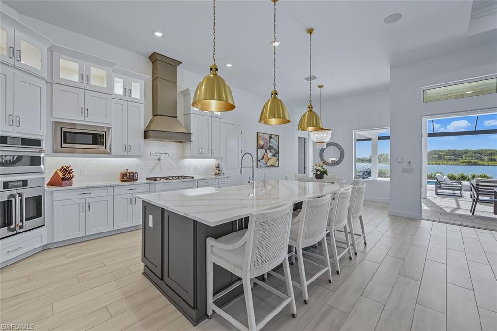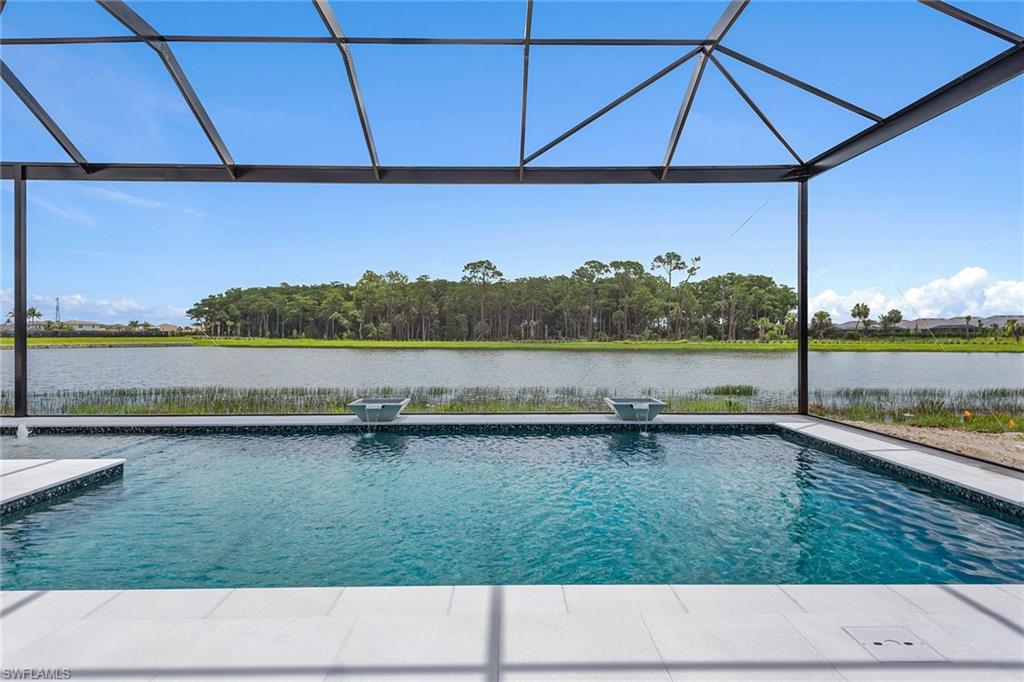 NEWLY BUILT LAKEFRONT POOL HOME WITH UNOBSTRUCTED VIEWS. This 4,500+ sq ft residence sits on a $400K premium lot with long lake views, complete privacy, and no future development across the water. The home impresses from the moment you arrive with an extended paver driveway, upgraded elevation, and hurricane-impact windows and doors. Inside, soaring tray ceilings, wood-beam accents, wainscoting, custom millwork, and wood-like tile floors create a warm, elegant feel. The open great room showcases panoramic lake views, a custom fireplace, built-in TV, and Sonos surround sound. The chef’s kitchen features quartz countertops, a massive island, gas cooktop, double ovens, dual wine coolers, soft-close cabinets, under-cabinet lighting, and a stylish glass-front bar. The first-floor owner’s suite is a private retreat with a bay window overlooking the lake, his/her walk-in closets with built-in cabinetry, and a spa-like bath with quartz counters, dual vanities, and a massive walk-in shower with three shower heads. Each guest bedroom includes an en-suite bath and walk-in closet. Upstairs, the bonus room offers a wet bar, lounge area, a full bath, and an additional guest suite with another full bath attached—perfect for entertaining or hosting guests. The outdoor living space is a true oasis with a gas-heated saltwater pool and spa, panoramic screens, extended lanai space, a full outdoor kitchen with grill, stovetop, sink, fridge, and a dedicated pool bath. Additional highlights include a 3-car epoxy garage, three AC units, tankless water heater, natural gas, generator-ready hookup, and no flood zone. Esplanade by the Islands offers resort-style living with a clubhouse, wine bar, restaurant, tiki bar, fitness center, dog park, and full social calendar—all minutes from Marco Island, Downtown Naples, and Gulf beaches. This home combines custom design, high-end finishes, and a one-of-a-kind lakefront lot—truly a rare find. MAKE AN OFFER TODAY.