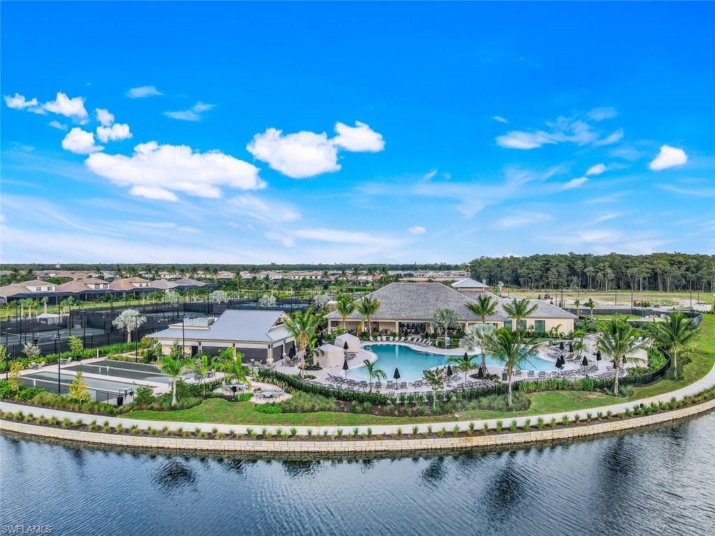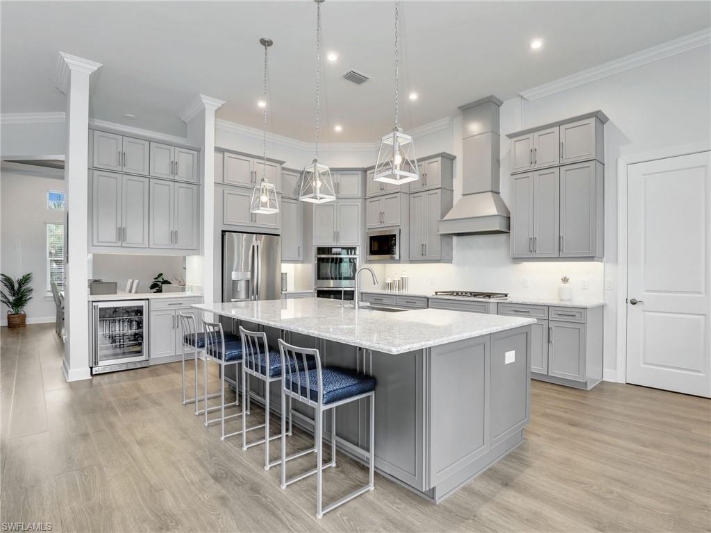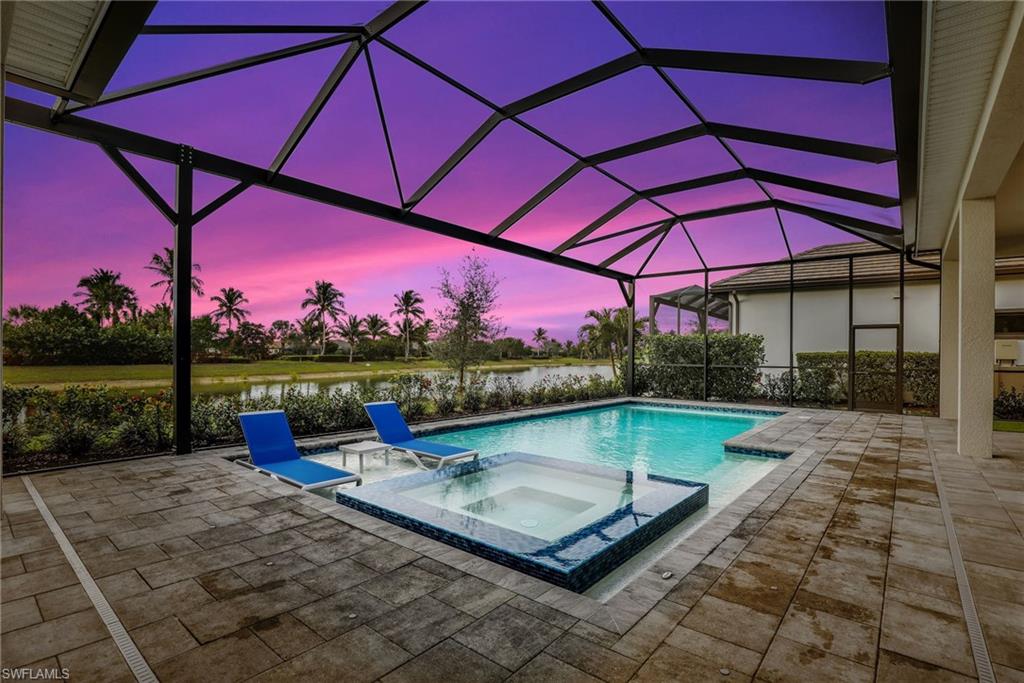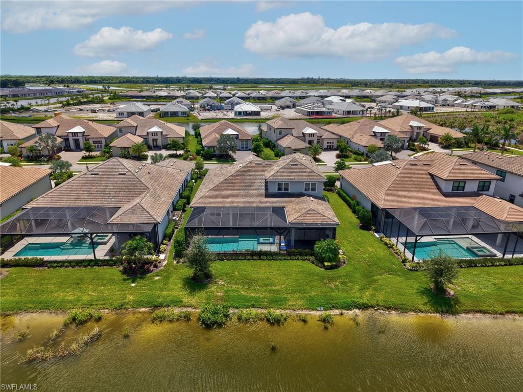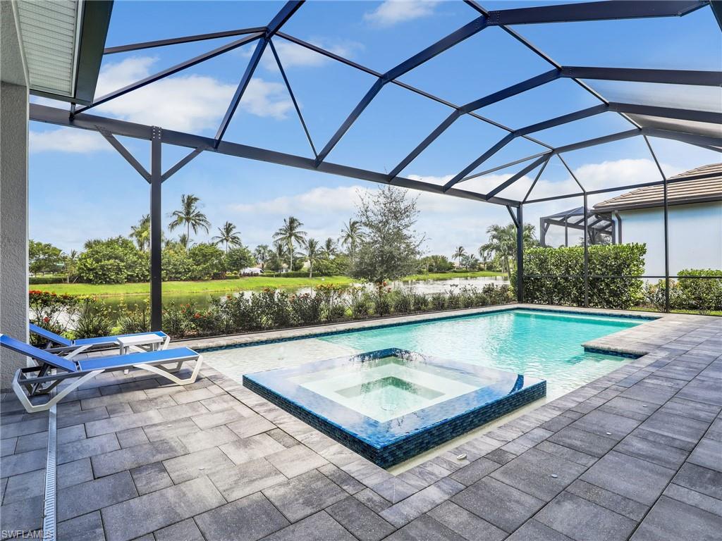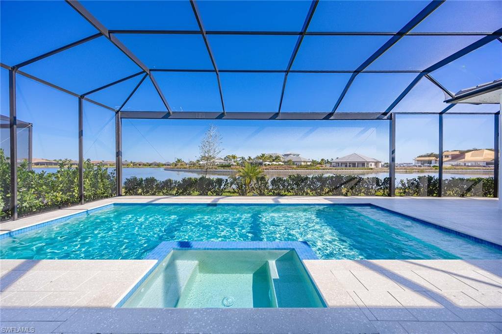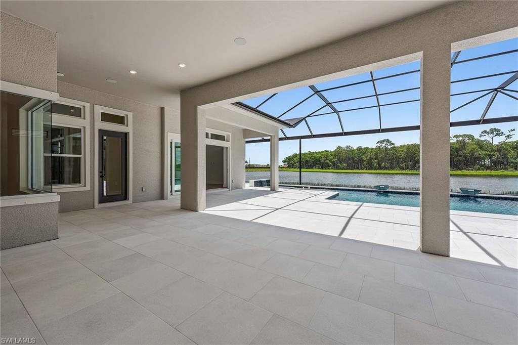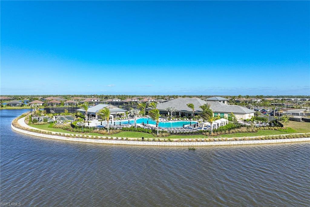 NEWLY BUILT LAKEFRONT POOL HOME WITH UNOBSTRUCTED VIEWS. This 4,500+ sq ft residence sits on a $400K premium lot with long lake views, complete privacy, and no future development across the water. The home impresses from the moment you arrive with an extended paver driveway, upgraded elevation, and hurricane-impact windows and doors. Inside, soaring tray ceilings, wood-beam accents, wainscoting, custom millwork, and wood-like tile floors create a warm, elegant feel. The open great room showcases panoramic lake views, a custom fireplace, built-in TV, and Sonos surround sound. The chef’s kitchen features quartz countertops, a massive island, gas cooktop, double ovens, dual wine coolers, soft-close cabinets, under-cabinet lighting, and a stylish glass-front bar. The first-floor owner’s suite is a private retreat with a bay window overlooking the lake, his/her walk-in closets with built-in cabinetry, and a spa-like bath with quartz counters, dual vanities, and a massive walk-in shower with three shower heads. Each guest bedroom includes an en-suite bath and walk-in closet. Upstairs, the bonus room offers a wet bar, lounge area, a full bath, and an additional guest suite with another full bath attached—perfect for entertaining or hosting guests. The outdoor living space is a true oasis with a gas-heated saltwater pool and spa, panoramic screens, extended lanai space, a full outdoor kitchen with grill, stovetop, sink, fridge, and a dedicated pool bath. Additional highlights include a 3-car epoxy garage, three AC units, tankless water heater, natural gas, generator-ready hookup, and no flood zone. Esplanade by the Islands offers resort-style living with a clubhouse, wine bar, restaurant, tiki bar, fitness center, dog park, and full social calendar—all minutes from Marco Island, Downtown Naples, and Gulf beaches. This home combines custom design, high-end finishes, and a one-of-a-kind lakefront lot—truly a rare find. MAKE AN OFFER TODAY.