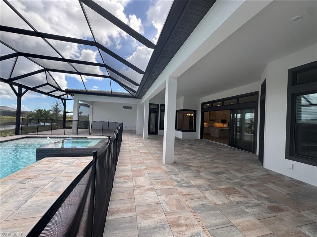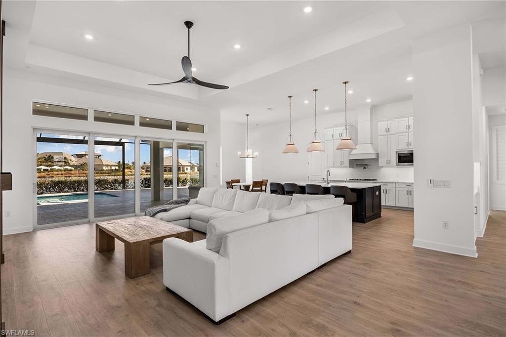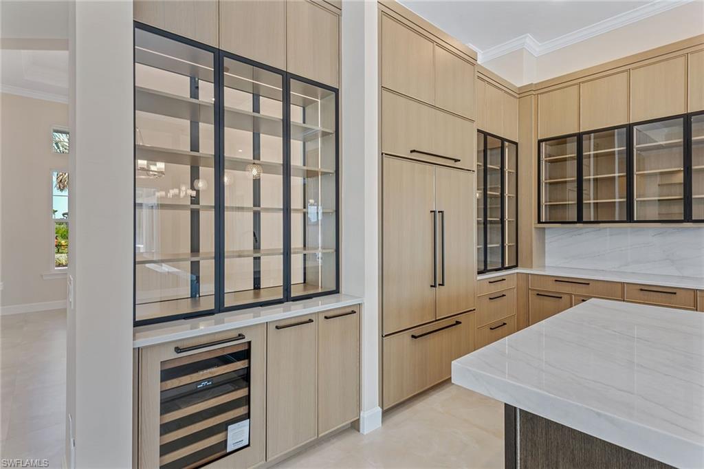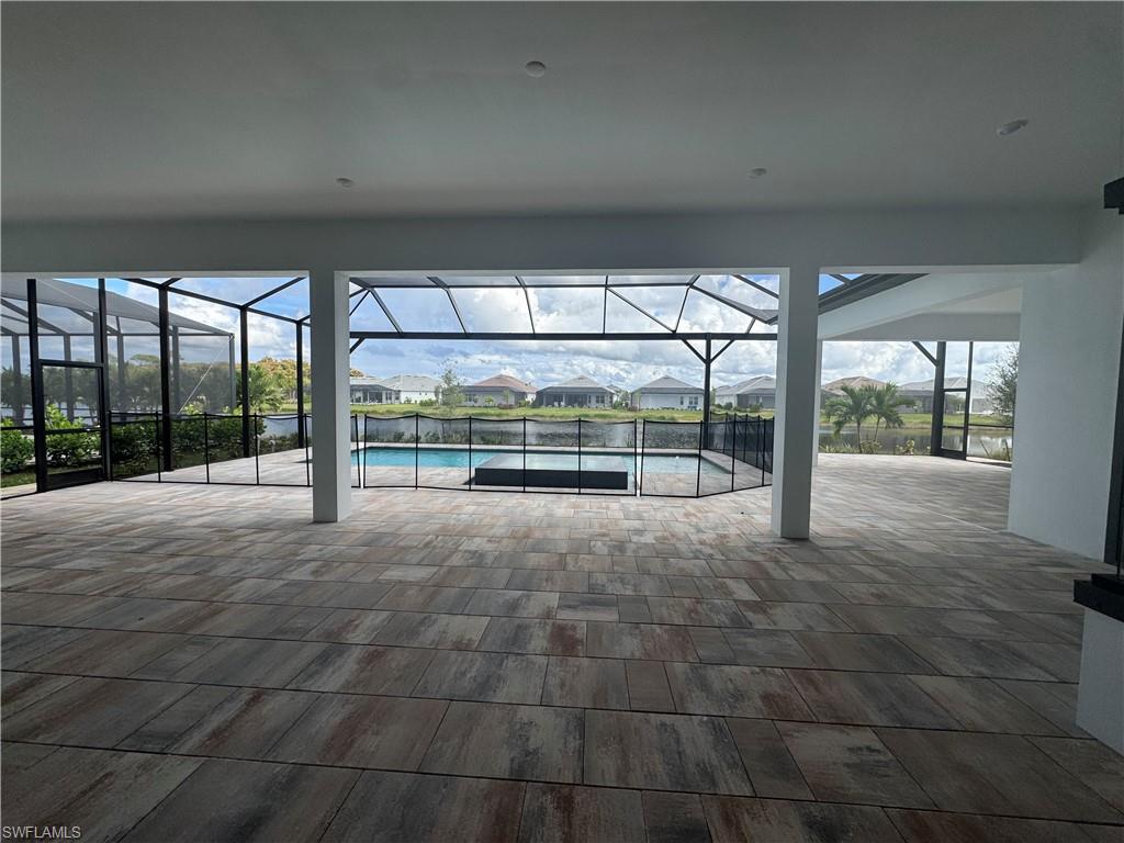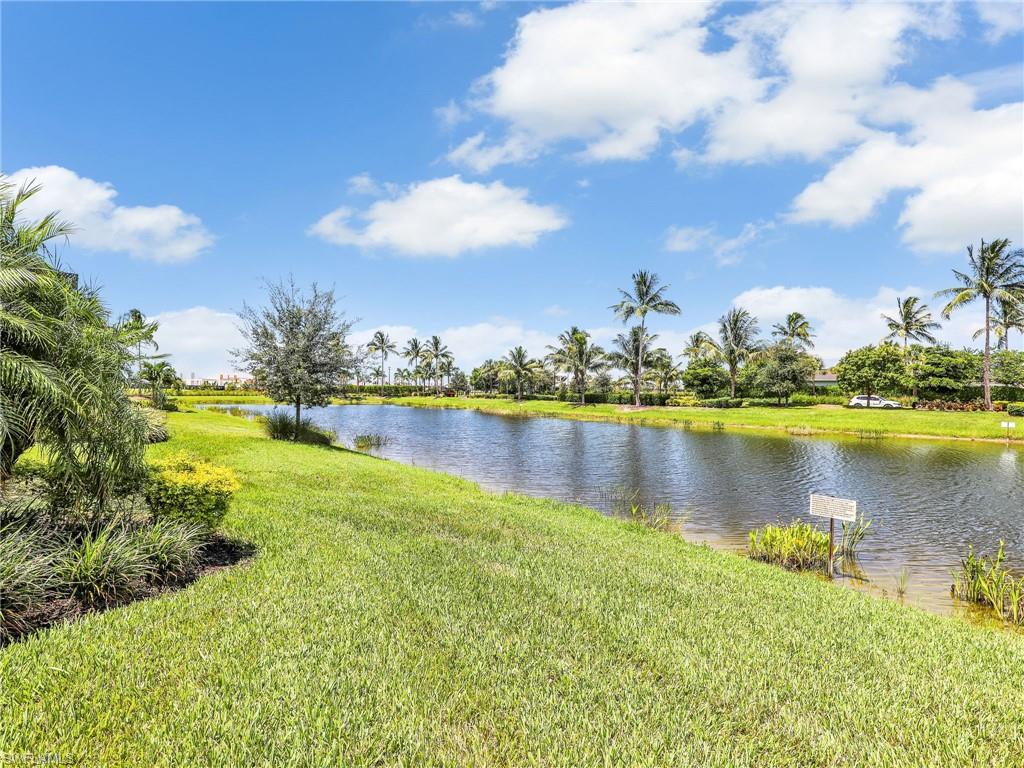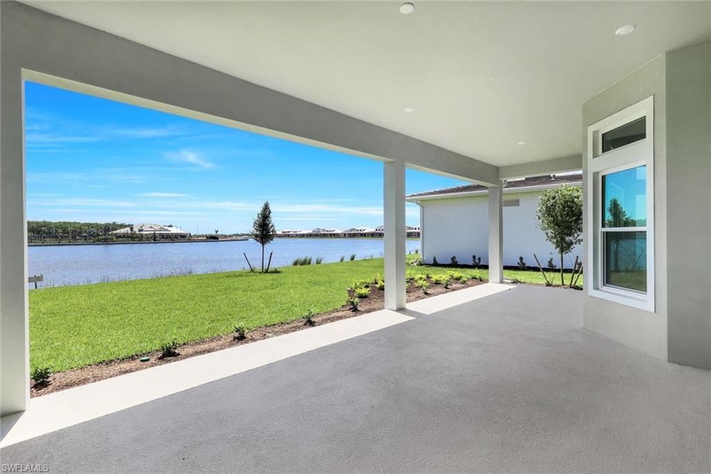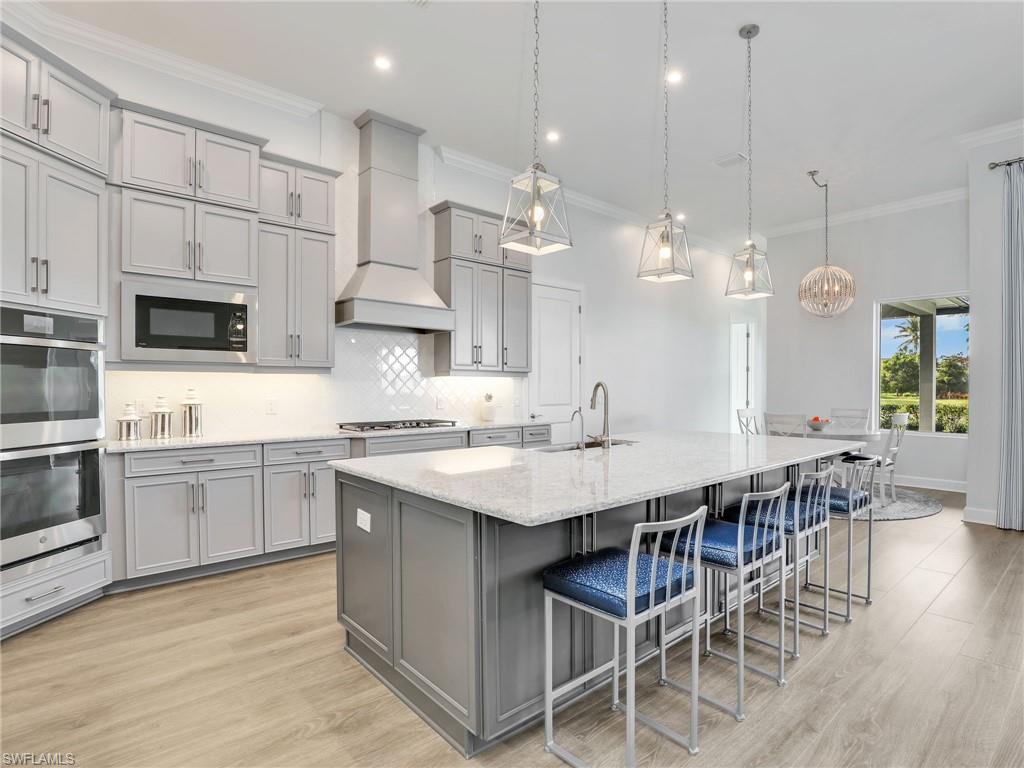 NEWLY BUILT LAKEFRONT POOL HOME WITH UNOBSTRUCTED VIEWS. This 4,500+ sq ft residence sits on a $400K premium lot with long lake views, complete privacy, and no future development across the water. The home impresses from the moment you arrive with an extended paver driveway, upgraded elevation, and hurricane-impact windows and doors. Inside, soaring tray ceilings, wood-beam accents, wainscoting, custom millwork, and wood-like tile floors create a warm, elegant feel. The open great room showcases panoramic lake views, a custom fireplace, built-in TV, and Sonos surround sound. The chef’s kitchen features quartz countertops, a massive island, gas cooktop, double ovens, dual wine coolers, soft-close cabinets, under-cabinet lighting, and a stylish glass-front bar. The first-floor owner’s suite is a private retreat with a bay window overlooking the lake, his/her walk-in closets with built-in cabinetry, and a spa-like bath with quartz counters, dual vanities, and a massive walk-in shower with three shower heads. Each guest bedroom includes an en-suite bath and walk-in closet. Upstairs, the bonus room offers a wet bar, lounge area, a full bath, and an additional guest suite with another full bath attached—perfect for entertaining or hosting guests. The outdoor living space is a true oasis with a gas-heated saltwater pool and spa, panoramic screens, extended lanai space, a full outdoor kitchen with grill, stovetop, sink, fridge, and a dedicated pool bath. Additional highlights include a 3-car epoxy garage, three AC units, tankless water heater, natural gas, generator-ready hookup, and no flood zone. Esplanade by the Islands offers resort-style living with a clubhouse, wine bar, restaurant, tiki bar, fitness center, dog park, and full social calendar—all minutes from Marco Island, Downtown Naples, and Gulf beaches. This home combines custom design, high-end finishes, and a one-of-a-kind lakefront lot—truly a rare find. MAKE AN OFFER TODAY.