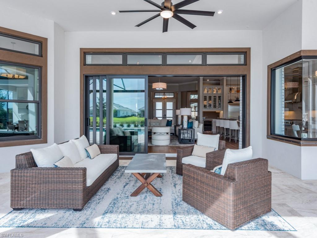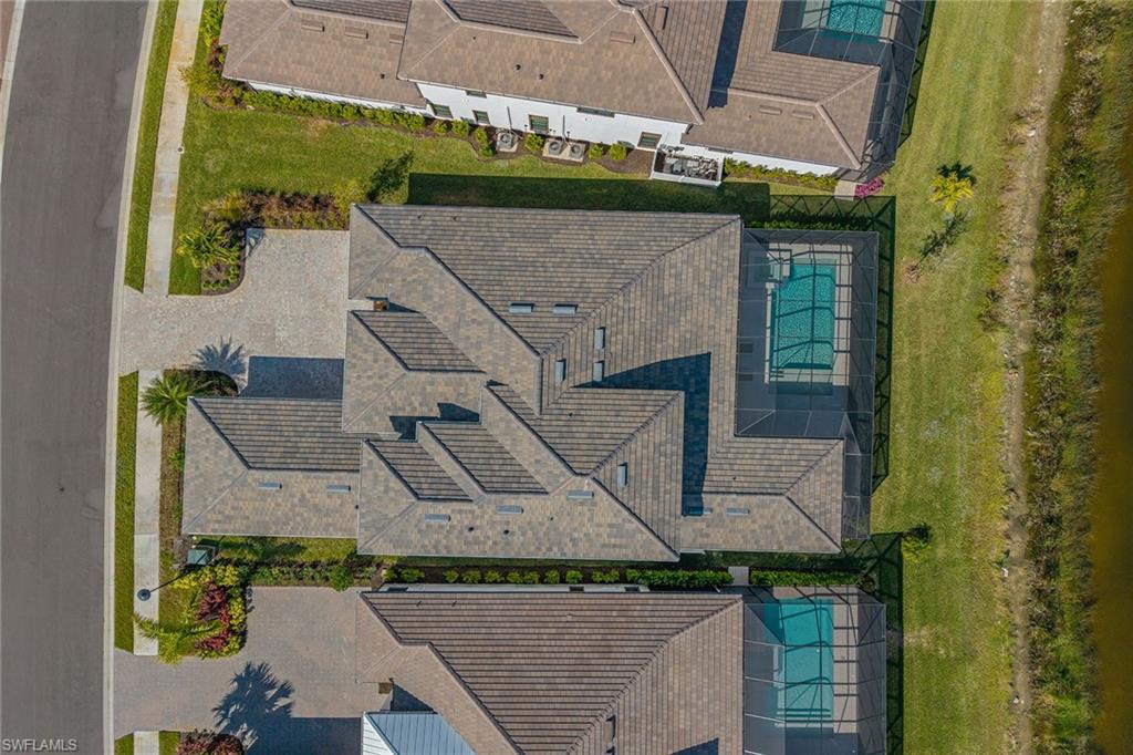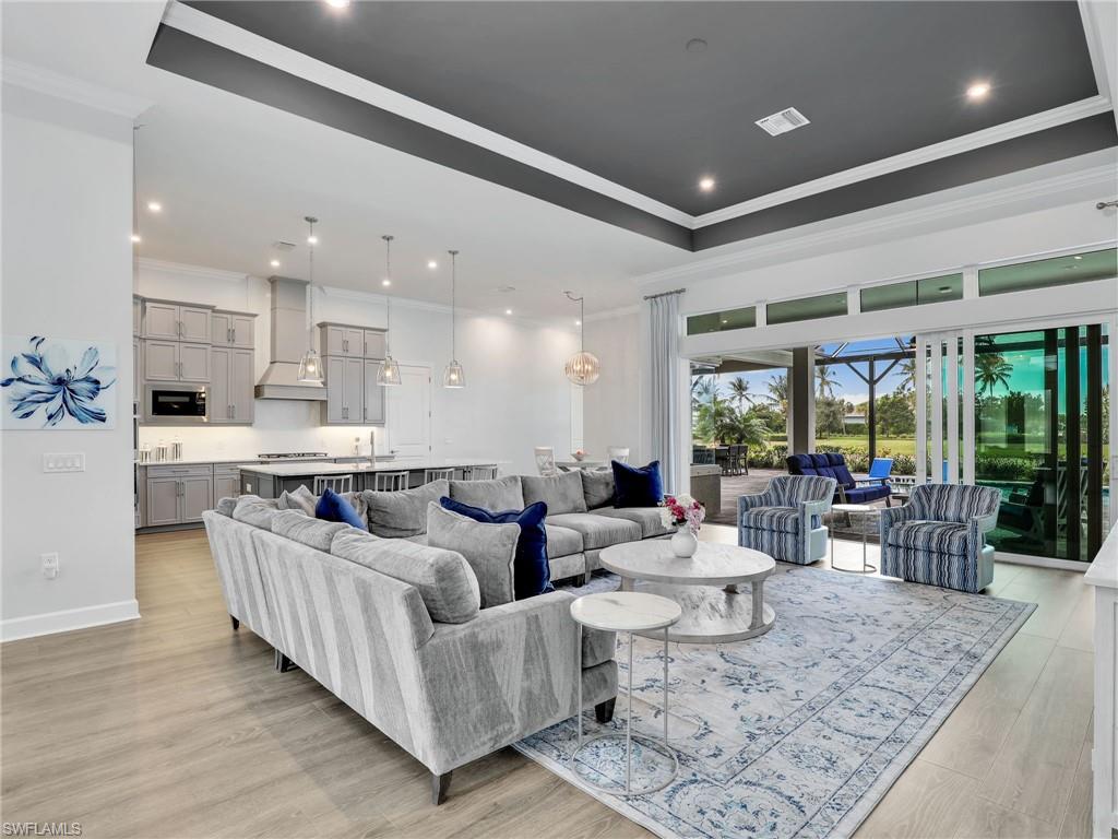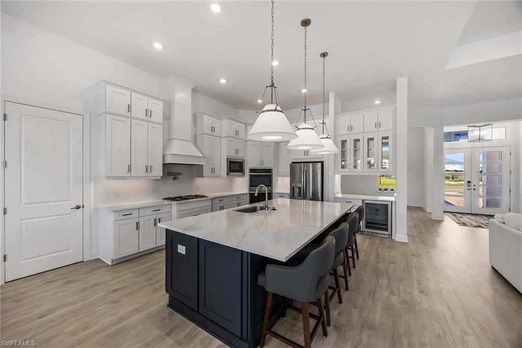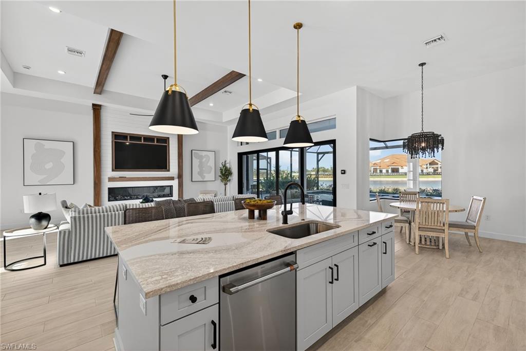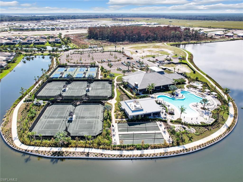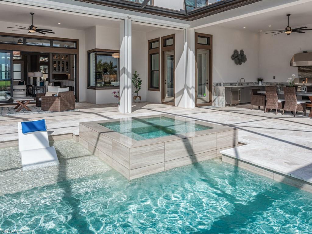NEWLY BUILT LAKEFRONT POOL HOME WITH UNOBSTRUCTED VIEWS. This 4,500+ sq ft residence sits on a $400K premium lot with long lake views, complete privacy, and no future development across the water. The home impresses from the moment you arrive with an extended paver driveway, upgraded elevation, and hurricane-impact windows and doors. Inside, soaring tray ceilings, wood-beam accents, wainscoting, custom millwork, and wood-like tile floors create a warm, elegant feel. The open great room showcases panoramic lake views, a custom fireplace, built-in TV, and Sonos surround sound. The chef’s kitchen features quartz countertops, a massive island, gas cooktop, double ovens, dual wine coolers, soft-close cabinets, under-cabinet lighting, and a stylish glass-front bar. The first-floor owner’s suite is a private retreat with a bay window overlooking the lake, his/her walk-in closets with built-in cabinetry, and a spa-like bath with quartz counters, dual vanities, and a massive walk-in shower with three shower heads. Each guest bedroom includes an en-suite bath and walk-in closet. Upstairs, the bonus room offers a wet bar, lounge area, a full bath, and an additional guest suite with another full bath attached—perfect for entertaining or hosting guests. The outdoor living space is a true oasis with a gas-heated saltwater pool and spa, panoramic screens, extended lanai space, a full outdoor kitchen with grill, stovetop, sink, fridge, and a dedicated pool bath. Additional highlights include a 3-car epoxy garage, three AC units, tankless water heater, natural gas, generator-ready hookup, and no flood zone. Esplanade by the Islands offers resort-style living with a clubhouse, wine bar, restaurant, tiki bar, fitness center, dog park, and full social calendar—all minutes from Marco Island, Downtown Naples, and Gulf beaches. This home combines custom design, high-end finishes, and a one-of-a-kind lakefront lot—truly a rare find. MAKE AN OFFER TODAY.