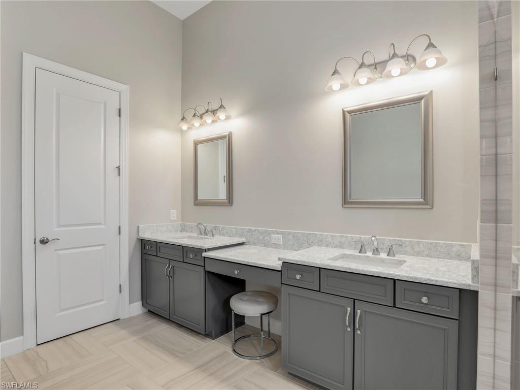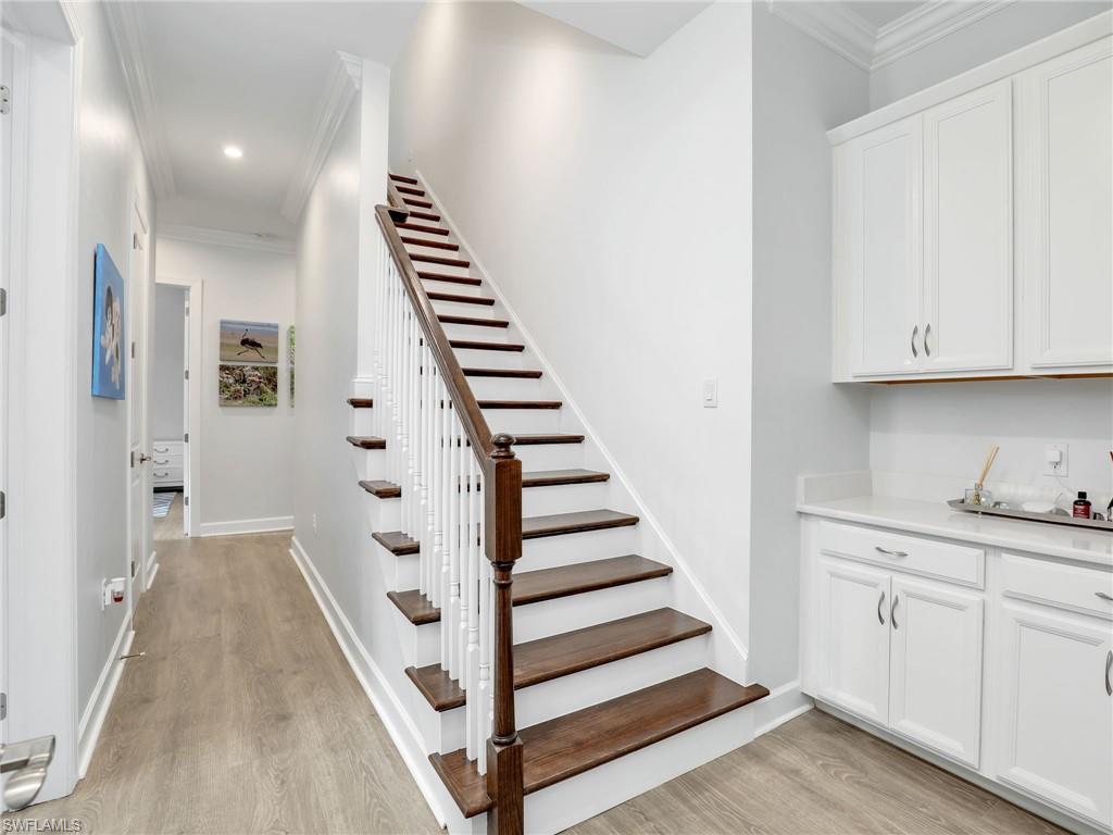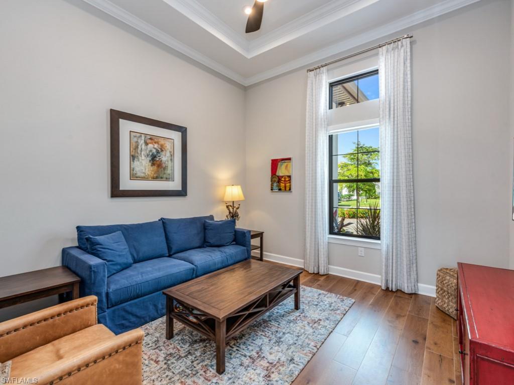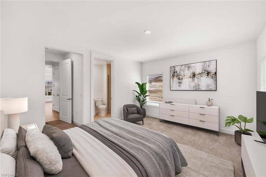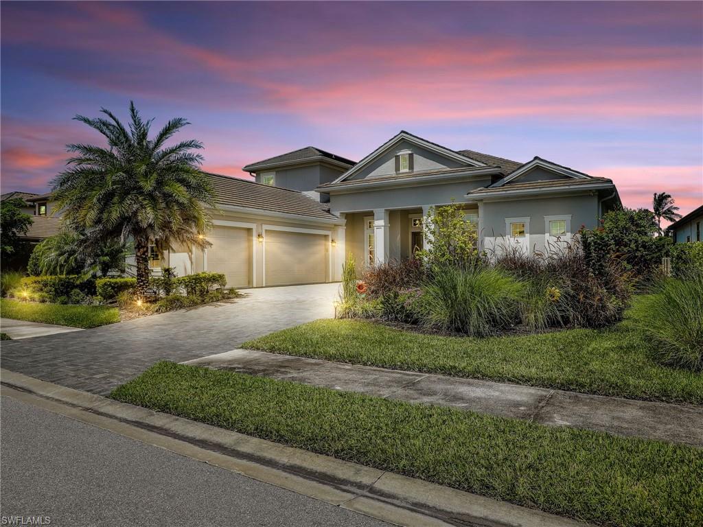 Showcasing a recent $25,000 custom upper-cabinet upgrade, this elegant Beacon with Loft, featuring a refined coastal elevation in timeless hues. Its striking curb appeal opens to a modern floor plan with porcelain tile flooring, 12-foot ceilings, and 8-foot solid-core doors. Impact glass ensures beauty, security, and tranquility. The spacious living area, prepped for a gas or electric fireplace, offers comfort and flexibility. The Chef’s Kitchen boasts shaker cabinetry, under-cabinet lighting, a farmhouse sink, large island, GE Monogram appliances, griddle, and pot filler, 24-inch upper cabinets with glass doors including custom molding will be installed soon. The primary suite features bay window views, two walk-in closets, and a spa-style bath with dual sinks and an oversized dual shower-head shower. Upstairs, the loft includes a private suite, generous living space, and wet bar—ideal for guests or versatile living. Sliding doors lead to a lanai with serene water and palm views, prepped for a custom pool and outdoor kitchen. Nestled in the prestigious Esplanade by The Islands on a prime water lot, the community’s luxurious amenities. Wellness Center, Bahama Bar & Grill, Dog Park, Massage Treatment Room, Fitness Center, Pickleball, Tennis, Bocce Ball, and Resort-Style Pool & Spa with a Culinary Center planned. Enjoy an exceptional upscale lifestyle. Close to dining, shopping, entertainment, downtown Naples, and Marco Island, this home offers refined living. Schedule your private showing today.