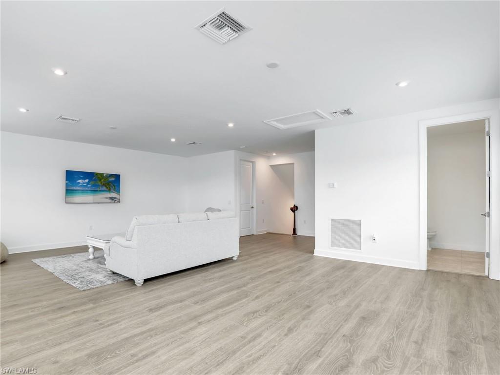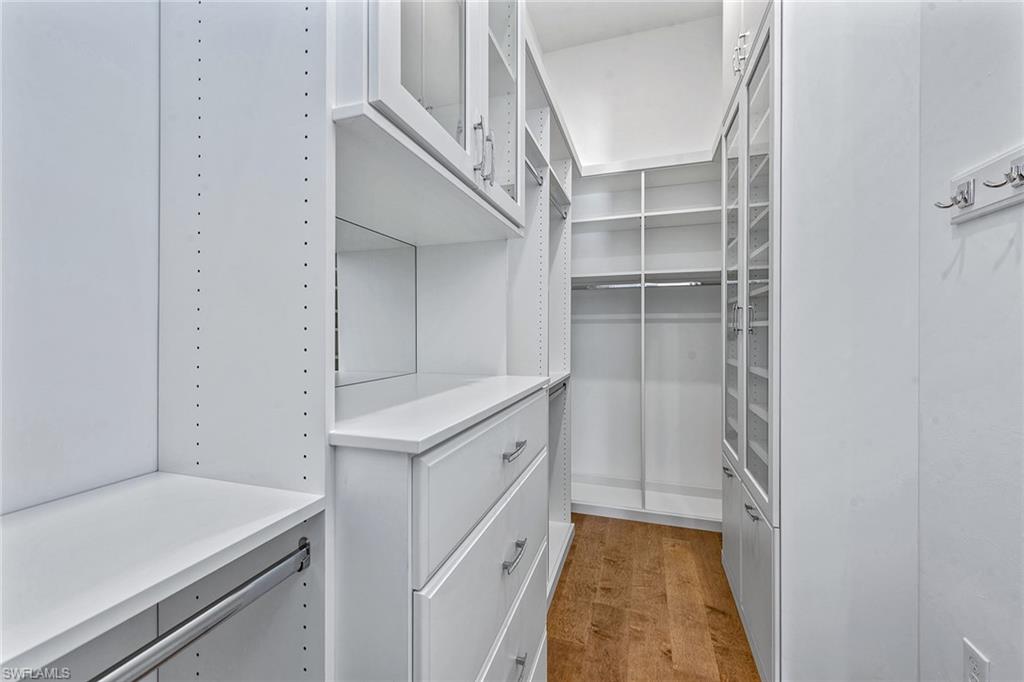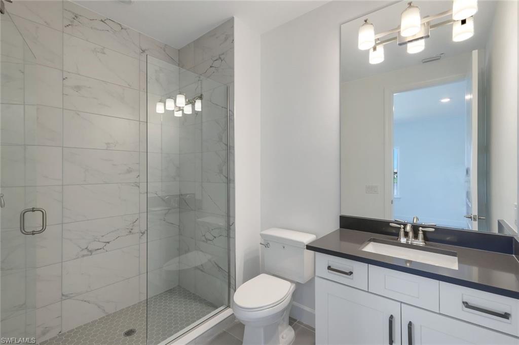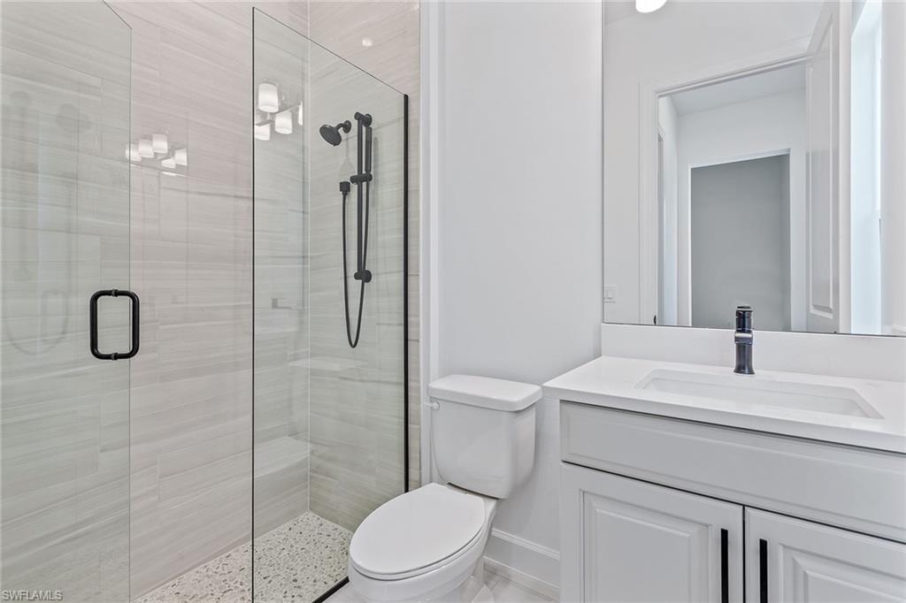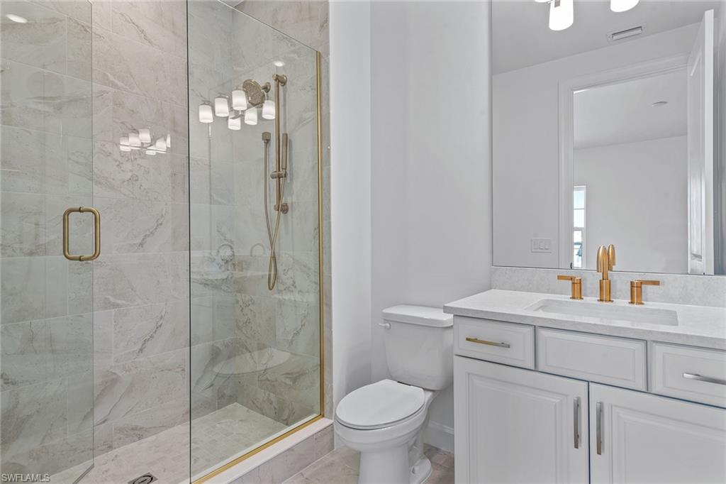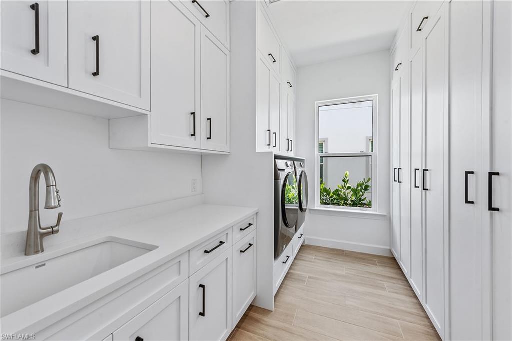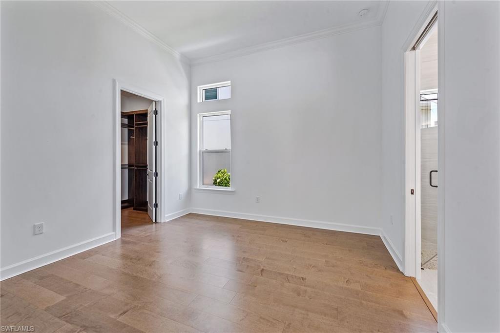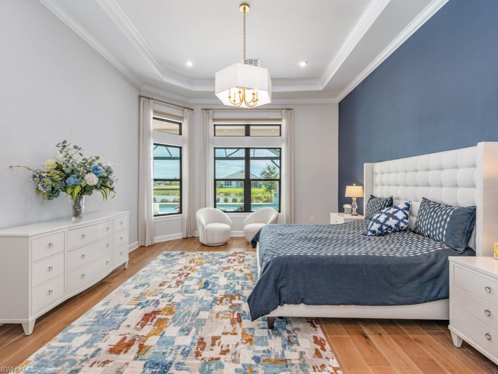 Built in 2024 and showcasing the finest in custom design, this lakefront home in Esplanade by the Islands offers luxurious living with wide, private water views and top-tier finishes throughout. Unlike a standard builder-grade home, every detail has been thoughtfully curated for elegance and function. The flexible floor plan includes four bedrooms, two flex rooms, a den, four and a half baths, and a three-car garage across two levels. The main living areas feature porcelain flooring, soaring ceilings, crown molding, designer lighting, and solid wood interior doors, while custom wood flooring enhances the bedrooms. Every bedroom features a custom-designed closet for optimal organization and luxury. A full security system, smart home wiring, and central vacuum provide modern convenience and peace of mind. The home is built for elegance and durability, featuring a tile roof, hurricane-impact windows and doors, and a wide brick paver driveway that enhances curb appeal and function. The gourmet kitchen impresses with Taj Mahal quartzite counters and backsplash, custom modern cabinetry with in-cabinet lighting, a large center island, and high-end appliances including a 60-inch Wolf dual fuel range with griddle and infrared charbroiler, pot filler, paneled 48-inch Sub-Zero refrigerator and wine cooler, and a paneled dishwasher. A spacious custom pantry adds extra storage, custom cabinetry, counter space and a built-in sink. The breakfast area with a picture corner window overlooks the lake and flows into a grand living room with fireplace, floating shelves and built-in cabinetry. Glass sliders with transom windows open to a serene outdoor space featuring a picture-frame screened lanai, custom Nassau-built pool and spa with waterfall feature, and an imported beveled Italian marble deck. The large covered outdoor living area includes recessed lighting, and all hookups are in place for a future outdoor kitchen, ideal for expanding your entertaining options. The owner’s suite offers lanai access, lake views, double-door entry, tray ceiling, two custom walk-in closets and a spa-like bath with soaking tub, walk-in shower with rain head and bench, dual vanities and full-width mirror. Two guest bedrooms on the main level each have en-suite baths and custom closets, one doubles as a pool bath. A flex room with lake views and lanai access provides space for a fifth bedroom or gym. Upstairs, a spacious media or game room with oak staircase entry, kitchenette with cabinetry, under-cabinet lighting and mini refrigerator, plus a full bath, is complemented by another guest suite with en-suite bath. The den, accessed via French doors, makes an ideal office. A full laundry room includes Samsung washer/dryer, utility sink, custom cabinetry and additional storage. Residents enjoy a resort lifestyle with a private clubhouse, Bahama bar, fitness center, spa, courts, trails and events, just minutes from beaches, golf, dining, and shopping in Naples and Marco Island.