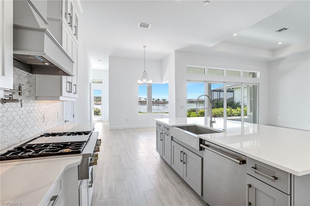 Discover a striking blend of contemporary style and wide-water serenity in this newly completed, fully beautifully furnished and highly upgraded two-story residence in the extremely popular Esplanade by the Islands community. Better than brand new, completed in 2024, this exceptional home was thoughtfully crafted to take full advantage of its expansive lakefront setting, offering sweeping water views from nearly every room. Enhanced with upgraded landscaping, custom lighting, and refined architectural details, it presents an impressive presence from the moment you arrive. With four bedrooms plus a den, four full and two half baths, and a three-car garage, the layout is designed to accommodate both luxurious living and effortless entertaining. Dramatic double-entry doors introduce a light-filled open-concept interior highlighted by elegant volume tray ceilings, designer lighting, transom windows, and extensive millwork. The great room serves as the heart of the home, featuring a shiplap accent wall, built-in fireplace, and pocketing sliders that open seamlessly to the lanai. The chef’s kitchen blends beauty and function with white cabinets, quartz counters, in- and under-cabinet lighting, GE Café stainless appliances, including a natural gas cooktop with pot filler, and a convenient pass-through window to the formal dining area. A spacious island with pendant lighting and the adjoining dining space create an inviting atmosphere for gatherings. French doors lead to the den, a comfortable flex space highlighted by a shiplap feature wall. The primary suite, positioned for privacy, captures tranquil pool and lake vistas and offers direct lanai access, dual walk-in closets, and a spa-like bath complete with a soaking tub, quartz vanities, and a frameless shower. Two additional bedrooms on the main level each feature walk-in closets and their own en-suite baths, with one suite conveniently opening to the pool area. The second floor adds a generous bonus living space ideal for entertaining, highlighted by a sleek wet bar outfitted with quartz counters, a mini refrigerator, microwave, dishwasher, and sink. A powder bath and private guest suite with its own full bath complete the upper level. Outdoor living is one of this home’s most impressive elements. A panoramic screen enclosure frames the expansive lakefront pool and spa area, showcasing a beautiful pool with a sunshelf, and a spacious covered seating area ideal for relaxing or entertaining. The lanai also offers a designated hookup for a future outdoor kitchen, providing the flexibility to customize the space to your ideal alfresco dining experience. Additional features include impact windows and doors, a tankless water heater and three air handlers. Esplanade by the Islands is known for its exceptional amenities such as resort-style pools, pickleball and tennis courts, a state-of-the-art fitness center, a salon and spa, and poolside dining at The Bahama Bar, with the Culinary Center coming soon.