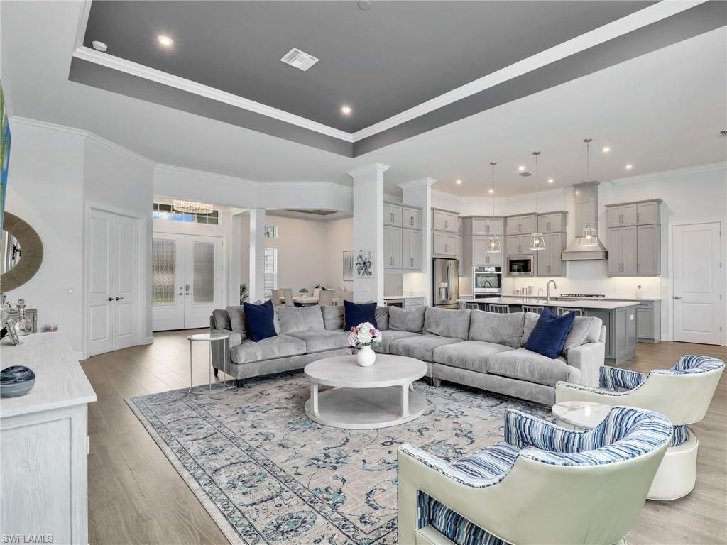Experience modern luxury and breathtaking wide-water vistas from this magnificent newly built and fully furnished two-story residence in the popular gated community of Esplanade by the Islands. Completed in 2024, this better-than-new masterpiece was designed to capture unobstructed lake views from nearly every room-offering a serene and elegant backdrop for everyday living. Exquisite craftsmanship is evident throughout, with extensive millwork, refined finishes, and upgraded landscaping and lighting that elevate its exceptional curb appeal. Featuring four bedrooms plus a den, four full and two half baths, and a three-car garage, this residence seamlessly combines sophistication, comfort and functionality. Go through impressive impact-rated double doors into an open-concept living space highlighted by tray ceilings, designer chandeliers, transom windows and recessed lighting. The great room showcases a shiplap accent wall, built-in fireplace, and expansive glass sliders that open to the lanai for effortless indoor-outdoor living. The gourmet kitchen is a chef’s dream, complete with white shaker cabinetry, in- and under-cabinet lighting, quartz counters, white subway tile backsplash, dual beverage refrigerators and GE Café stainless appliances, including a natural gas cooktop. A large island with pendant lighting and an adjacent dining area create an inviting space for gatherings. The den, accented with French doors and a shiplap feature wall, offers a private workspace or cozy retreat. The primary suite is a peaceful sanctuary with panoramic pool and lake views, lanai access, dual walk-in closets and a spa-inspired bath featuring a soaking tub, dual quartz vanities and a frameless glass shower. Two main-level guest suites each offer walk-in closets and beautifully appointed en-suite baths, one with pool access. Upstairs, a spacious loft serves as an additional living and entertainment area, complete with a sleek wet bar featuring quartz counters, GE stainless appliances (mini refrigerator, dishwasher, microwave and sink), and an adjacent powder bath. A private guest bedroom with en-suite bath completes this level, providing a comfortable retreat with stunning lake views. The outdoor living area is an entertainer’s dream. Enjoy a panoramic screen enclosure, paver-tiled lanai, and a covered seating area with tongue-and-groove ceiling, recessed lighting, and a full outdoor kitchen complete with quartz counters and backsplash, grill, double-drawer refrigerator and island seating. Additional highlights include a wide brick-paver driveway, impact-resistant doors and windows, a tankless natural gas water heater, three Lennox air handlers, and a climate-controlled three-car garage with epoxy flooring, natural light and an air-conditioning mini split. Residents enjoy resort-style amenities, including a pool and spa, fitness center, pickleball and tennis courts, salon and spa services, and poolside dining at The Bahama Bar, with Culinary Center coming soon.