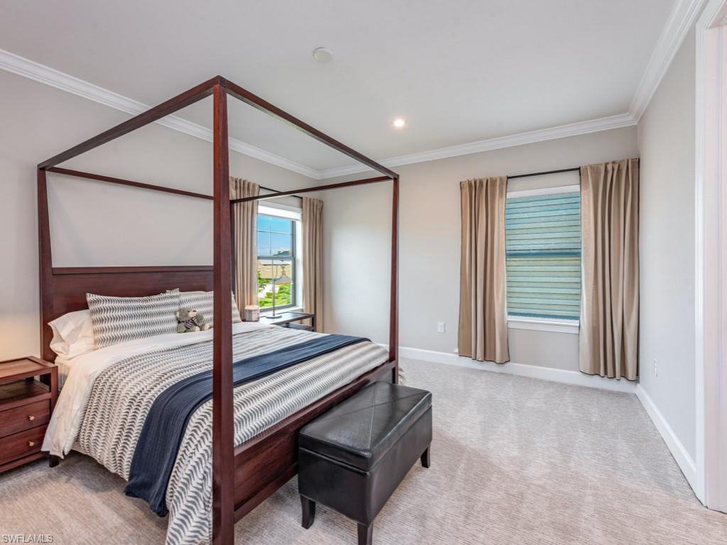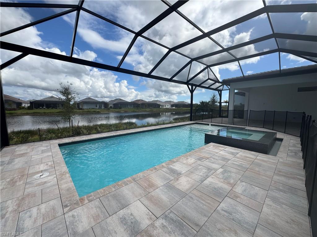 Waterfront with wide water views come with this luxurious four-bedroom, six-bath Beacon model home in the sought-after Esplanade by the Islands community. This new two-story home sits on a fantastic large water-view lot, that shows like a model with so much coastal allure! Complete with a custom-designed heated saltwater pool and spa featuring marble decking and a panoramic screened lanai. Additional bonus room upstairs complete with a wet bar for entertaining! Professionally decorated with high-end finishes including custom-made plantation shutters, upgraded kitchen cabinetry, built-in appliances and quartz countertops throughout! Featuring hurricane-impact windows, sliders and doors. Enjoy all the amenities at Esplanade by the Islands, which include a beautiful resort-style pool, restaurant, pickleball, tennis and fitness center. Just minutes to 5th Avenue's restaurants, shopping and beaches!