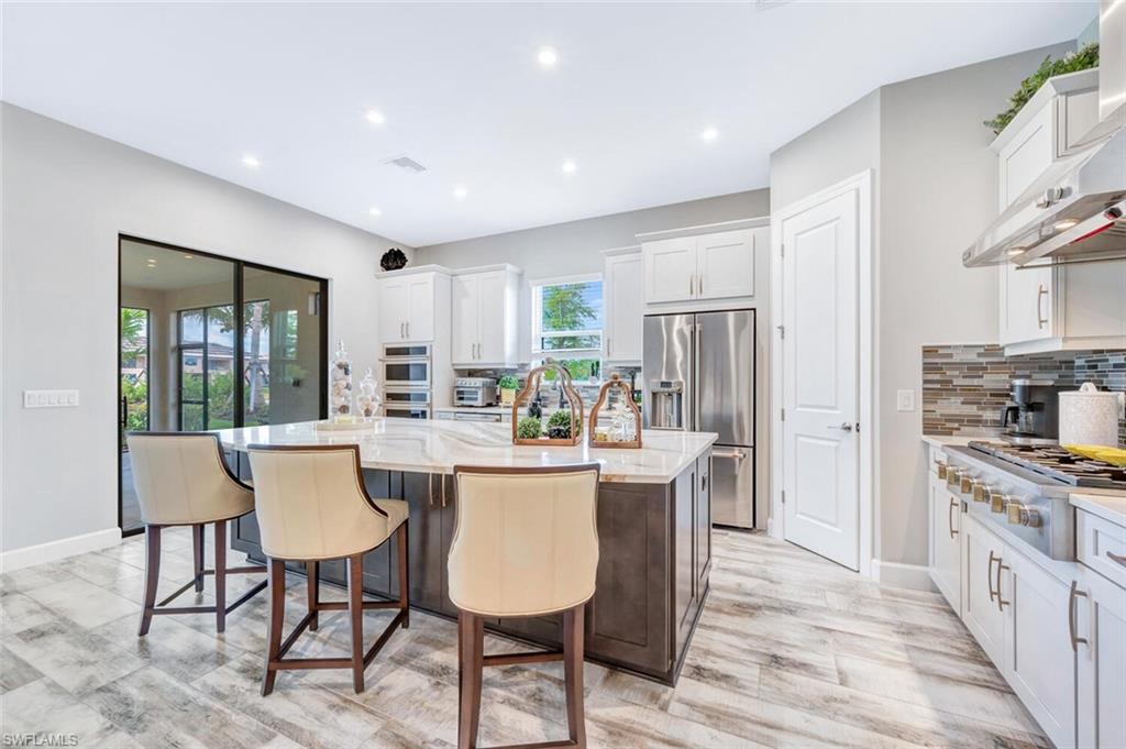 This property is located in an X Zone. WE have a LOMR letter. This brand new, immaculate home is perfectly positioned at the end of a quiet cul-de-sac, featuring an extra long driveway and the highly sought-after Lazio floor plan. The upgraded gourmet kitchen impresses with an oversized eat-in island with knee-wall cabinetry for added storage, a veggie prep sink, French door oven, natural gas cooking, and a breakfast nook extension. The open-concept great room showcases stacked sliders that seamlessly connect to the outdoor living area, complete with a covered lanai, privacy wall, and a summer kitchen, ready for a custom outdoor bar. The primary suite includes a cozy sitting area and luxurious finishes, while engineered wood floors add warmth to the primary and guest bedrooms. Additional highlights include a sleek snakeskin-fleck epoxy garage floor. Enjoy spectacular sunset views and world-class amenities at Esplanade by the Islands, including a resort-style lap pool, Bahama Bar, tennis, pickleball, state-of-the-art fitness center, full-service spa, and salon. Ideally located between Marco Island and downtown Naples, this home offers the best of both worlds, just 20 minutes to the pristine beaches of Marco and the dining and shopping of 5th Avenue.