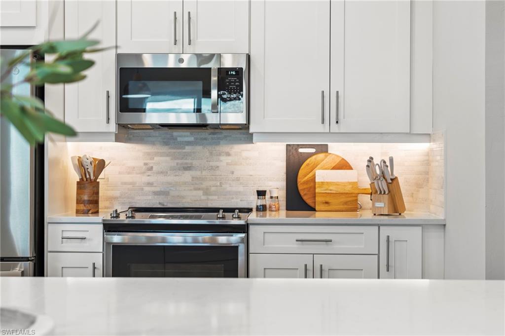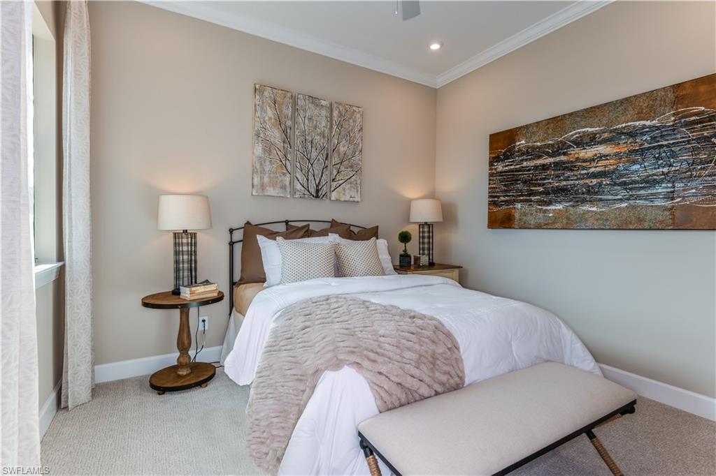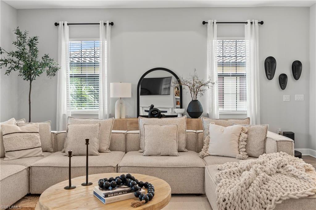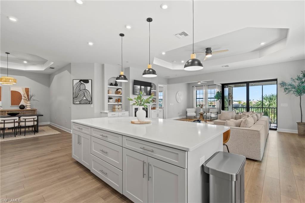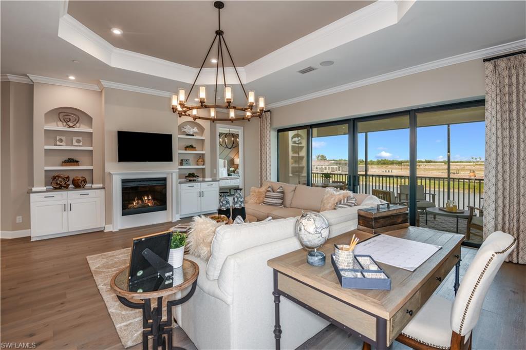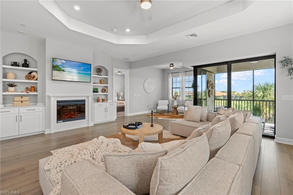 Live the resort lifestyle in this beautifully upgraded end-unit Marano model, filled with natural light and showcasing peaceful, private lake views in the desirable Esplanade by the Islands. Built in 2020 and enhanced with thoughtful custom upgrades, this ground-floor carriage home offers two spacious bedrooms plus a den and two-and-a-half baths, designed for modern comfort and effortless elegance. The open-concept living area features luxury plank flooring, crown molding, recessed lighting and a custom entertainment wall with built-in cabinetry, floating shelves and a cozy fireplace. The gourmet kitchen impresses with premium stainless steel appliances, 42-inch level 5 soft-close cabinetry, quartz countertops, upgraded backsplash and custom rollouts. Recessed lighting and a spacious breakfast bar seamlessly connect the kitchen to the main living space, creating an ideal setting for entertaining. Zero-corner sliders expand the living area outdoors to the screened lanai, where wide water views create a stunning backdrop. The owner’s suite is a serene retreat with a tray ceiling, custom accent wall, tranquil lake views and a spa-like bath featuring dual quartz vanities with a makeup area, a frameless walk-in shower with bench, and a large walk-in closet with custom built-ins. The private second bedroom includes its patio and an en-suite bath with a shower/tub combination. A separate powder bath and a versatile den, ideal for a home office or study, enhance the thoughtful floor plan. Additional conveniences include impact-resistant windows and doors, and a private one-car garage. Residents of Esplanade by the Islands enjoy world-class amenities including a resort-style pool with towel service, lap pool, Bahama Bar & Grill, spa and salon, tennis and pickleball courts, fitness center, satellite community pool, outdoor barbecue area, fire pit, dog park and the soon-to-open culinary center. Just minutes from Marco Island’s and Naples pristine beaches and lively downtown, filled with top-tier dining, boutique shopping and arts venues, which are just minutes away, offering a blend of relaxation and sophistication.