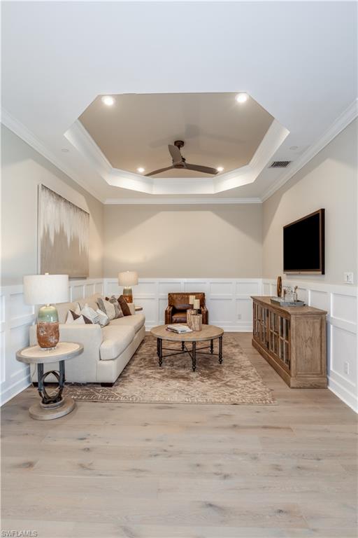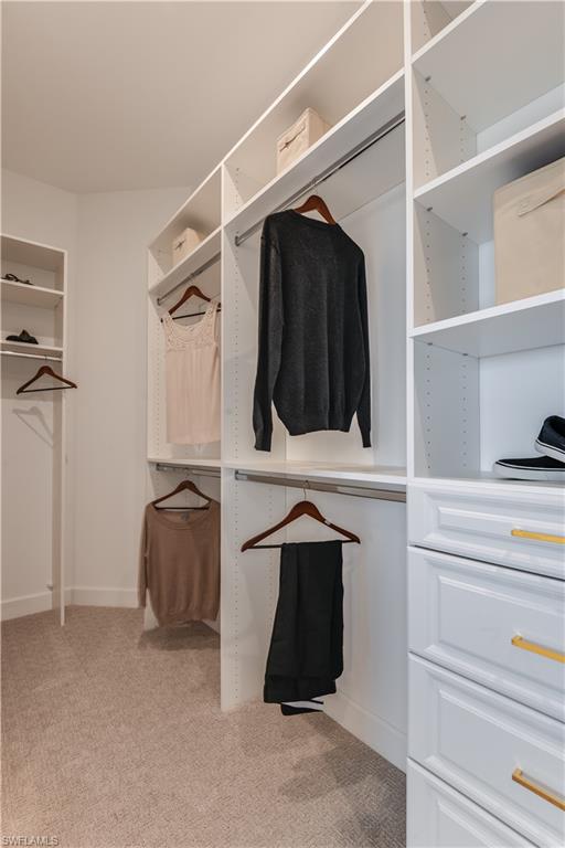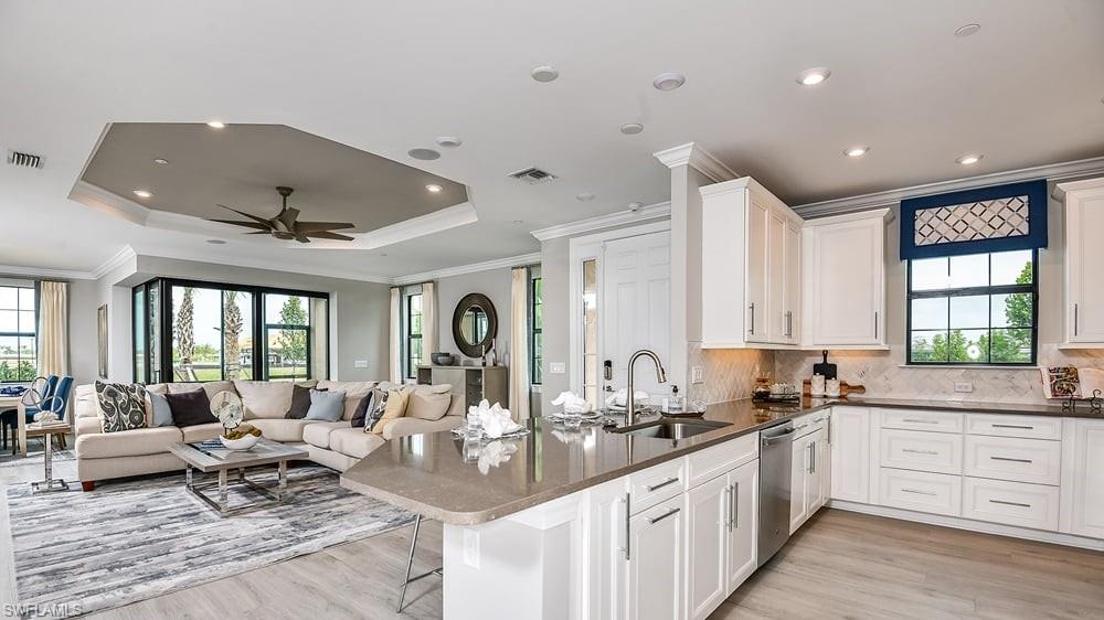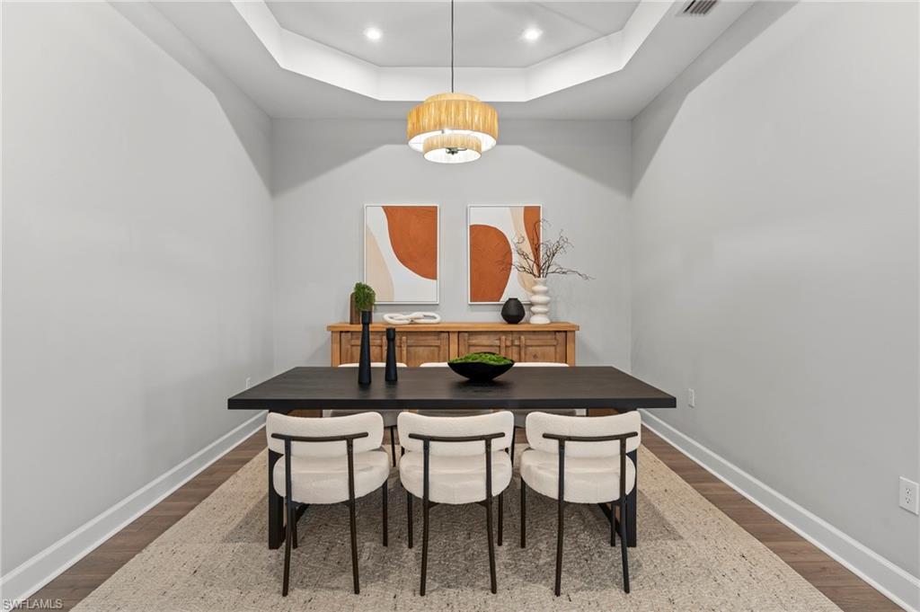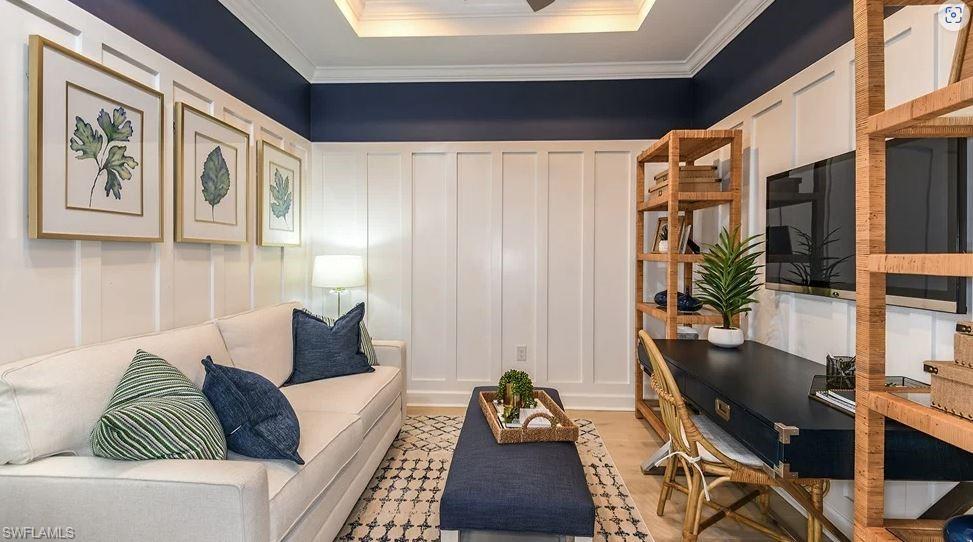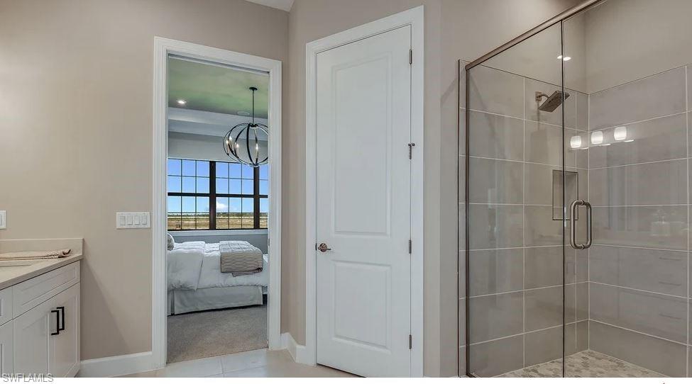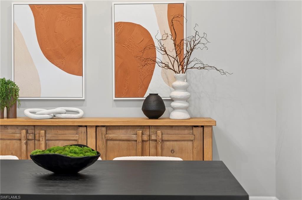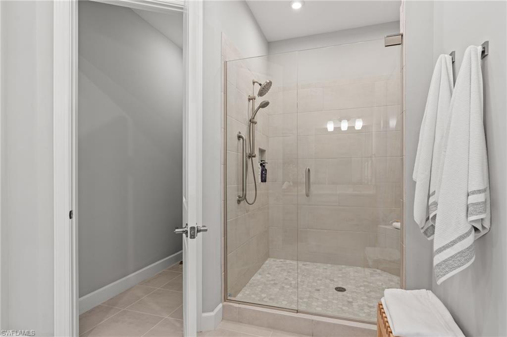 Live the resort lifestyle in this beautifully upgraded end-unit Marano model, filled with natural light and showcasing peaceful, private lake views in the desirable Esplanade by the Islands. Built in 2020 and enhanced with thoughtful custom upgrades, this ground-floor carriage home offers two spacious bedrooms plus a den and two-and-a-half baths, designed for modern comfort and effortless elegance. The open-concept living area features luxury plank flooring, crown molding, recessed lighting and a custom entertainment wall with built-in cabinetry, floating shelves and a cozy fireplace. The gourmet kitchen impresses with premium stainless steel appliances, 42-inch level 5 soft-close cabinetry, quartz countertops, upgraded backsplash and custom rollouts. Recessed lighting and a spacious breakfast bar seamlessly connect the kitchen to the main living space, creating an ideal setting for entertaining. Zero-corner sliders expand the living area outdoors to the screened lanai, where wide water views create a stunning backdrop. The owner’s suite is a serene retreat with a tray ceiling, custom accent wall, tranquil lake views and a spa-like bath featuring dual quartz vanities with a makeup area, a frameless walk-in shower with bench, and a large walk-in closet with custom built-ins. The private second bedroom includes its patio and an en-suite bath with a shower/tub combination. A separate powder bath and a versatile den, ideal for a home office or study, enhance the thoughtful floor plan. Additional conveniences include impact-resistant windows and doors, and a private one-car garage. Residents of Esplanade by the Islands enjoy world-class amenities including a resort-style pool with towel service, lap pool, Bahama Bar & Grill, spa and salon, tennis and pickleball courts, fitness center, satellite community pool, outdoor barbecue area, fire pit, dog park and the soon-to-open culinary center. Just minutes from Marco Island’s and Naples pristine beaches and lively downtown, filled with top-tier dining, boutique shopping and arts venues, which are just minutes away, offering a blend of relaxation and sophistication.