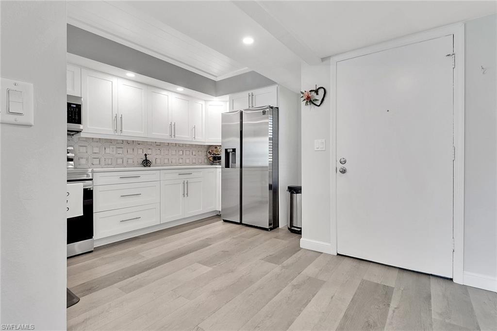 PRICE REDUCTION! This rarely available and fully updated 1st-floor corner unit offers breathtaking golf course views from every window. Located in a 2-story building with no steps, this home is situated in Forest Lakes, a vibrant 55+ community featuring three pools, tennis courts, a clubhouse, and a full calendar of social activities. HOA fees include WiFi and cable TV. The home features a modern, European-style kitchen with stainless steel appliances, a wine cooler, sparkling quartz countertops, and a top-of-the-line backsplash. Washer and dryer are located in the unit. Impact-resistant windows and shutters throughout. New A/C unit and hot water heater. Freshly painted interior. The primary and guest bathrooms have been beautifully updated with modern finishes. Enjoy additional outdoor living space in the screened-in lanai with extended decking, surrounded by lush landscaping designed for privacy. A stylish new front door opens to a charming outdoor sitting area – perfect for welcoming guests and chatting with neighbors. Forest Lakes is centrally located – just minutes from shopping, dining, and entertainment. Seagate Beach public access, Waterside Shops, Artis–Naples, the Baker Museum, and other major attractions are within a 1–2 mile radius. This unit is vacant, easy to show, and completely move-in ready. A must-see. Seller will consider owner financing or rental – see confidential remarks. Appraised at $275,000 – home inspection completed.