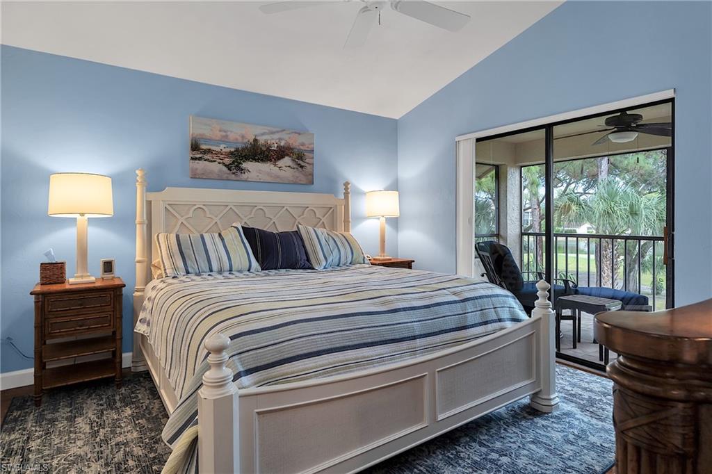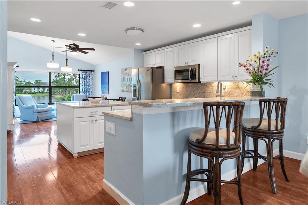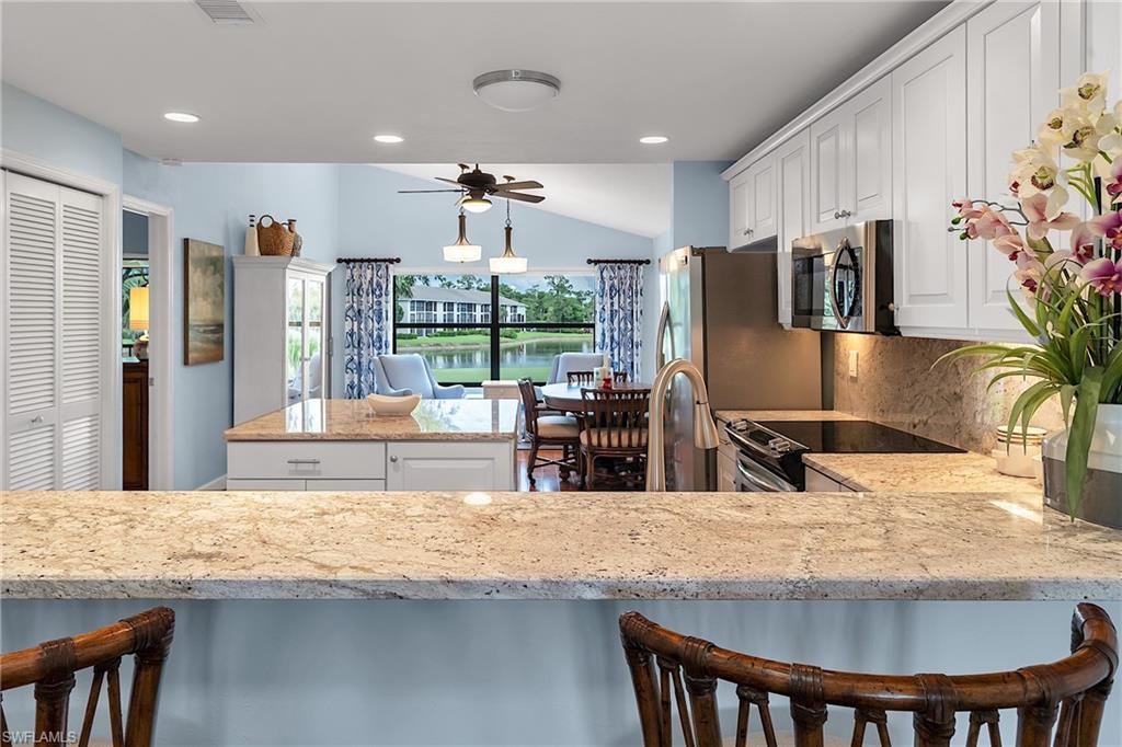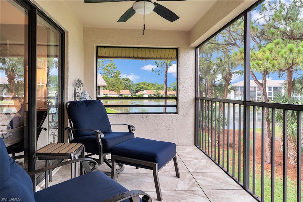 Expansive golf course view over the 1st hole of the red course and driving range. Very well-maintained 2nd floor condo with thoughtful updates. Granite kitchen with stainless steel appliances and light cabinets. Living area featuring vaulted ceiling with skylights, granite dry-bar, spacious screened balcony with active view. Enjoy a laundry room with storage, open balcony off breakfast room, located steps to the community pool and tennis courts. All residents enjoy the active Fox Fire lifestyle 27 holes of championship golf, a driving range, a fully equipped fitness center, a clubhouse with a restaurant, and clay tennis courts. Just minutes from downtown Naples and the spectacular Gulf beaches. This unit offers you the best of Naples from Gulf to Golf!