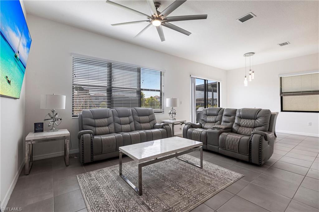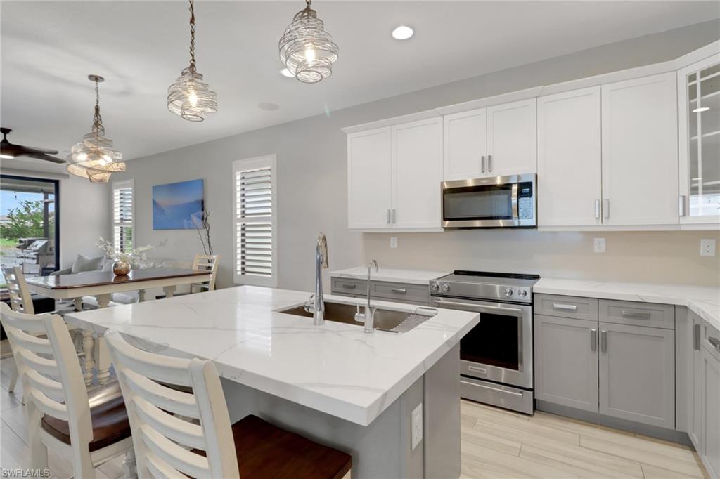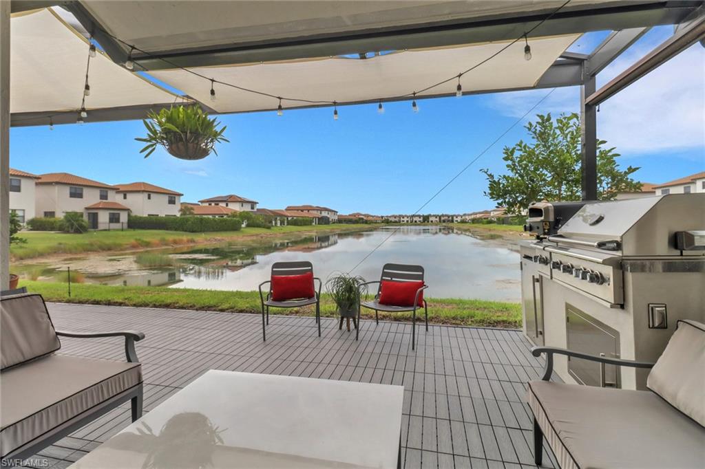 Welcome to Your Lakeview Dream Home in Fronterra! Experience modern comfort, thoughtful upgrades, and exceptional value in this beautifully maintained 2-bedroom plus den, 2-bath single-family home located in the highly desirable gated community of Fronterra. Offering newer construction, low HOA fees, and no flood insurance requirement, this move-in-ready home stands out as the best-priced property in the community. Step inside to an inviting open-concept layout with high ceilings, wood-look tile flooring throughout, and abundant natural light. The kitchen is a showstopper, featuring quartz countertops, oversized cabinetry, stainless steel appliances, and an upgraded reverse osmosis (RO) water system, paired with a whole-home water softener. Elegant plantation shutters throughout the home add a timeless, upscale touch. Other notable interior features include a tankless water heater and impact windows for energy efficiency and peace of mind. Outdoor living is equally impressive, with an extra-large screened-in lanai overlooking tranquil lake views, perfect for morning coffee or evening gatherings. A screened porch enclosure adds comfort and usability, while the outdoor kitchen and brand-new composite back deck (completed in 2025) make this space ideal for entertaining. The exterior of the home was freshly repainted in August 2025, enhancing its already strong curb appeal. Additional features include a tile roof, 1-car garage, and access to the resort-style community pool and cabana, all included in the super low monthly HOA fees (which also cover irrigation water and gated security). Ideally located just 1 mile from I-75, this home offers quick access to downtown Naples, world-class beaches, shopping, dining, and the nearby Paradise Coast Sports Complex. Combining style, location, and affordability, this upgraded home is a rare opportunity in one of Naples' most convenient communities. Don’t miss your chance to make it yours—schedule your private showing today!