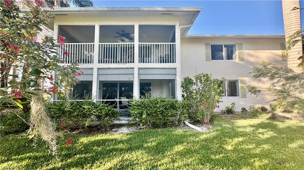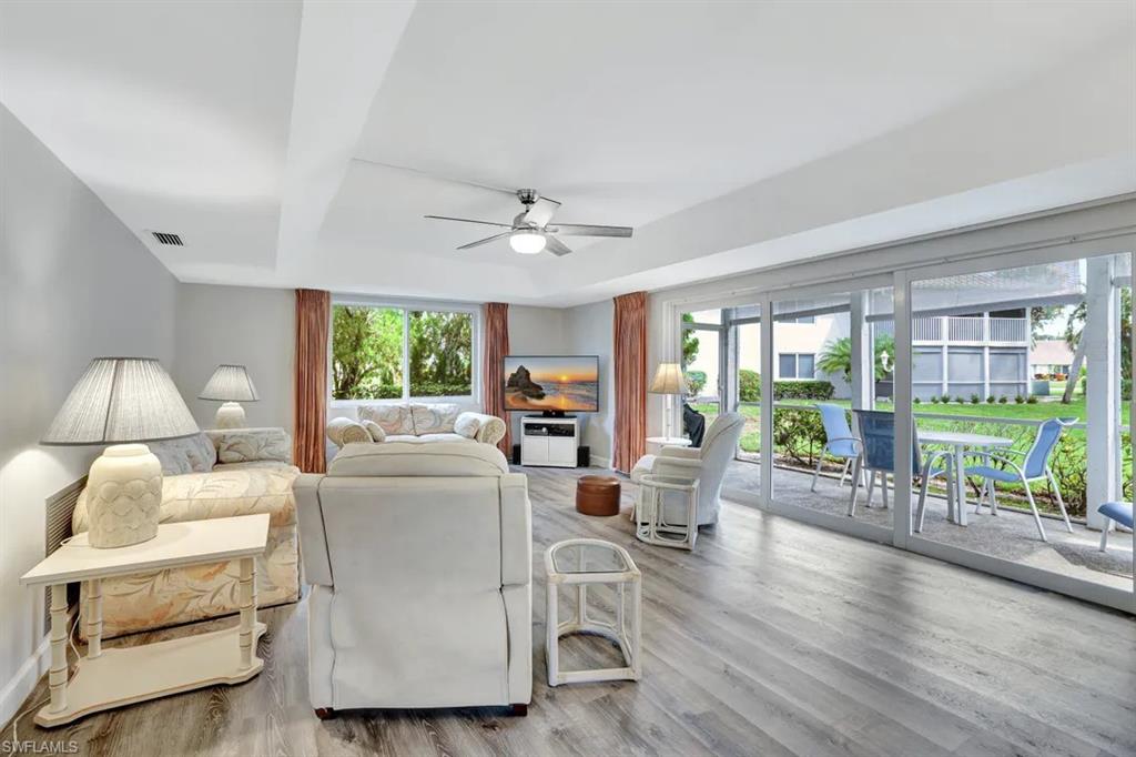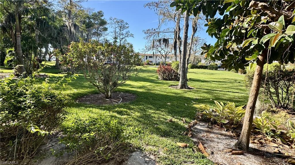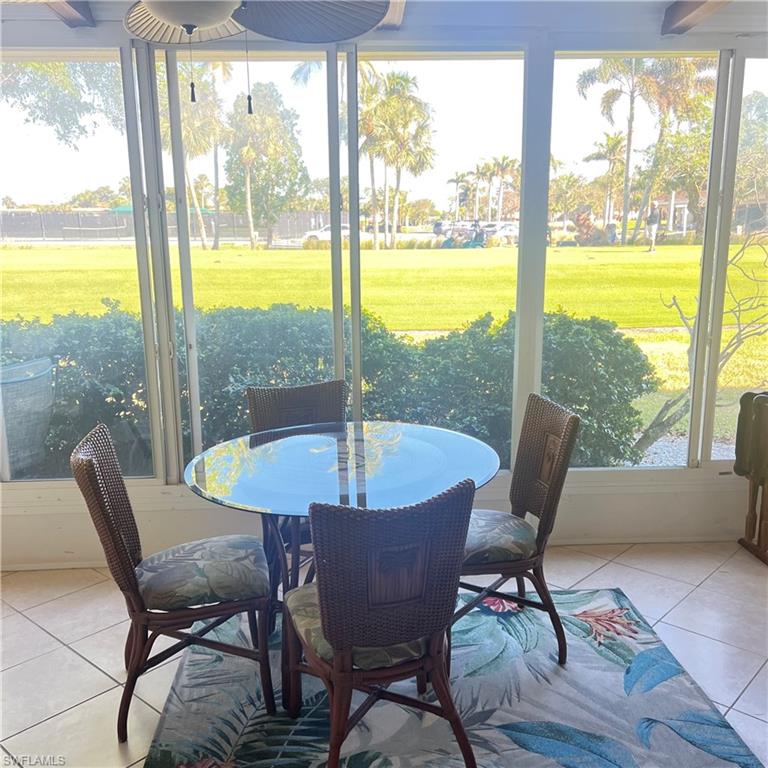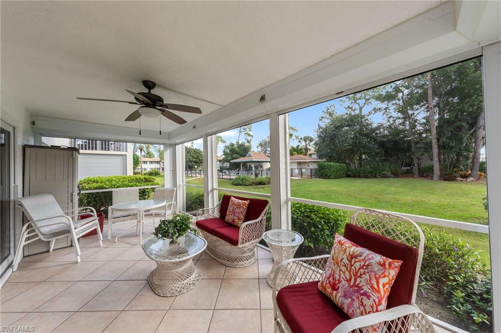 New Price Improved! Don't miss this peaceful and charming 2-bedroom, 2-bathroom furnished condo on the FIRST FLOOR and only steps from the pool, library, and art room. This cozy condo is ready to move in, and it features impact-resistant doors and windows, hurricane and plantation shutters, Corian countertops in the kitchen and bathroom, stainless steel appliances, modern custom glass closets, and an updated HVAC system. The foyer, bathrooms, kitchen, and lanai flooring are all updated with ceramic tile. Relax and appreciate the peaceful view of the beautiful landscaping from the lanai. Enjoy the community amenities, including two 18-hole golf courses - The Palmett and The Pines Course, bocce ball, clubhouse, car wash, library, six tennis courts, internet, cable, pickleball, complete grounds and maintenance, and nine heated pools. It is conveniently located just 10 minutes from Fifth Avenue, where you can explore a selection of upscale boutiques and fine dining near beautiful white sandy beaches, restaurants, movie theaters, hospitals, schools, and great shopping.