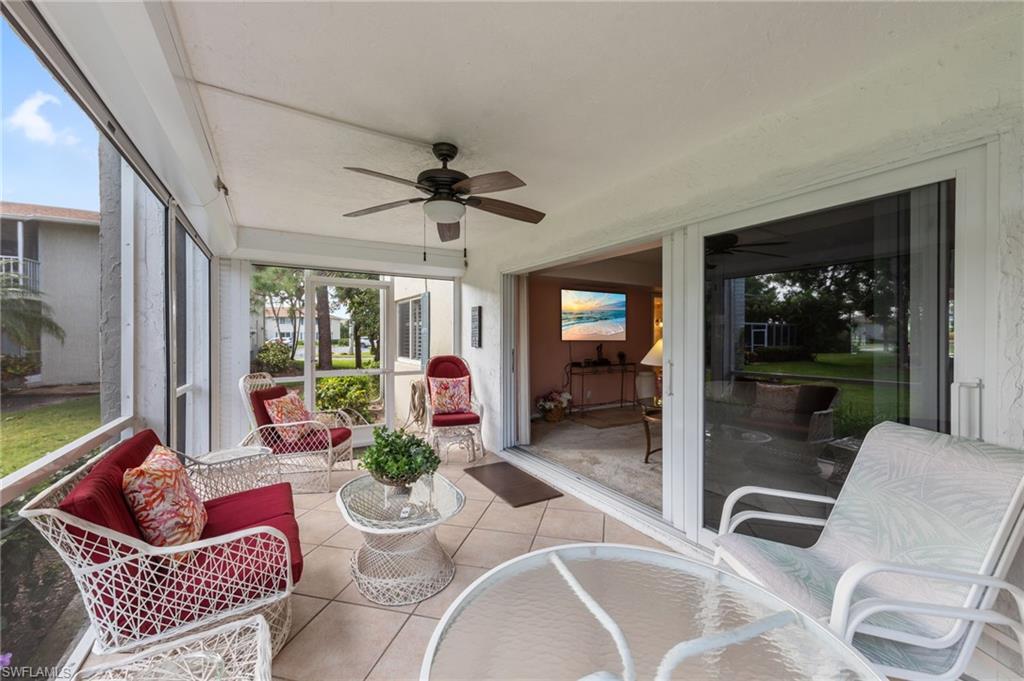 The BEST location @ the Glades! Featuring beautiful turnkey condo, UPDATED eat in kitchen, 2 bedrooms, 2 full updated bathes. The glass and screened enclosed lanai over looking Gordon Lewis designed golf course adds approx 250sf of living area. The unit also features an extra large storage closet for beach chairs etc. A short 2 minute walk to new tennis and pickle ball courts, bocce, shuffleboard, 19th Hole restaurant, Clubhouse and Pro Shop. There are 9 swimming pools throughout the community. All located just 10 minutes to famous downtown 5th Ave and the white sand beaches of Naples.