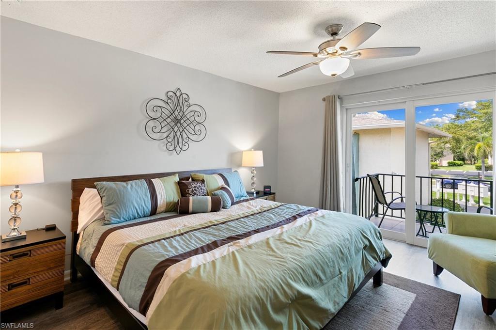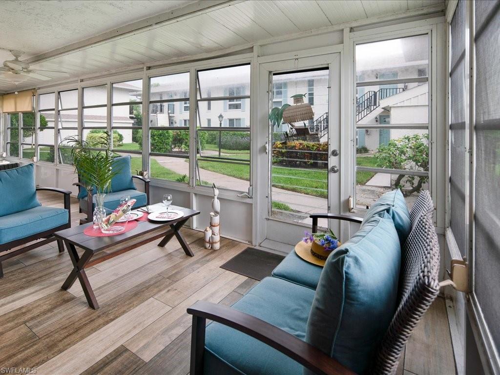 Seller motivated / bring offer! Turnkey furnished quiet first floor 2 bed/2 bath end unit for sale at the Glades Golf & Country Club - Bundled Golf included in HOA Fees. The condo comes with many updates such as complete master & guest bath remodel in 2019, hurricane impact front door 2021 and high impact windows and sliders in 2013, new A/C in 2023. The unit offers a nice sized glass enclosed lanai with newer wood like tile flooring. Small storage comes with the condo. Included in the HOA fees are water & sewer, cable tv & wifi internet, a bundled golf-membership for 2 beautiful newly Gordon Lewis designed golf courses in walking distance to "The 19th Hole" onsite Restaurant, golf, tennis and pickle ball courts, 9 pools, shuffle board, vehicle wash station, craft room, library, pro shop, everything only 10 minutes to Naples beaches, shopping & restaurants on famous 5th Ave South. Walk to public transportation & shopping. The condo is in walking distance to pro shop, clubhouse & the main pool with restaurant.