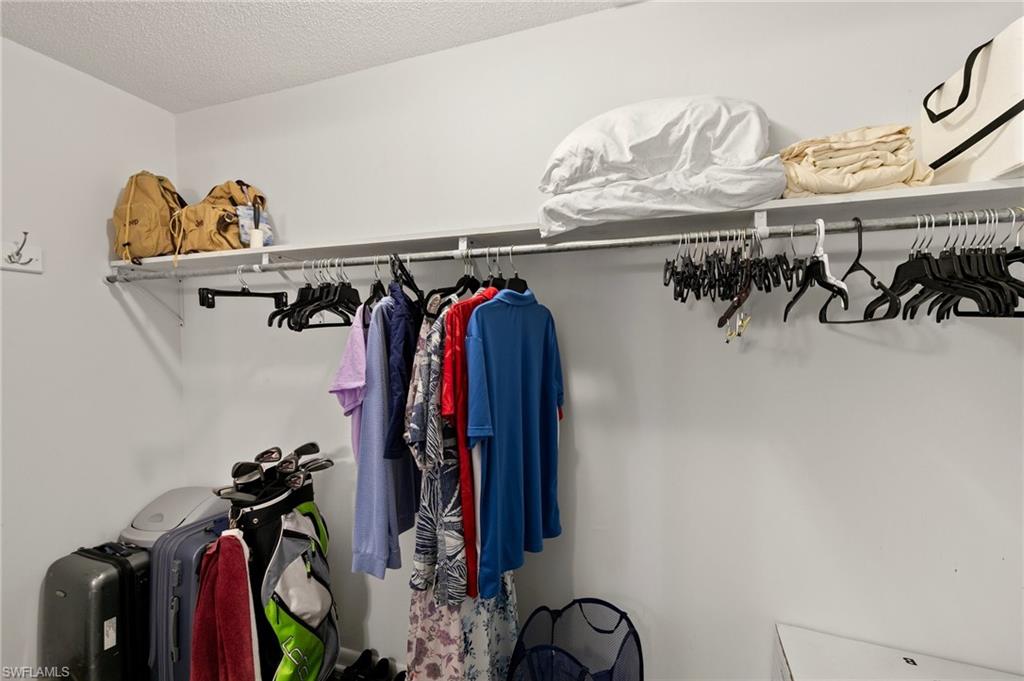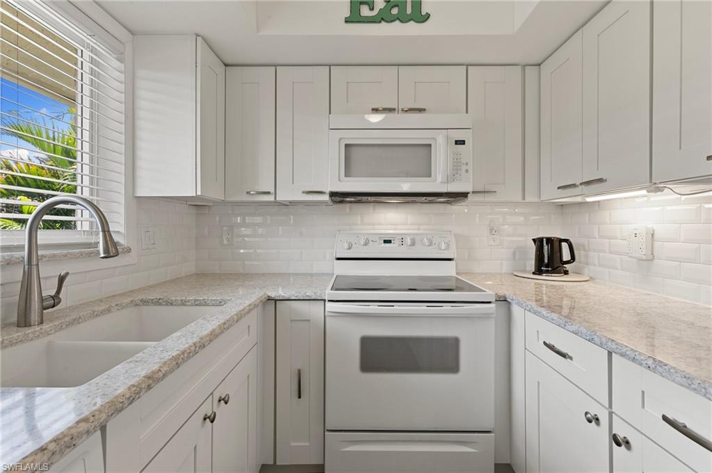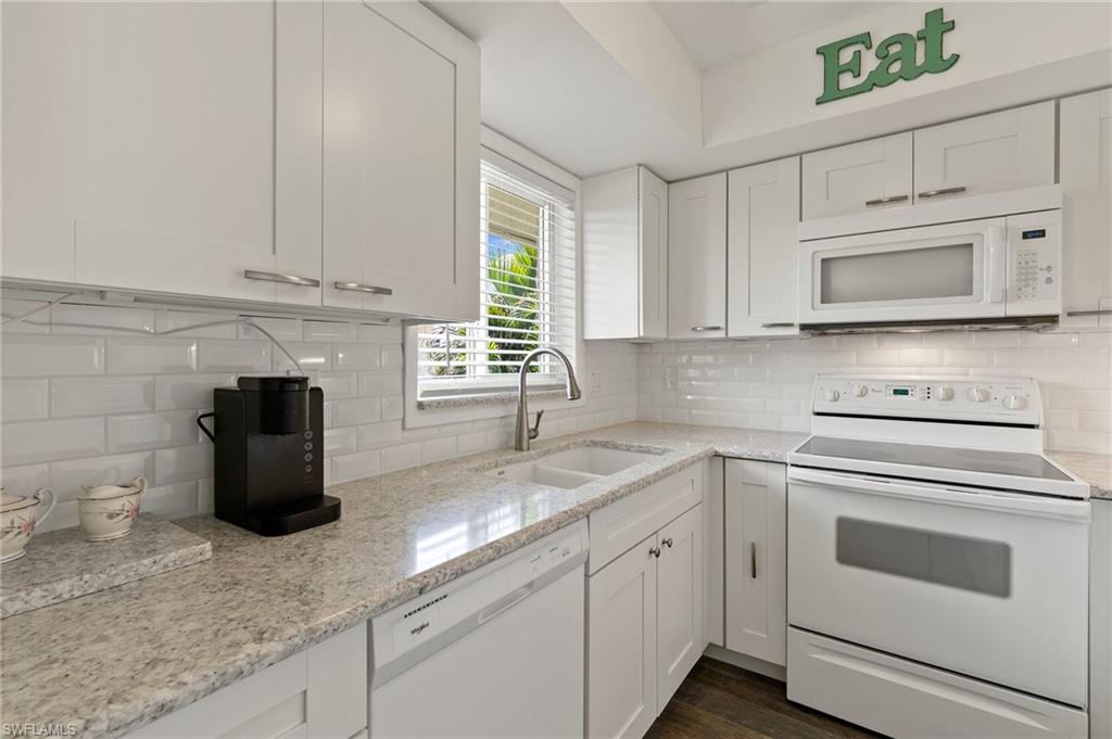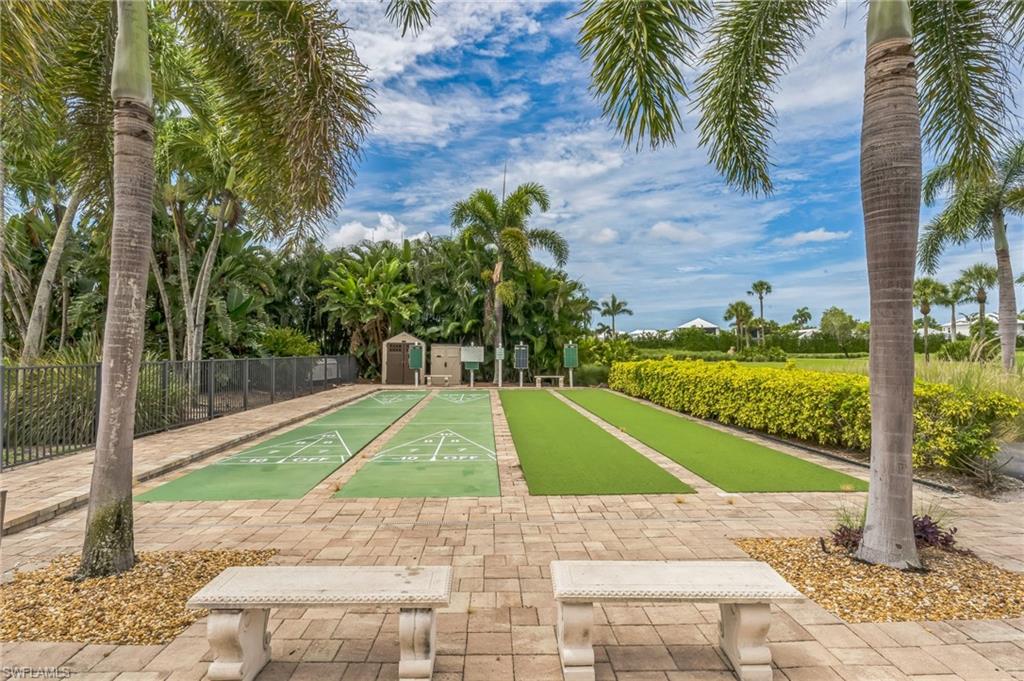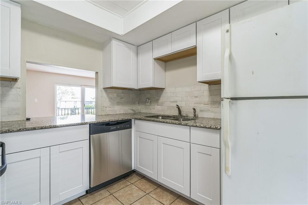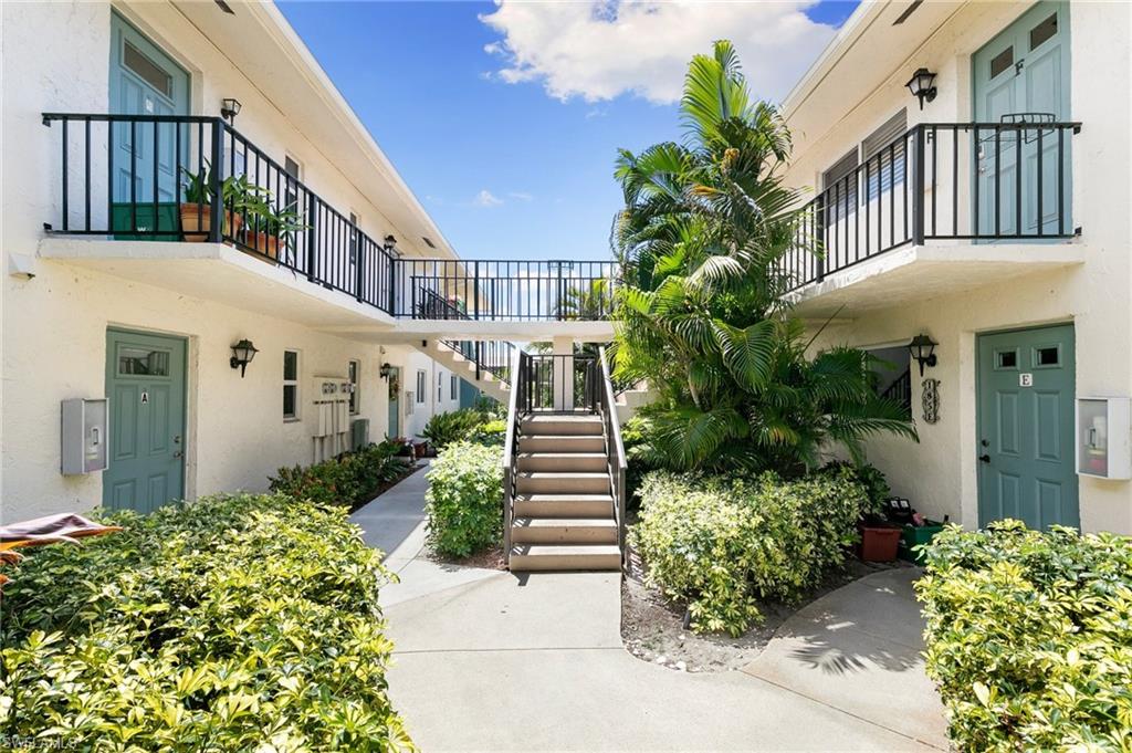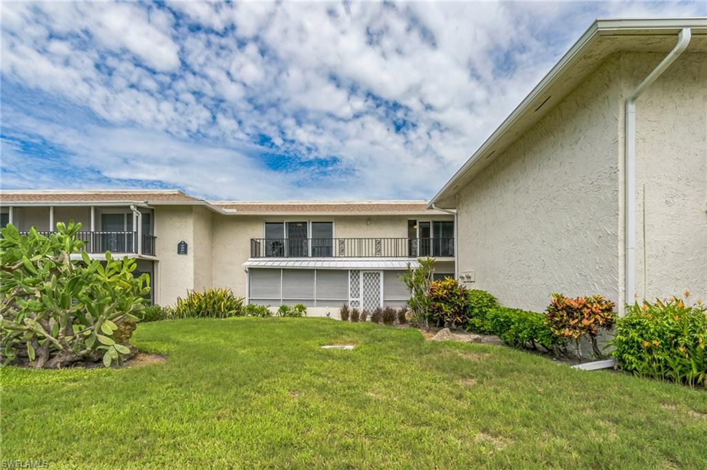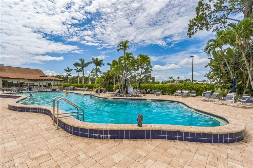 Looking for bundled golf and new pickleball courts in an affordable community? Look no more! This well kept first floor condo features an updated kitchen with stainless steel appliances, recessed lighting, newer cabinetry and countertops. In both bathrooms the vanities, countertops, and lighting have been updated, along with a custom tiled walk-in shower in the Master BA. There’s laminate/diagonal tile flooring and impact windows/sliders throughout. The A/C is newer (compressor 2022, air handler, 2024) and the roof is still in the first half of its lifespan (2018). The Master BR features two closets, the kitchen has a pantry, and there is an extra storage locker out back, so there’s ample storage space. The view from the lanai is lush banana and mango trees. This community has it all: two 18 hole golf courses; six new Har-Tru clay tennis courts; twelve new pickleball courts, nine heated swimming pools, and a clubhouse with dining, events, dancing, and other fun activities. The condo fee includes the water, cable, and internet. To top it off, you are just a 10 minute drive to downtown Naples, the white sandy beaches, fine dining, and amazing shopping. Grab your own piece of paradise now.
