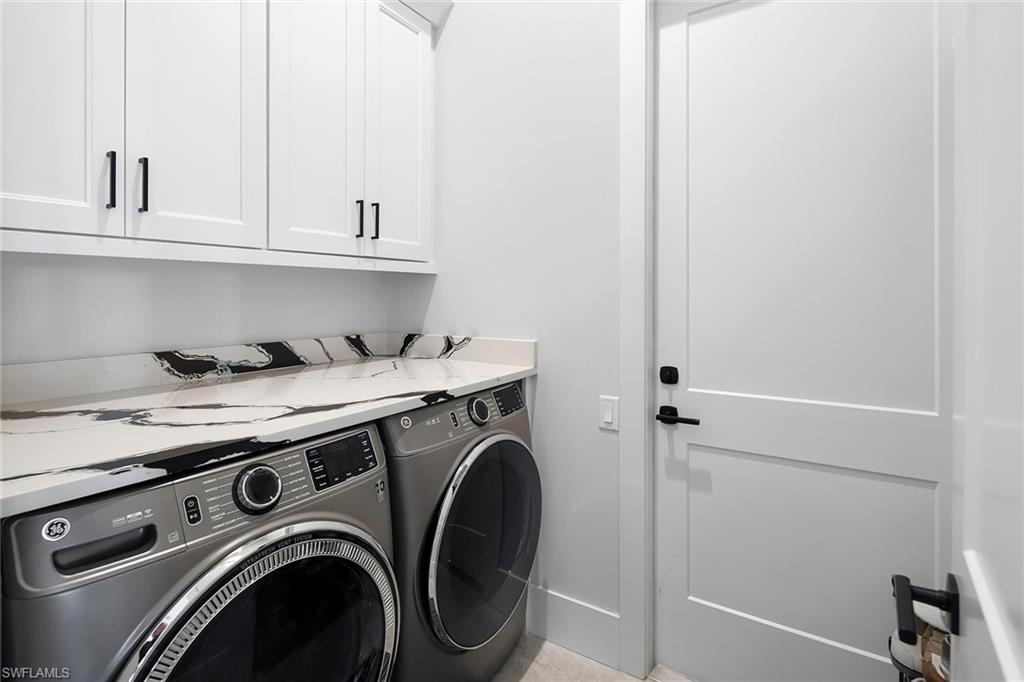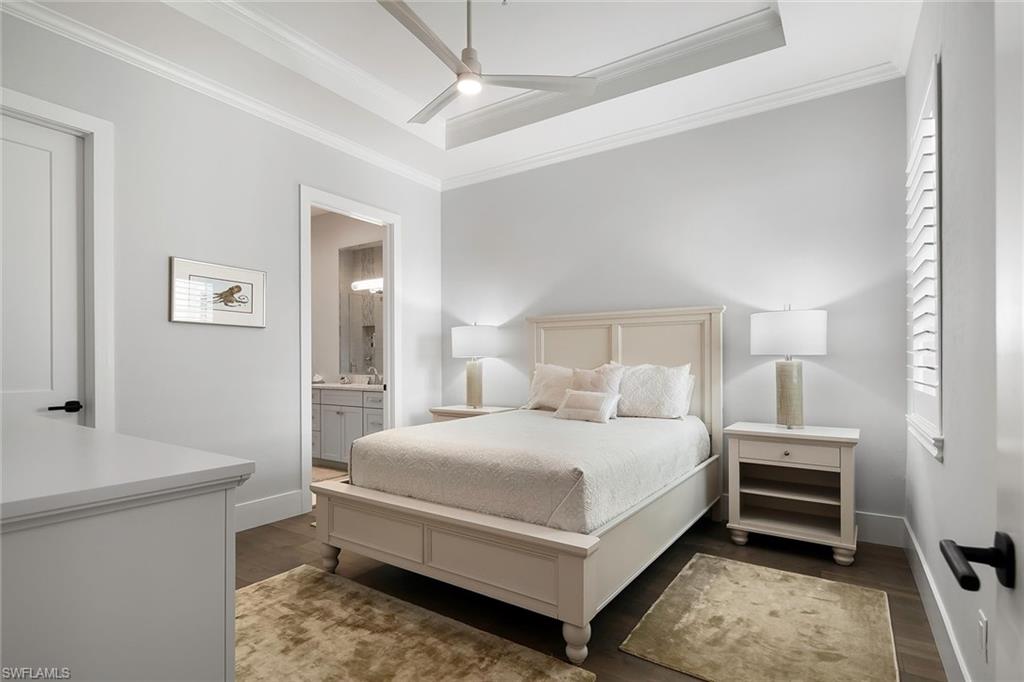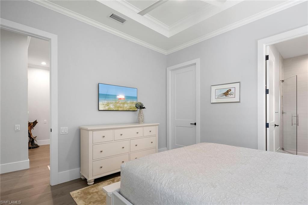 Experience coastal luxury at its finest in this impeccably crafted, southern-exposure waterfront masterpiece, built to the newest 10-foot base flood elevation. On a deep-water canal with direct Gulf access, this new residence pairs exceptional construction quality with an unbeatable Naples location, near Naples Bay Resort, Bayfront, Tin City and world-renowned 5th Avenue South. Naples iconic white sand beaches are only minutes away, offering the ultimate blend of convenience, lifestyle and waterfront living. Designed for modern living and effortless entertaining, this home features five bedrooms plus a den, 5.5 baths, a two-car tall garage with the ability to add lifts for four-car capacity, and 3,482 square feet of refined interior space. Designer-selected finishes and meticulous craftsmanship elevate every corner of the home. A custom tall mahogany front door opens to 12-foot ceilings, architectural ceiling treatments and European wide-plank oak floors that frame expansive water views. The great room showcases a dramatic cathedral ceiling, custom built-ins and a vapor fireplace wrapped in full marble. The chef-inspired kitchen centers around an oversized island with Taj Mahal quartzite countertops and is equipped with premier panel-ready appliances, including a 48-inch Wolf Dual Fuel Range, Sub-Zero Designer Column refrigerator/freezer, Cove dishwasher and Sub-Zero 24-inch wine and beverage coolers. The primary suite offers a serene waterfront retreat with dual custom wardrobe closets and a spa-like bath featuring natural stone finishes, a soaking tub and an oversized multi-head shower. Each guest suite includes its beautifully curated en-suite bath with custom cabinetry and natural stone selections. Seamless indoor-outdoor living is achieved through nearly 800 square feet of covered outdoor space, complete with a summer kitchen, fireplace and panoramic water views, ideal for year-round alfresco living. The expansive pool deck includes over 1,200 square feet of space with a heated lap pool and spa, natural stone waterline tile, dual waterfalls and shell stone pavers. State-of-the-art technology enhances the entire home, featuring a Lutron automation system and wiring for security and motorized shades. The outdoor living area is fully protected by remote-controlled drop-down screens and storm shutters, and whole-house generator, ensuring comfort and peace of mind. Every inch of this newly built residence has been thoughtfully designed for luxury, comfort and sophistication. Scheduled for completion in January 2026, this home presents a rare opportunity to own a new, designer-finished waterfront property in one of Naples desired locations.