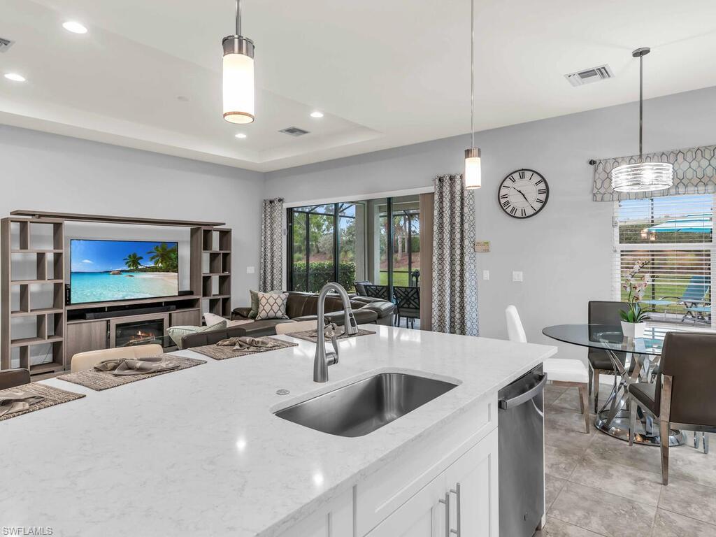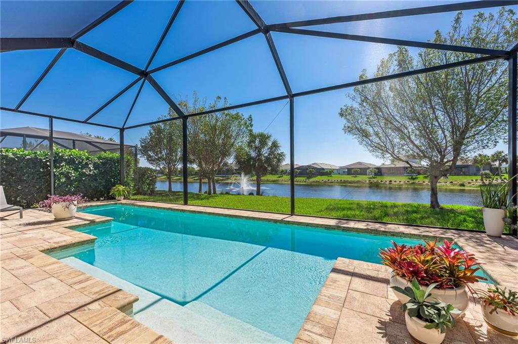 Are you seeking a private lakefront retreat with tranquil views and lush tropical surroundings? This beautifully designed single-family pool home offers an unmatched blend of serenity, sophistication and modern comfort. Framed by swaying palm trees and pristine landscaping, this residence invites you to experience resort-style living with breathtaking lake views, expansive outdoor spaces and luxury finishes throughout. Step inside through elegant French doors into a welcoming foyer with tray ceilings and two spacious closets. The thoughtfully designed split floor plan offers two bedrooms, a den, two full baths, a powder room and a two-car garage, creating a seamless flow of indoor and outdoor living. The main living areas feature diagonal tile flooring, crown molding, recessed lighting and arched walkways, adding a touch of architectural elegance. The chef’s kitchen is stylish and functional, featuring shaker-style cabinetry, granite countertops, a glass tile backsplash, under-cabinet lighting and a walk-in pantry with custom shelving. A bar counter with pendant lighting provides the ideal space for casual dining, while stainless steel appliances, including a gas range, microwave, built-in Fisher & Paykel smart double dish drawer dishwasher, and a refrigerator with icemaker, ensure top-tier performance. The formal dining area and spacious living room are bathed in natural light, with multiple glass sliders opening to the lanai, showcasing stunning views of the heated pool and lake. The owner’s suite is a peaceful haven, featuring bay windows with picturesque lake views, two walk-in closets and a linen closet. The spa-inspired en-suite bath includes dual-sink vanity with a full-width mirror, a makeup counter, and a walk-in shower with a built-in bench and glass enclosure. The guest bedroom, in a private wing, is conveniently near a full bath with a shower-tub combination and tiled surround. A versatile den with French door entry and a tray ceiling offers the flexibility to serve as a home office, library or additional guest space. The laundry room is well-appointed with ample cabinet storage, a utility sink with granite counters, and Whirlpool front-load washer and dryer. A powder bath with a pocket door is conveniently off the hallway. Step outside to an expansive covered lanai, where a picture screen enclosure frames the peaceful lake views. The outdoor kitchen is a standout feature, complete with a stainless steel barbecue grill, sink, mini refrigerator and a striking mosaic tile backsplash extending to the ceiling. The heated pool invites year-round relaxation, and electrical and manual screen shutters provide security and peace of mind. In Esplanade at Hacienda Lakes, this home offers resort-style amenities, a staffed clubhouse, and easy access to beaches, golf, Waterside Shops, Mercato and Naples' top dining, with access to Interstate 75. schedule your private showing today.