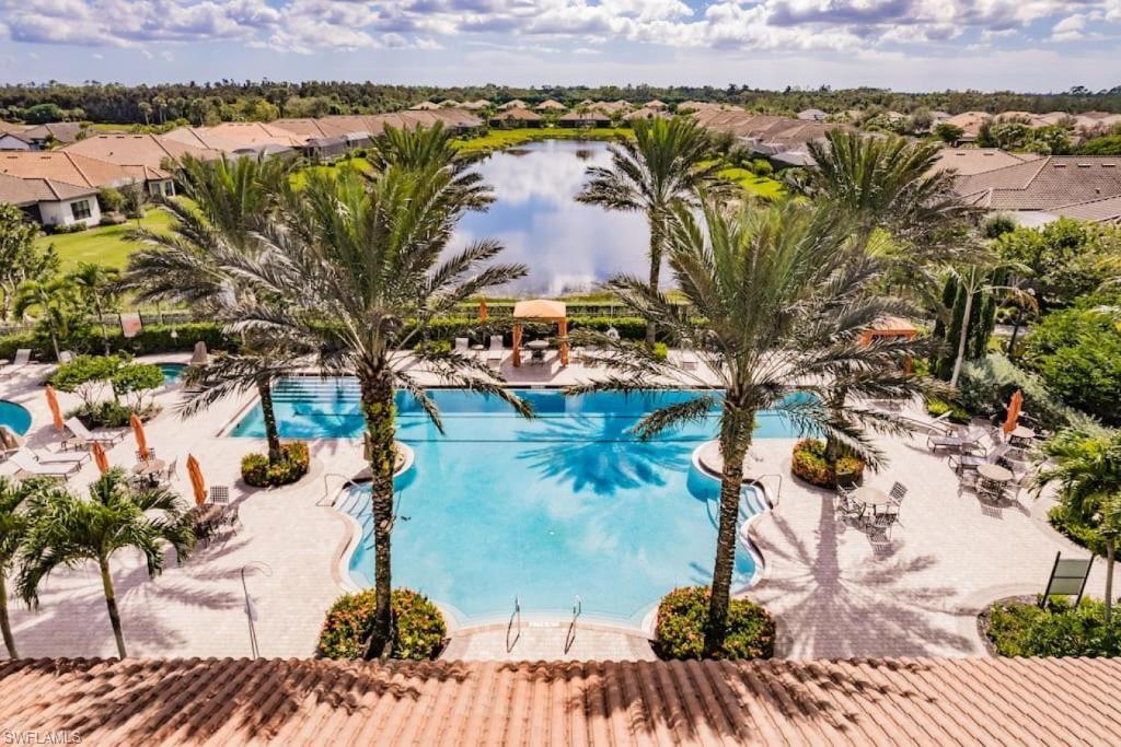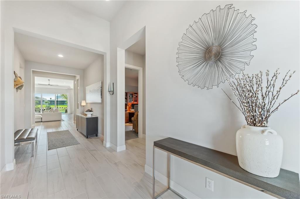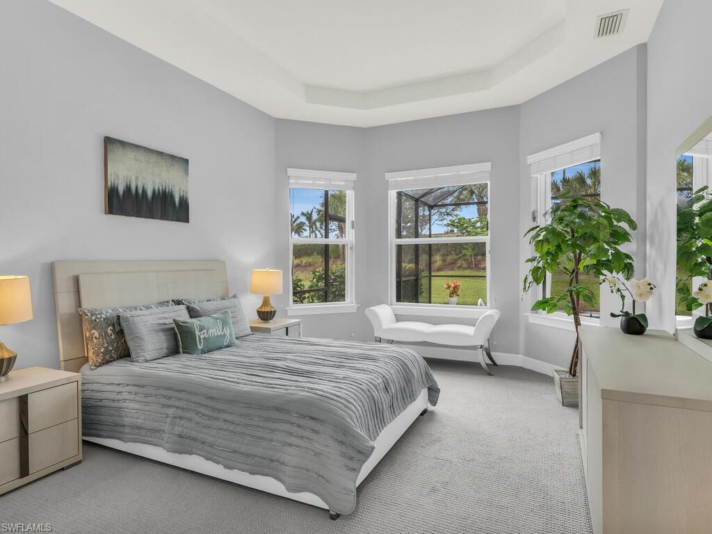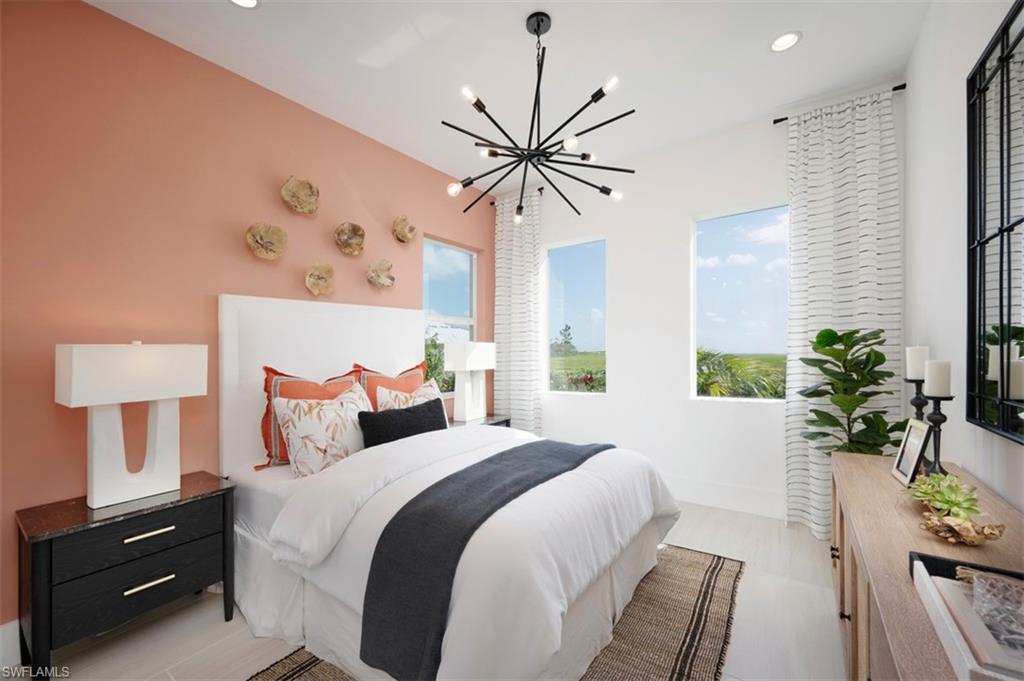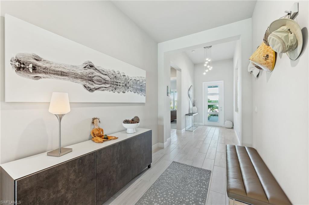 Immaculate newer construction Baypointe model home, featuring unobstructed wide-water lake views and ideally in one of Naples sought-after guard-gated communities. In the prestigious Azure enclave, this luxurious single-story home boasts two oversized en-suite bedrooms, an office or den/flex space, two full baths and nearly 1,600 square feet of air-conditioned living space. Detail in design and construction is evident in every corner, creating an atmosphere of sheer sophistication. Other features include hurricane-impact windows and doors throughout, large volume and tray ceilings, a chef’s kitchen with natural gas cooktop, a beautiful entry patio with brick paver driveway and two-car garage, wide-plank tile flooring throughout, an expansive screened lanai with panoramic water views and the ability to purchase fully furnished/turnkey for effortless and immediate enjoyment. Residents of Azure at Hacienda Lakes also have access to a beautifully designed clubhouse, resort-style heated pool and spa, tennis and pickleball courts, private library, billiards room, world-class fitness center, expansive yoga studio and more. An incredible opportunity that will not last long.