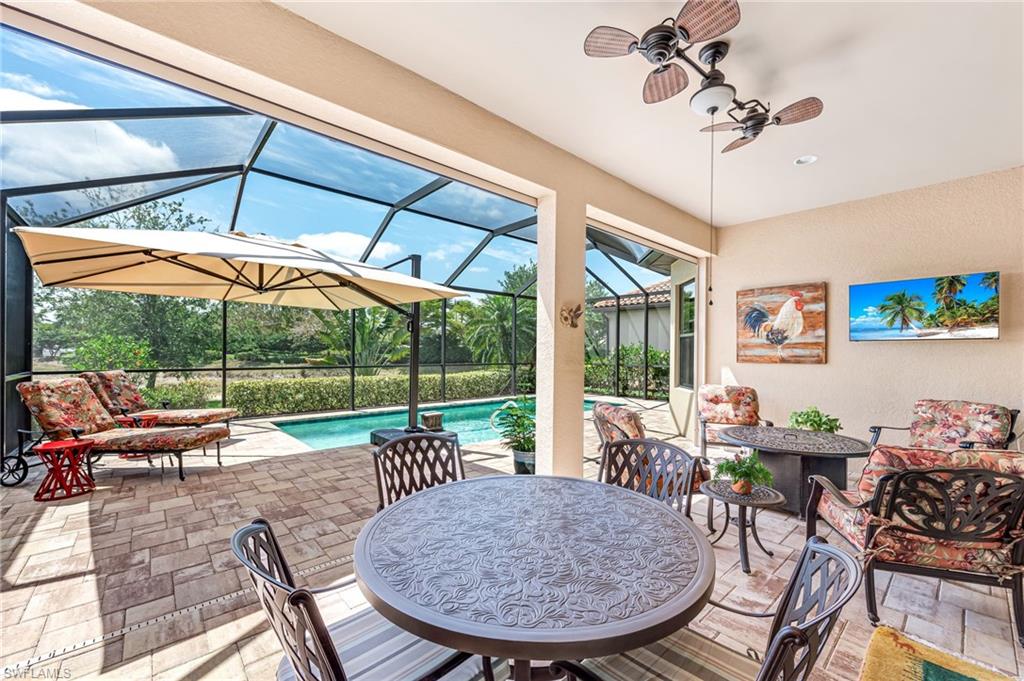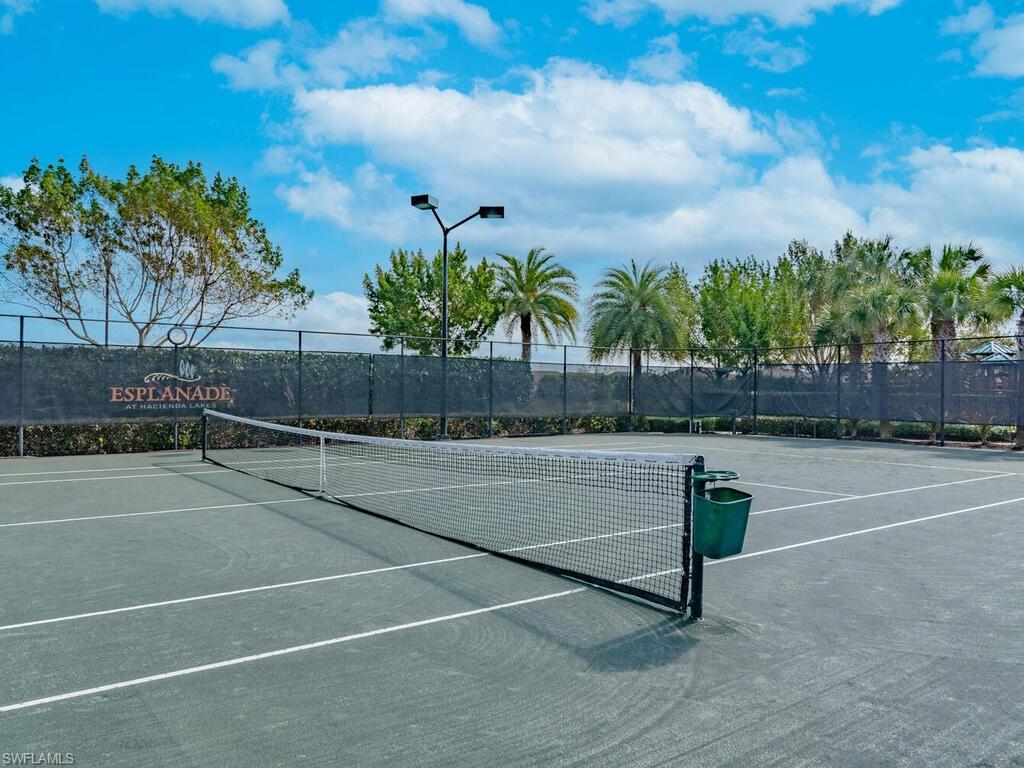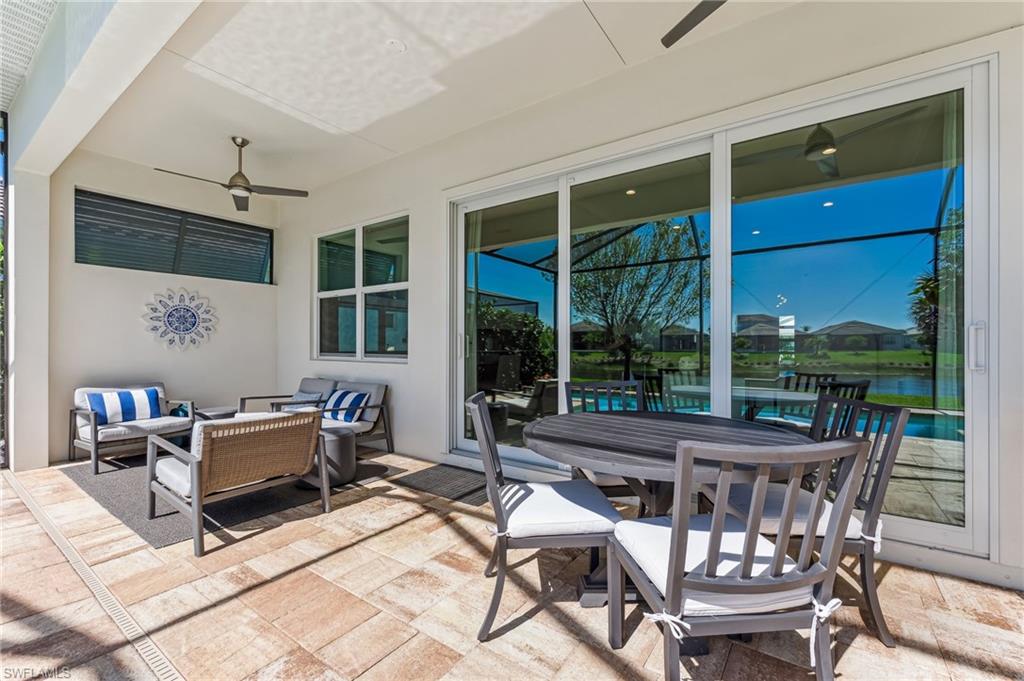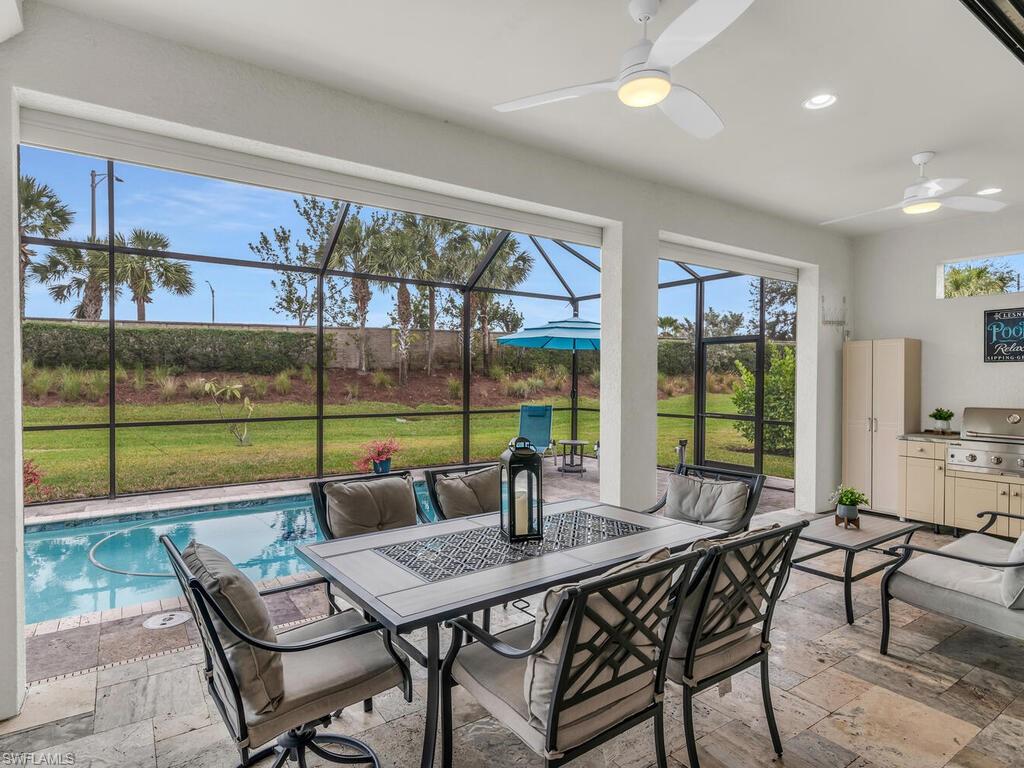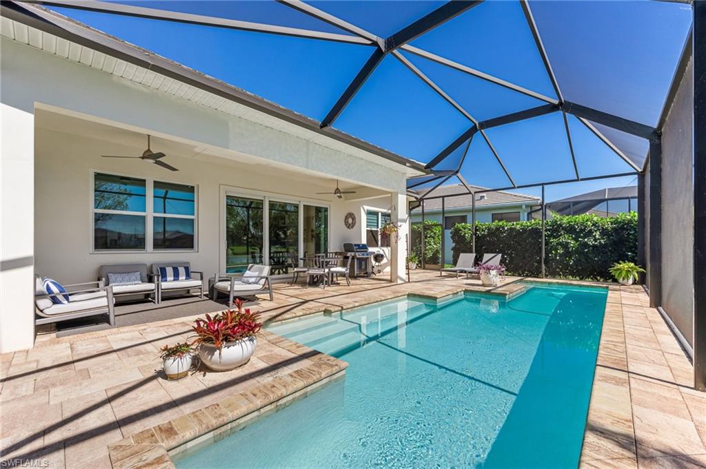 Move-in ready beautiful 2 Bed Plus Den, 2 Full Baths, 2 car garage with Furnishings Negotiable! Steps from the Clubhouse! The large outdoor extended lanai area includes an outdoor kitchen for entertaining, saltwater gas heated pool and a south eastern water view with added lush landscaping! Open great room and gourmet kitchen with quartz tops and wine cooler with natural gas cooking. The large primary suite has two walk-in closets and a large bathroom with glass shower and dual sinks. The guest bedroom is set apart from the primary suite for privacy. Large laundry room with laundry sink and plenty of cabinetry. Impact doors and windows and storm smart shutters! Tile on the diagonal throughout, tray ceilings and crown molding, tankless water heater, whole home surge protection and an electric car plug in. Esplanade at Hacienda Lakes resort style community with low HOA fees and close proximity to Marco Island and Downtown Naples beaches, dining and shopping. The clubhouse includes a lifestyle director with a fitness center, tennis and pickleball courts, pool and hot tub, gathering social room with catering kitchen and a dog park.