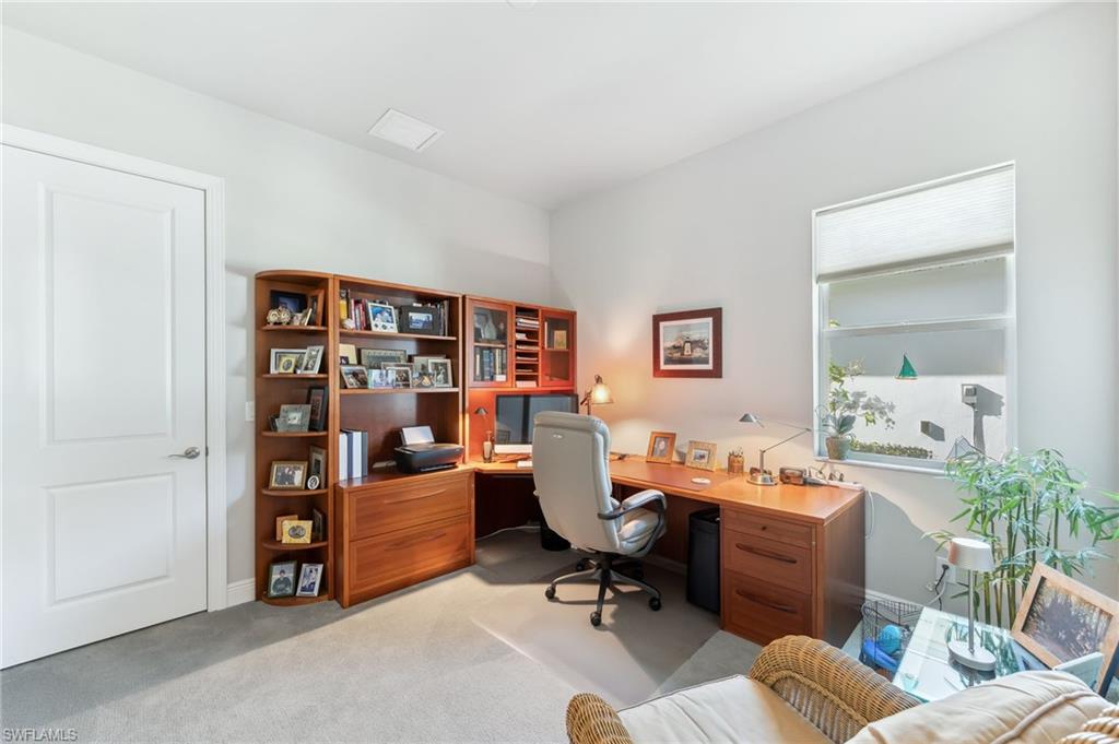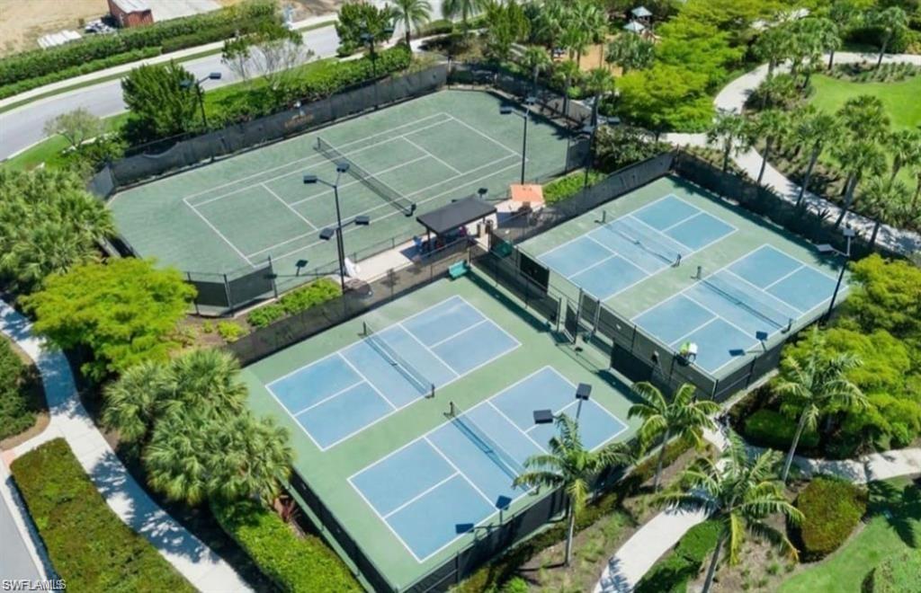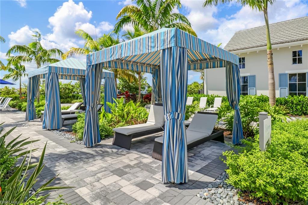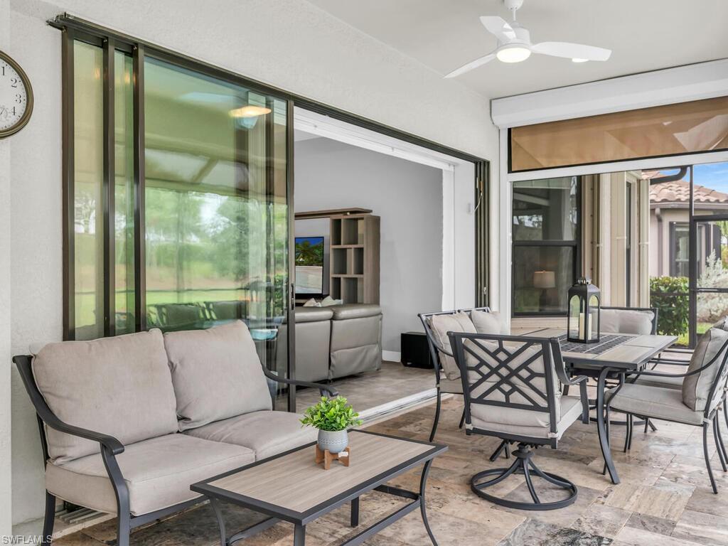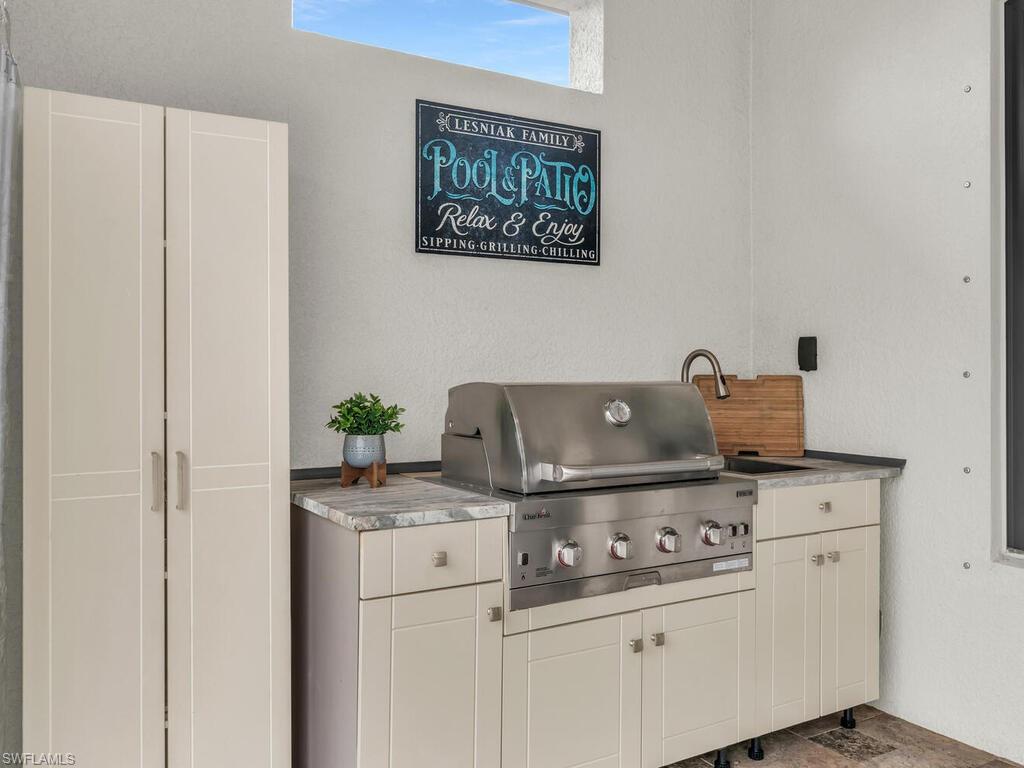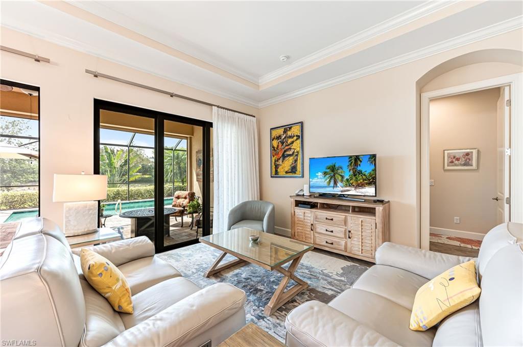 Move-in ready beautiful 2 Bed Plus Den, 2 Full Baths, 2 car garage with Furnishings Negotiable! Steps from the Clubhouse! The large outdoor extended lanai area includes an outdoor kitchen for entertaining, saltwater gas heated pool and a south eastern water view with added lush landscaping! Open great room and gourmet kitchen with quartz tops and wine cooler with natural gas cooking. The large primary suite has two walk-in closets and a large bathroom with glass shower and dual sinks. The guest bedroom is set apart from the primary suite for privacy. Large laundry room with laundry sink and plenty of cabinetry. Impact doors and windows and storm smart shutters! Tile on the diagonal throughout, tray ceilings and crown molding, tankless water heater, whole home surge protection and an electric car plug in. Esplanade at Hacienda Lakes resort style community with low HOA fees and close proximity to Marco Island and Downtown Naples beaches, dining and shopping. The clubhouse includes a lifestyle director with a fitness center, tennis and pickleball courts, pool and hot tub, gathering social room with catering kitchen and a dog park.