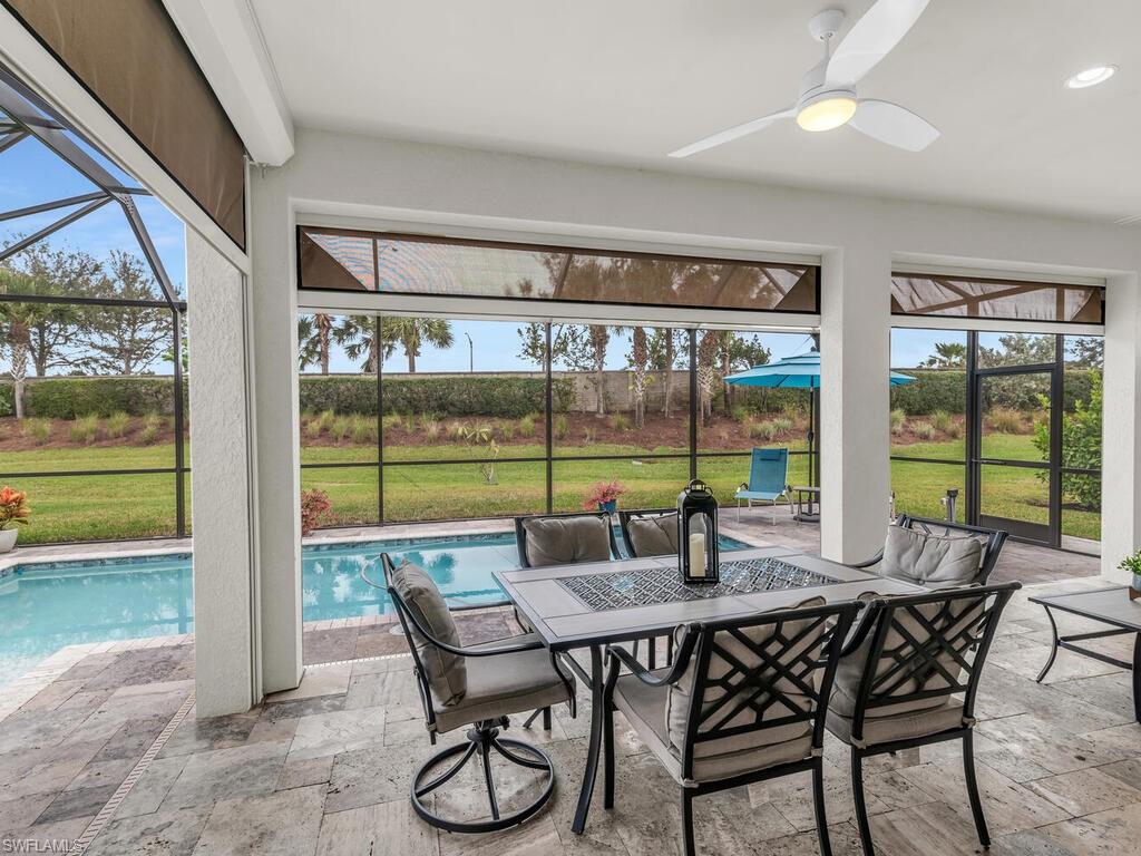 NEW DREAM PRICE to welcome you home to this stunning Farnese model 2 BR + Den that has plenty of room for a 3rd Bedroom! This FURNISHED pool home, with WHOLE HOUSE 22KW GENERAC GENERATOR is nestled on a larger, premium corner lot cul-de sac setting, in the popular Esplanade of Hacienda Lakes ~a NATURAL GAS community. This home really lives much LARGER with 2 versatile rooms for your choice of formal Dining, Den / Office, Music room, or easily convert to a 3rd BEDROOM. Step inside and be greeted by 10ft high ceilings, tile flooring and the spacious open-concept flow between Living room, Kitchen & Dining area that seamlessly blends indoor and outdoor living. Triple sliding doors open to the large screened in Lanai, protected by STORM SMART motorized shades, a custom gas grill summer kitchen and heated saltwater pool to enjoy outdoor living! Total privacy is offered between 2 large Bedrooms with FULL Bath ensuites, a Guest Powder Room and 2 additional large versatile rooms to meet your needs. The Chef's gourmet kitchen offers White 42" wood Shaker style cabinets, a 10ft quartz island, large walk in Pantry, gas range W/ convection & air fry cooking and instant hot water! The large Laundry Room includes a utility sink w/ washer & dryer. Esplanade residents enjoy their beautiful 6,500 sq ft Clubhouse with full catering kitchen, Social & Card room, Billiards, 24/7 full Fitness Gym, Resistance pool & Lap pool, Hot tub, Pickleball, Tennis & Bocce Courts, Play Park & Dog Parks. All this is located at the crossroads of Naples & Marco Island with pristine beaches and famous Naples 5th Ave. Our SOCIAL EVENTS ARE AMAZING! Come be my neighbor and love living here too! *NO FLOOD INSURANCE NEEDED AND VERY LOW HOA FEES* Be sure to Watch the Tour!