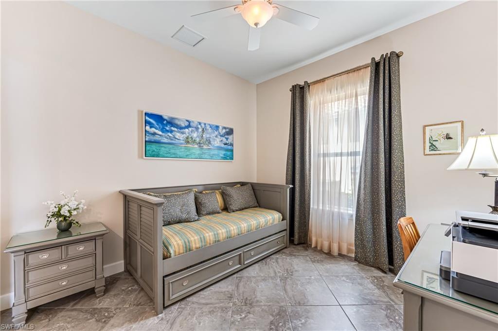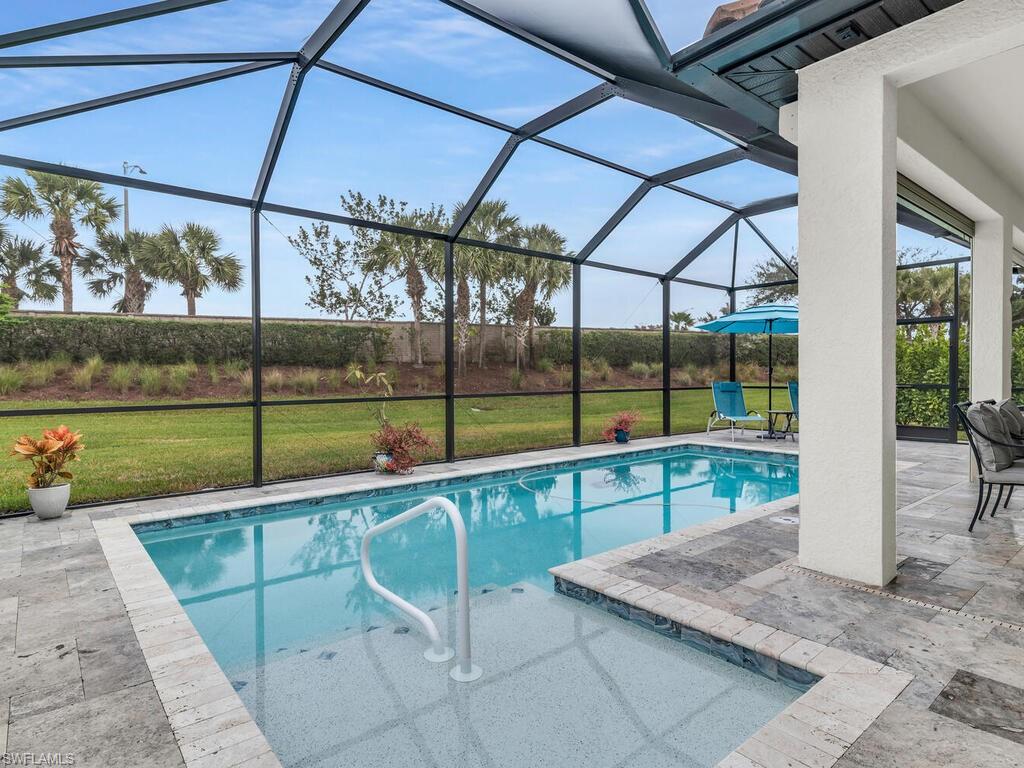 Location meets coastal chic style in this fabulous 2 bedroom plus den with upgraded, rare, pool and spa Baypointe model. With almost 1600 sq feet of exceptional living space, this light-filled residence features an extended living area that opens up to the gorgeous leathered-light marble pavers against the custom midnight pool. Immerse yourself in the refreshing, tranquil waters of the pool and spa while operating it all from your pool controls. Gather in your screened-in lanai taking in the views of the pool and tropical, lush landscaping with a SW exposure. Enjoy the open concept living space with custom kitchen cabinets featuring sleek hardware surrounding a large island covered in a marbled quartz lit up by two oversized pendants. The stainless steel hood over the gas cooktop is adorned by two decorative glass cabinets to display your finest dishes. The oversized, glossy subway tile is further enhanced by the under cabinet lighting while the large double-door pantry boasts ample space for all of your storage needs. Guests will delight in the open concept dining area adjacent to the living area which features a tray ceiling and glass sliders that open to the outdoor oasis. Escape to the separate owners retreat where plantation shutters are carried throughout and another tray and recessed lighting highlights the tall ceilings. The master bathroom boasts two sinks, with custom mirrors and lighting, a shower featuring large subway tile that extends to the ceiling and an expansive closet. The second bedroom is perfect for guests as it is comfortably located across from the den. The den features more living space and another room for all of your out-of-town visitors. The two car attached garage off the main entryway is conveniently located near the laundry room. The custom lighting displays the beauty of this stunning property at night. Azure is a private, gated, enclave of single family residences just minutes to Marco Island, downtown Naples, and the fabulous white, sandy, beaches of the Gulf of Mexico. Residents can enjoy the beautifully crafted clubhouse featuring a resort pool and spa, fitness center, tennis & pickleball courts, yoga studio, billiards room, and catering kitchen. Come discover the beauty of Azure at Hacienda Lakes today.