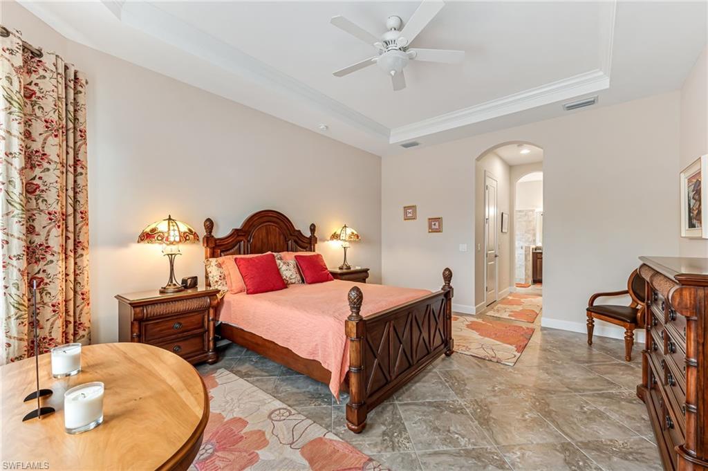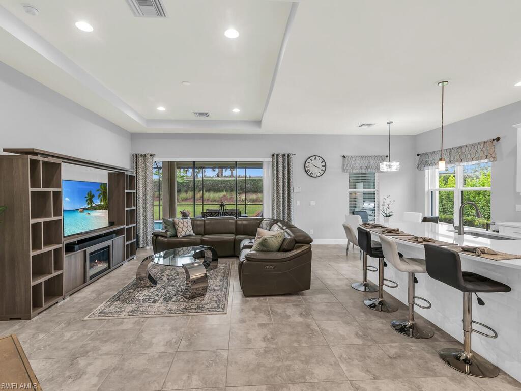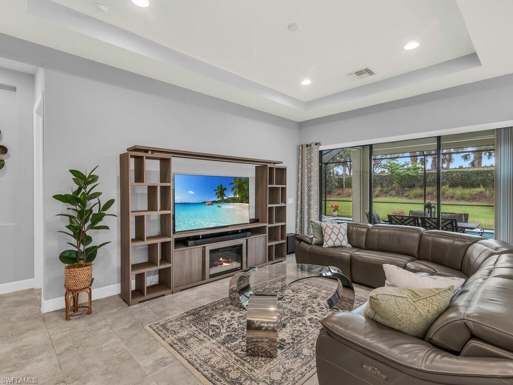 A stunning lakefront home in the sought-after Esplanade at Hacienda Lakes. This thoughtfully designed residence boasts a split floor plan with three bedrooms with den, 3.5 baths and a two-car garage. From the moment you arrive, the exterior charms with its tile roof, carriage-style garage door, paver driveway and walkway, and lush mature landscaping, complemented by front and rear lighting. Step through double glass doors into an inviting interior featuring recessed lighting, arched doorways and durable vinyl plank flooring throughout. The open-concept design seamlessly connects the dining and living areas, bathed in natural light from expansive glass sliders. The adjacent kitchen is a chef’s dream with stainless gas cooking appliances including a built-in wine cooler, wood cabinets, quartz countertops, tile backsplash, walk-in pantry and a three-seater breakfast counter. A casual dining area with a panoramic window offers breathtaking water views and flows effortlessly into the family room, complete with a coffered ceiling and direct lanai access. Step outside to an entertainer’s paradise. The extended lanai features paver flooring, an outdoor kitchen with granite countertops, a built-in natural gas grill with hood and an under-counter beverage cooler. Beyond, enjoy the sparkling pool with a spillover spa, a picture window screen enclosure and a cozy firepit area, framed by stunning sunrise views over the lake. The owner’s suite is a serene retreat with a tray ceiling, bay windows, a spacious walk-in closet, and a luxurious en-suite bath featuring an expansive dual-sink vanity and a passthrough walk-in shower. Both guest bedrooms offer wood-like tile flooring and their en-suite baths, providing comfort and privacy. Additional highlights include a new HVAC, a versatile den with French doors and a tray ceiling, as well as a standing refrigerator in the garage. As part of Esplanade at Hacienda Lakes, residents enjoy resort-style amenities, including a clubhouse, planned social events, a state-of-the-art fitness center, a resort-style pool and spa with a separate resistance pool for exercising, cabanas, a fire pit, illuminated tennis and pickleball courts, bocce ball, a dog park and a playground. Ideally near downtown Naples and pristine beaches of Marco Island, this home offers an unparalleled blend of luxury and the relaxed Florida lifestyle.