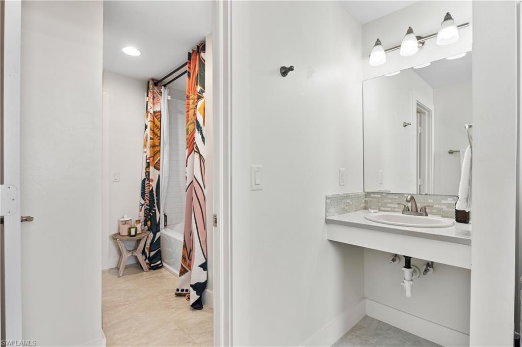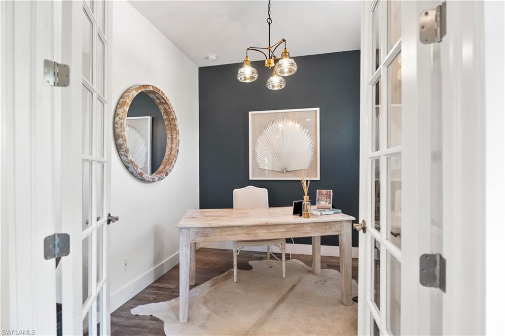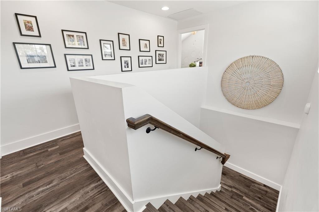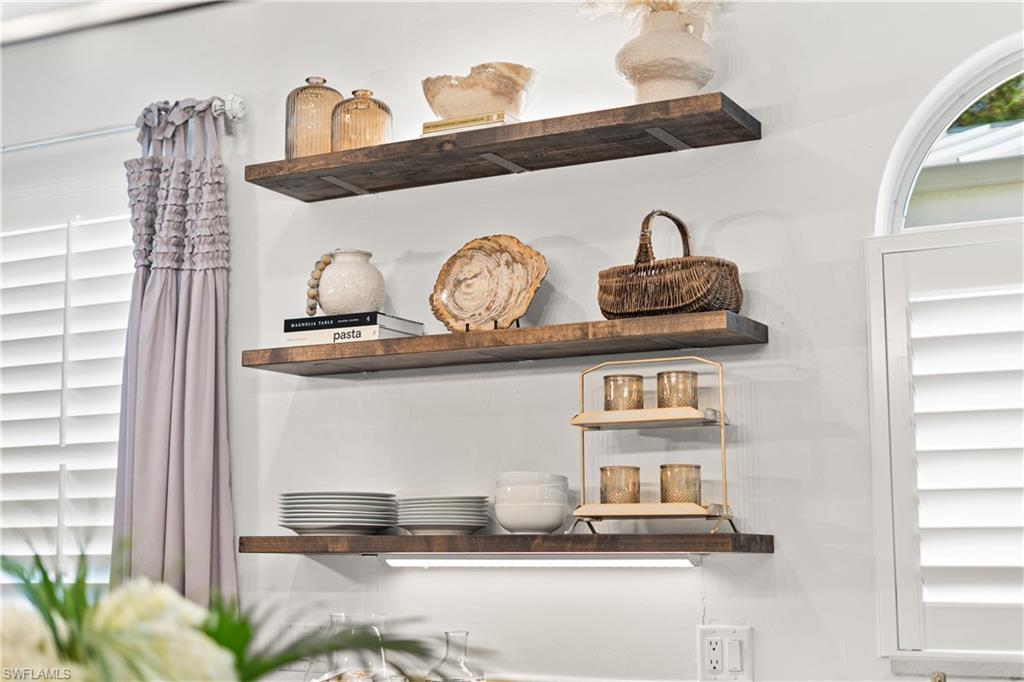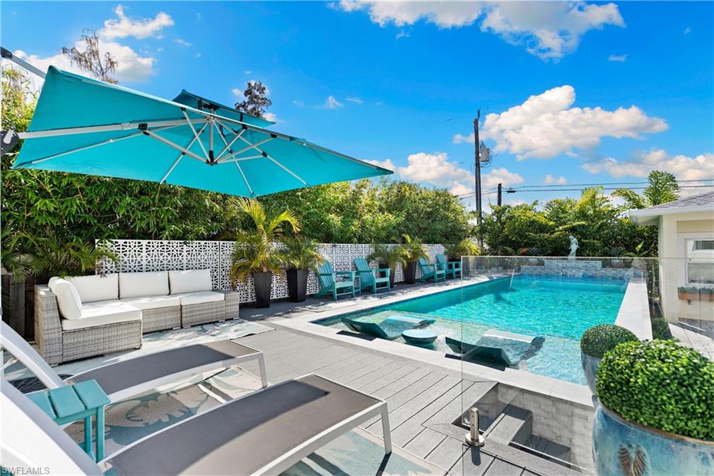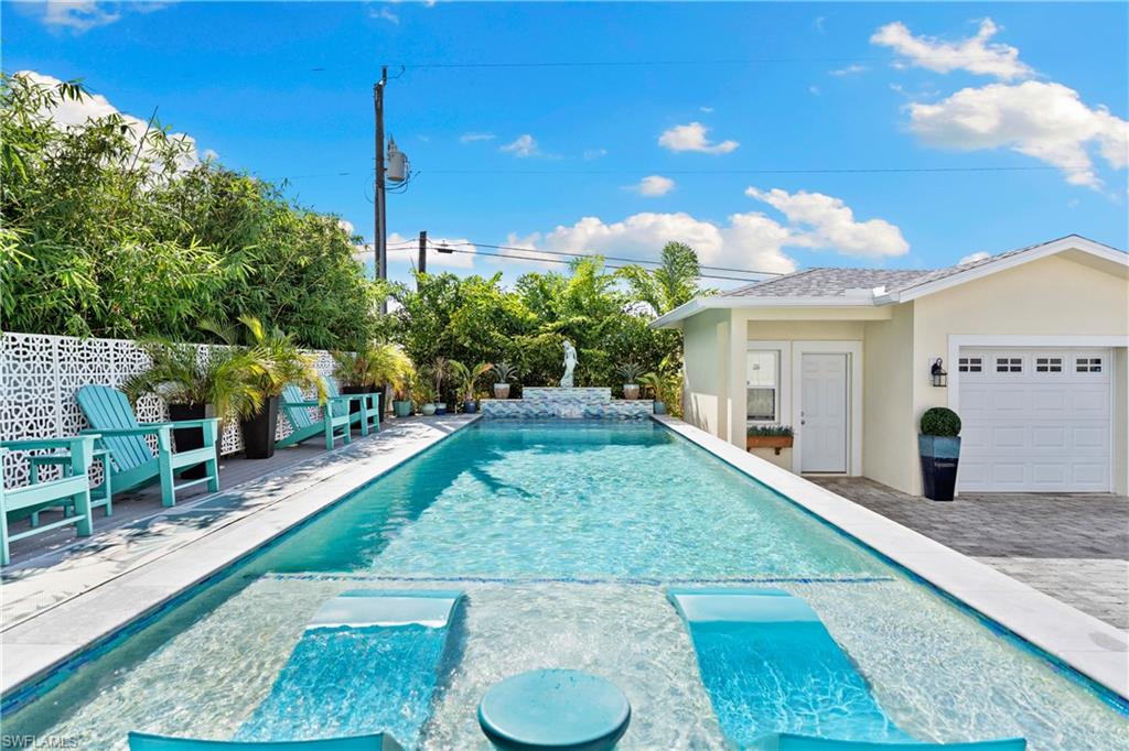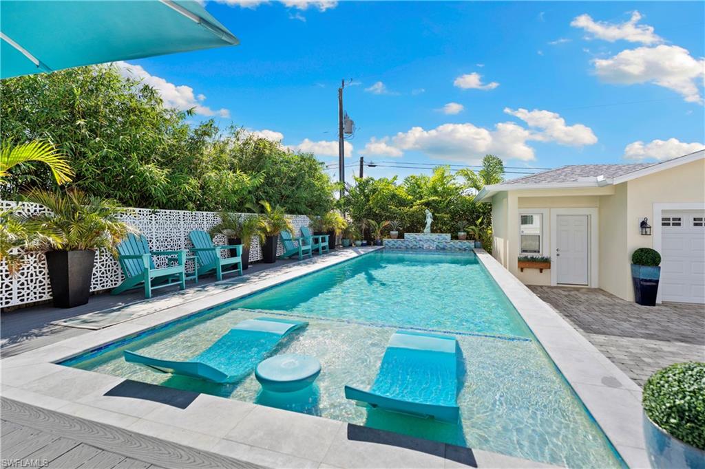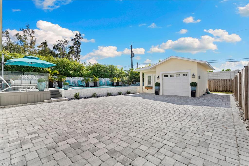 Experience timeless Olde Florida charm blended seamlessly with the refined coastal aesthetic of today in this beautifully curated cottage-style pool home. Situated on the desirable Woodside Avenue—just south of Thomasson and steps from Bayshore Drive—this property offers exceptional walkability to the Naples Botanical Gardens, making it a dream location for outdoor enthusiasts. A classic Southern-style front porch, complete with a charming porch swing and white picket fence, sets the tone for the warmth and character found inside. Thoughtfully designed landscaping enhances privacy while adding to the home’s inviting curb appeal. Inside, an open-concept layout creates effortless flow between the living room, dining area, and chef-inspired kitchen—perfect for entertaining or relaxing with family and friends. The main level features a serene primary suite, a versatile office or fourth bedroom, a stylish powder room, and a spacious walk-in laundry room with valuable storage beneath the staircase. Upstairs, a Jack-and-Jill bedroom configuration (with one room currently serving as a second office) provides generous closet and storage space. Luxury vinyl flooring spans the entire home, complemented by custom detailing on the staircase for both beauty and durability. The pool area is a true highlight—this custom-designed above-ground “walk-in” pool eliminates the need for stairs and offers immediate access to a sun shelf for effortless enjoyment. An impact-glass banister adds a touch of modern elegance, while Azek decking and lush, low-maintenance landscaping create a private, resort-style retreat. The saltwater pool features both heating and cooling systems for year-round comfort. The property’s outdoor layout has been carefully planned with functionality in mind, including a long brick-paved driveway that extends from the front to the rear of the home—ideal for additional secure parking, a boat, or a golf cart. A detached garage provides even more storage and flexibility. Beautifully maintained, thoughtfully upgraded, and ideally located, this coastal cottage offers the perfect blend of character, comfort, and contemporary luxury.